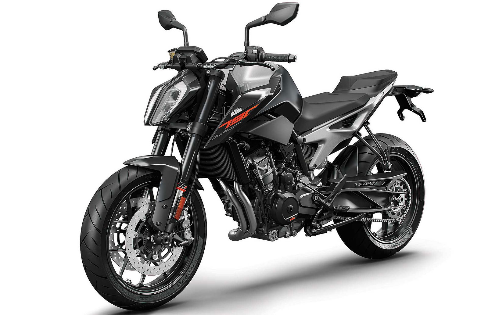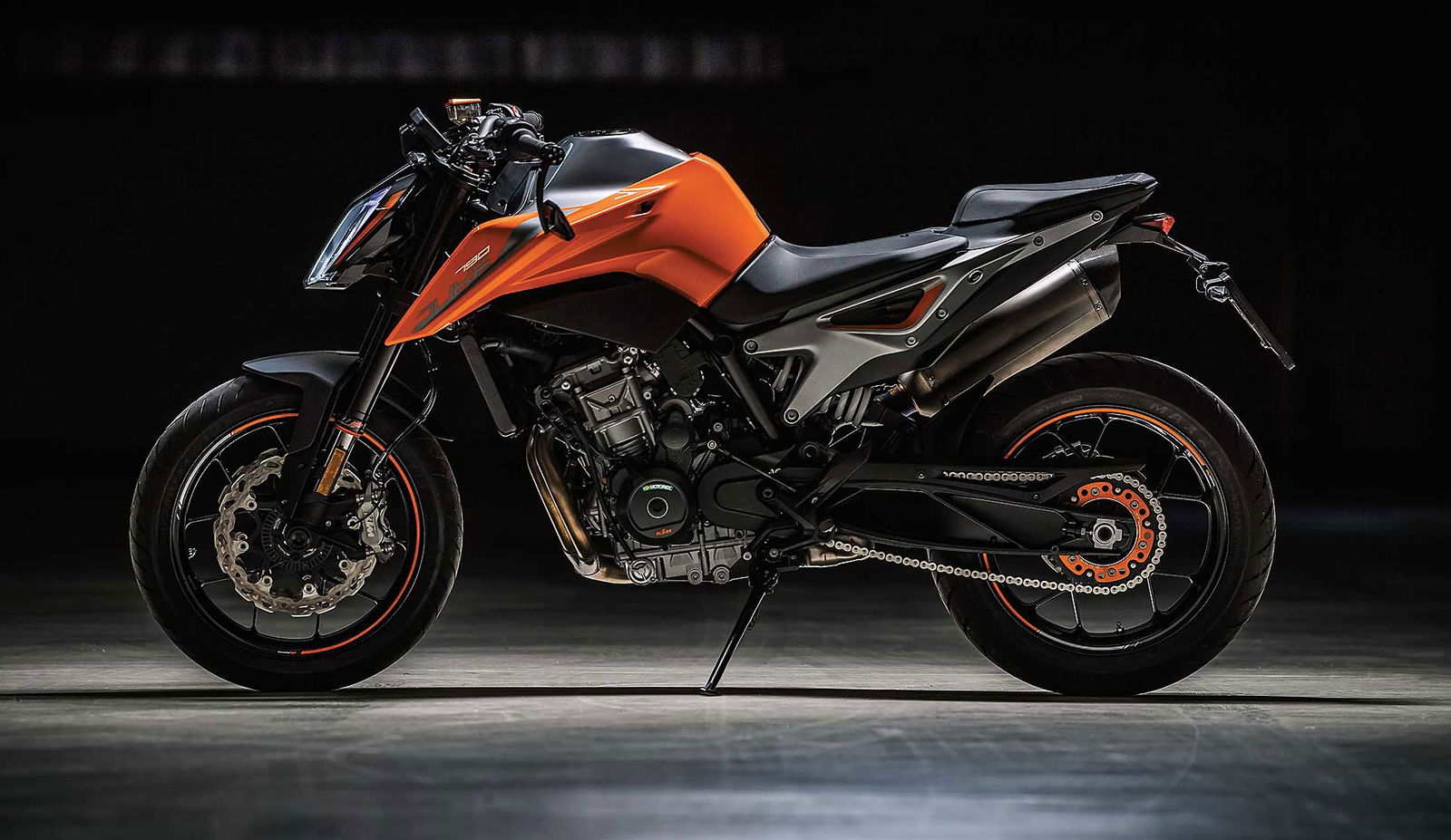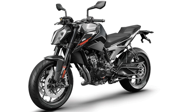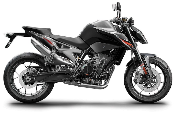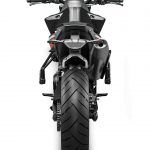 Tornando al motore, new entry che sicuramente sarà sfruttato su altri modelli, come ad esempio l’attesissima 790 Adventure, è l’ormai noto bicilindrico in linea fronte marcia da 799 cc. Le 4 valvole per cilindro sono attivate da bilancieri a dito, il motore adotta la lubrificazione a carter secco (un classico per KTM) ed è dotato di due contralberi di bilanciatura. Degne di nota le prestazioni dichiarate: 105 cavalli a 9.000 giri e 87 Nm di coppia massima a a 8.000 giri.Elettronica da grande