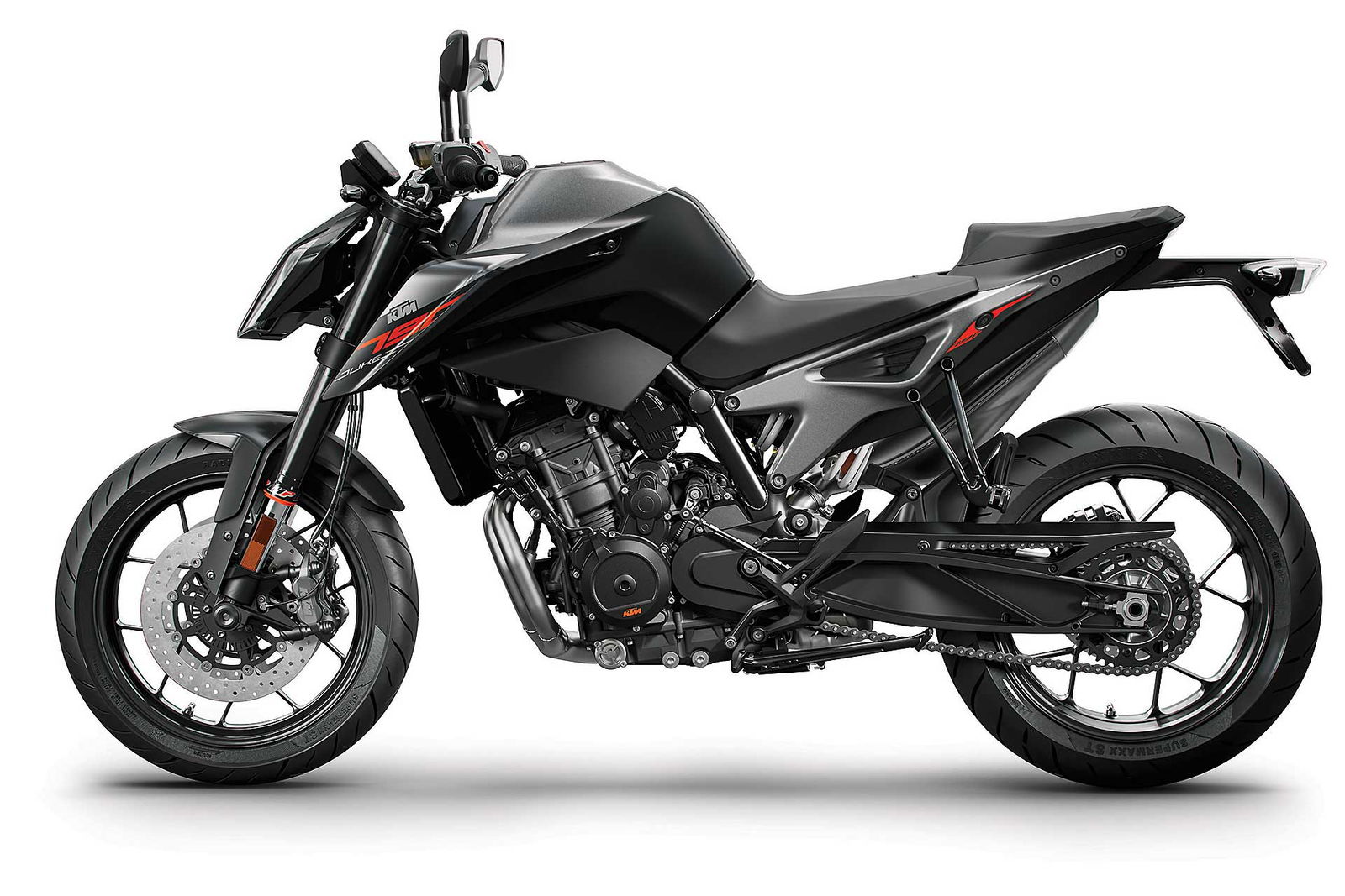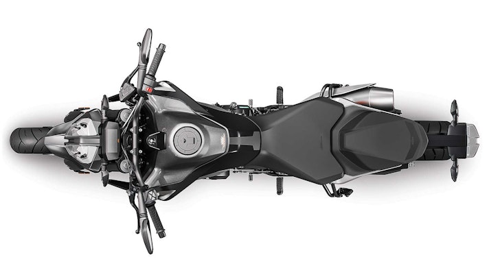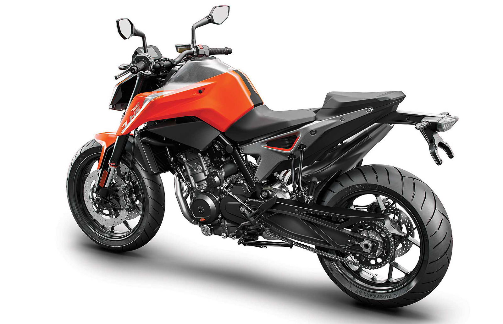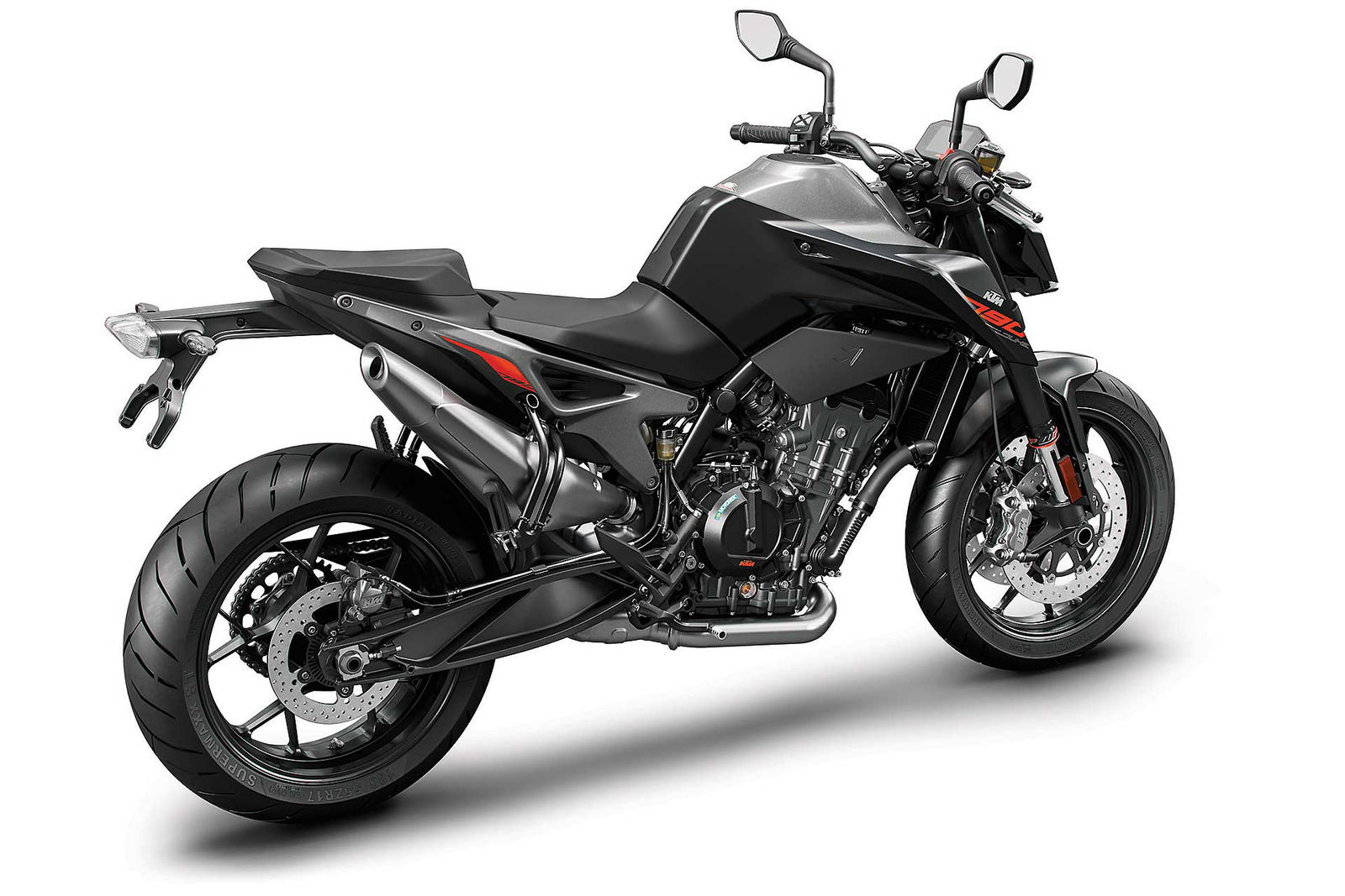 Tornando al motore, new entry che sicuramente sarà sfruttato su altri modelli, come ad esempio l’attesissima 790 Adventure, è l’ormai noto bicilindrico in linea fronte marcia da 799 cc. Le 4 valvole per cilindro sono attivate da bilancieri a dito, il motore adotta la lubrificazione a carter secco (un classico per KTM) ed è dotato di due contralberi di bilanciatura. Degne di nota le prestazioni dichiarate: 105 cavalli a 9.000 giri e 87 Nm di coppia massima a a 8.000 giri.Elettronica da grande