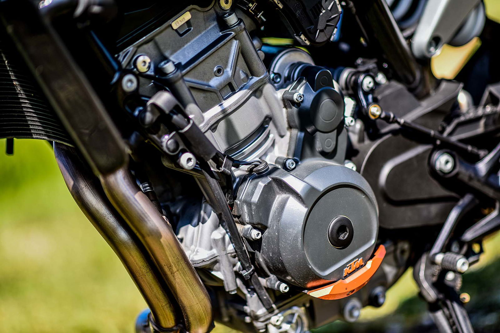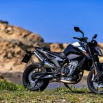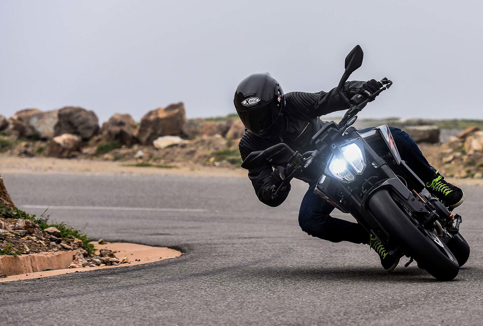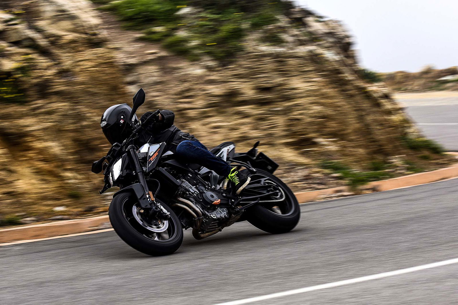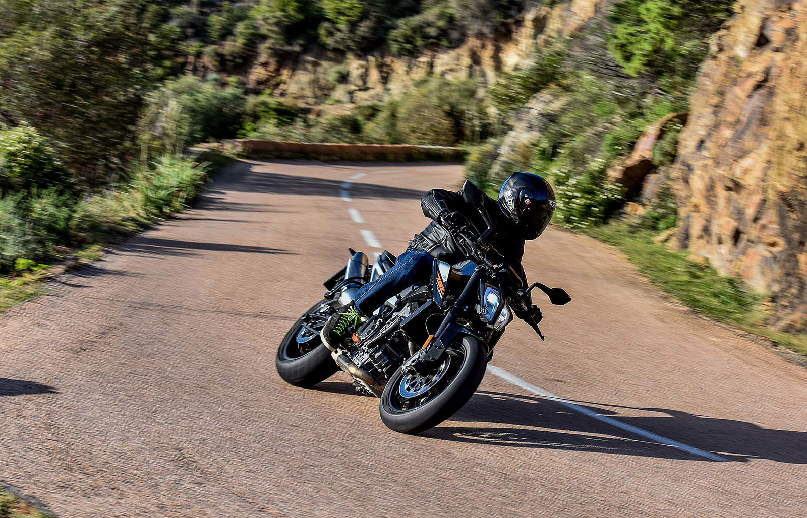 Gli amici davanti a me passano dalla mappatura “Scampagnata” a quella “Race” e decido di adeguarmi. La piccola Kappa non vedeva l’ora. Il motore ha un’erogazione esemplare, piena e corposa in qualunque marcia. È capace di vigorose riprese a bassi regimi come di allungare e scaricare cavalli fino al limite della zona rossa. Lo fa senza “murare”, lasciando al pilota la scelta di guidare sfruttando la coppia oppure spigolare e spremere il contagiri. Tutto è accompagnato da un cambio elettronico estremamente preciso, che talvolta accompagna la cambiata con un sonoro scoppiettio. Che gusto!Ad accompagnare il motore vigoroso c’è una ciclistica svelta e sincera. Il segreto della KTM 790 Duke è la leggerezza: impiega un amen a chiudere le traiettorie, fiondandosi come un fulmine al punto di corda, e trasmette sempre molta fiducia al pilota. Peccato per le sospensioni non regolabili: quando l’asfalto è corrugato lavorano con efficacia, ma nella guida arrembante su asfalto liscio si vorrebbe più sostegno. Quando si guida in modo realmente sportivo, il monoammortizzatore, che è infulcrato senza leveraggi al forcellone, fatica a tenere a bada l’esuberanza del motore, chiedendo così al pilota un minimo di riguardo con l’acceleratore. La frenata è eccellente: potente e molto modulabile, non va in crisi anche dopo parecchie staccate decise. I pneumatici Maxxis di serie non fanno rimpiangere coperture più blasonate, offrendo anzi grip e feeling al pilota.