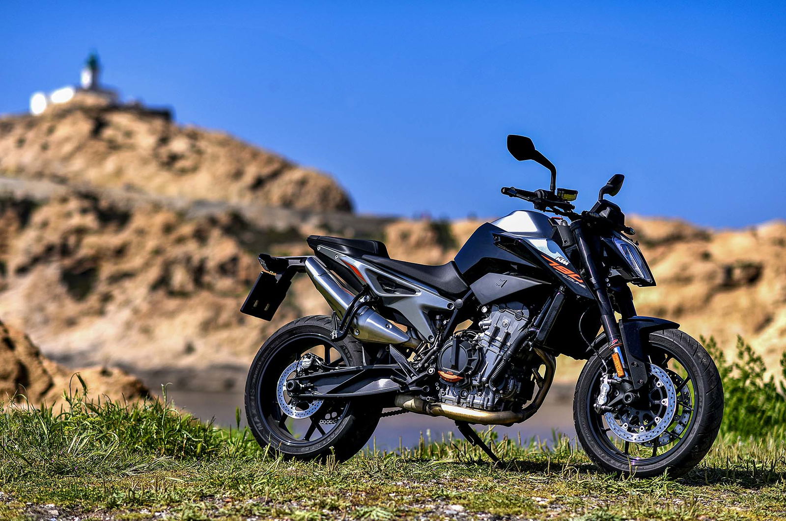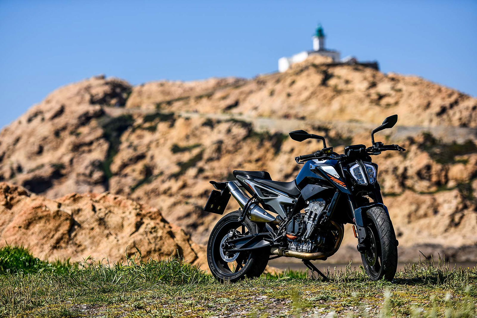 Non è forse la moto più indicata per un lungo viaggio, di quelli che prevedono anche tratte autostradali, ma in questo caso, a parte il noioso tratto Milano-Serravalle, persino l’autostrada ha le curve! Inoltre la KTM 790 Duke si rivela una moto indovinata e con una carta d’identità che stuzzica l’appetito. È un progetto “razionale”, per quanto possano essere razionali gli arancioni di Mattighofen, che piuttosto di lanciarsi in esagerazioni prevede molto equilibrio: due cilindri in linea, 799 cc e 105 cv a 9.000 giri, racchiusi in un compattissimo traliccio in acciaio (1.475 mm l’interasse, 24° l’inclinazione del cannotto). Il peso è ai limiti dell’anoressia, 169 kg a secco, l’elettronica è evoluta: quattro riding mode (Sport, Street, Rain e Track) regolano la risposta del motore, l’intervento del controllo di trazione e dell’ABS (Cornering) e l’anti-impennata gestiti anche dalla piattaforma inerziale (primizia per il segmento). Di serie c’è il Quickshifter+, che funziona sia a salire sia a scendere di rapporto. Tutto a meno di 10 mila euro.Foto di Alessandro Della Torre RIDE È da circa un mese che fremo per questo momento. Sono le 17 di un normale mercoledì di aprile. Mi trovo alla stazione di servizio di Assago, tangenziale ovest di Milano, in attesa degli amici con cui partirò alla volta di Genova, dove un traghetto ci trasporterà magicamente sull’isola che non c’è. Non sono mai stato in Corsica, tanto meno con una moto così in forma come la KTM 790 Duke. Quanto in forma? Bastano un rettilineo e un paio di rotonde per capirlo. Smilza, leggera, potente ma non esasperata, la 790 Duke è la dimostrazione vivente di come poco più di 100 cv e un peso inferiore ai 200 kg siano la formula perfetta per togliersi qualunque prurito e divertirsi su strada. Avrei visto con favore la possibilità di montare un paio di borse (magari qualcosa tipo i beauty case che montava la 990 SMT…) , giusto per stivare il necessario. Invece mi tocca legare lo zaino con il ragno elastico, che tuttavia rischia di sciogliersi a causa dei roventi fumi di scarico…