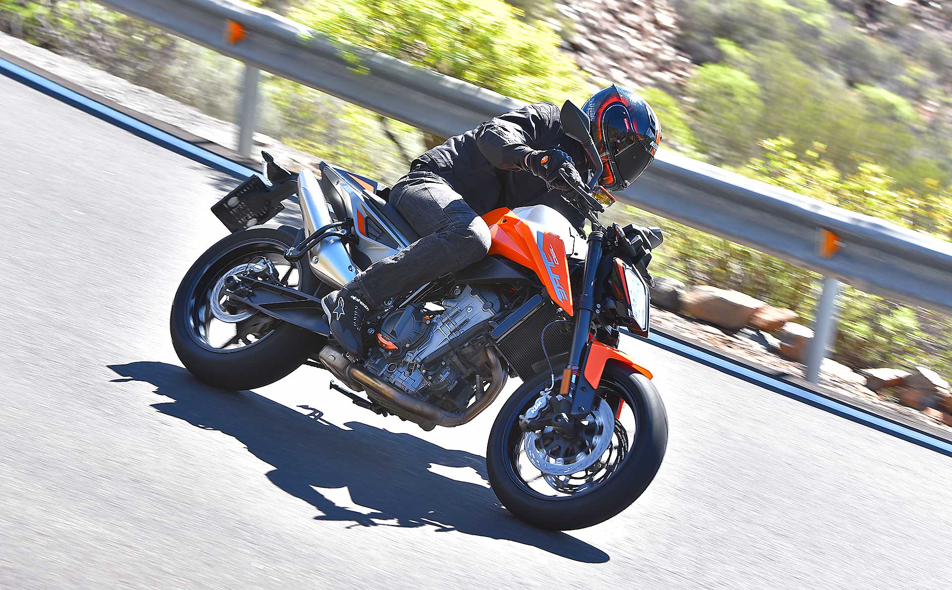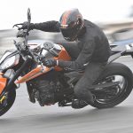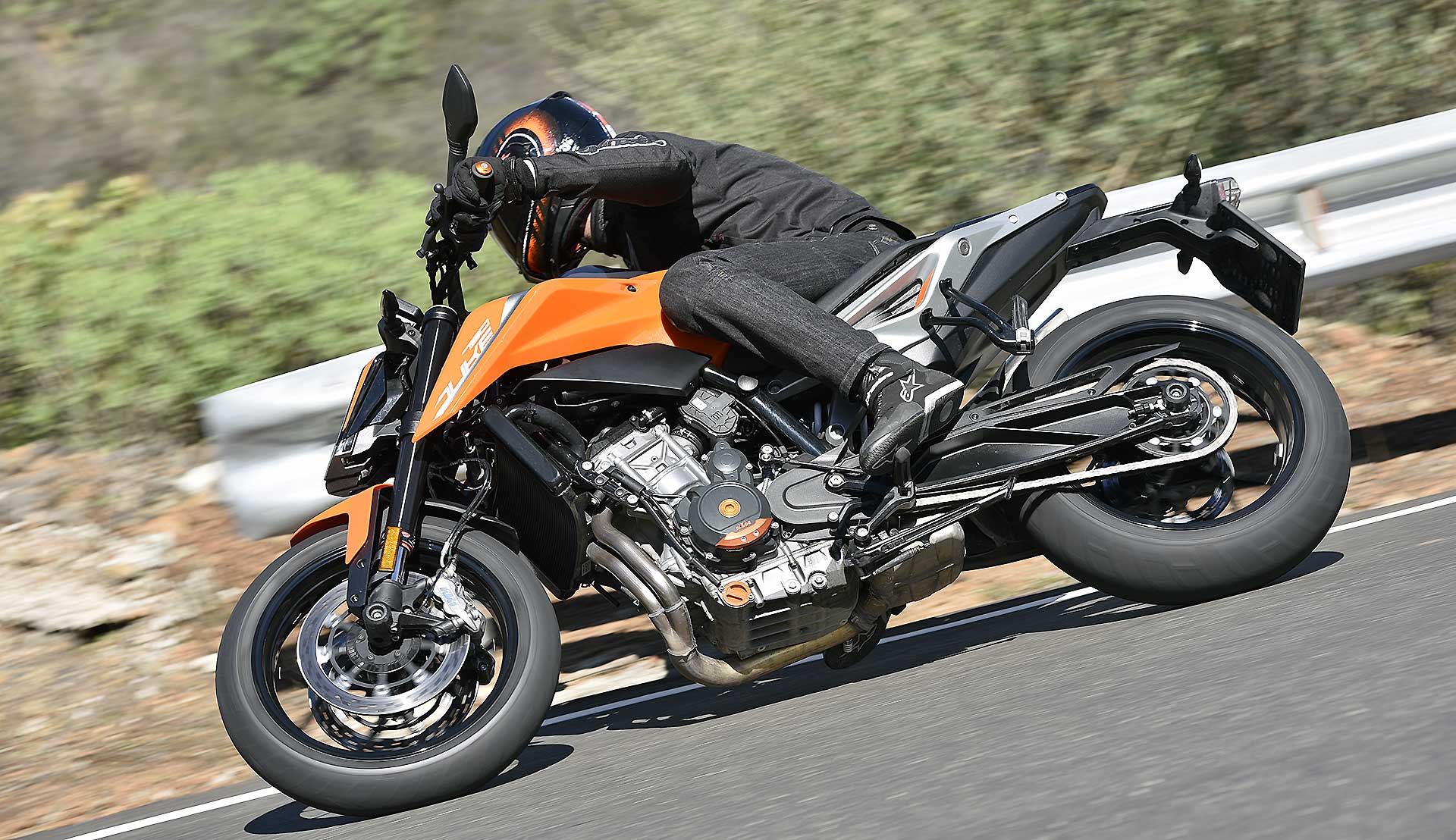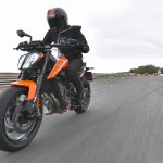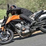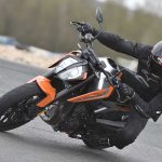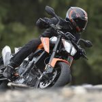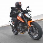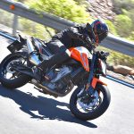 Le sospensioni svolgono bene il loro compito senza mostrare particolari punti deboli anche forzando il passo. Su fondi levigati il lavoro è irreprensibile, mentre se la strada presenta imperfezioni il feeling diminuisce a causa degli pneumatici di primo equipaggiamento (Maxxis forse non proprio all’altezza del progetto) e della risposta del monoammortizzatore che sembra tarato per un assetto molto sportivo. C’è da dire che queste ultime sensazioni sono emerse solo nei tratti dove il passo era decisamente allegro, perciò non propriamente da utente medio.Leggera e reattivaIl peso contenuto si traduce in una piacevole velocità di azione in curva, specie in fase di inserimento, idem nei cambi di direzione, dove la Duke si rivela svelta e appagante. Le pedane alte e arretrate consentono angoli di piega non indifferenti, mentre la moto si dimostra piuttosto precisa anche sul veloce, nonostante la guida alta. Il livello di vibrazioni espresso dal motore è molto contenuto fino ai regimi medio alti, mentre tirando si avverte qualcosa in più ma di livello più che accettabile. Il cambio elettronico è preciso e veloce ed è in buona sinergia con l’ottima frizione, ma è anche sensibile. Conviene normalmente avere l’accortezza di non lasciare il piede vicino alla leva onde evitare dei cambi marcia non voluti. Il debutto di KTM nel mondo delle medie bicilindriche arriva quindi nel migliore dei modi. La 790 Duke riesce ad esprimere perfettamente il DNA KTM pur con caratteristiche tecniche nuove per il marchio austriaco. Pimpante, veloce, vivace e leggera. In questo segmento la concorrenza è spietata c’è da sgomitare. Ma la 790 Duke ha le spalle larghe.