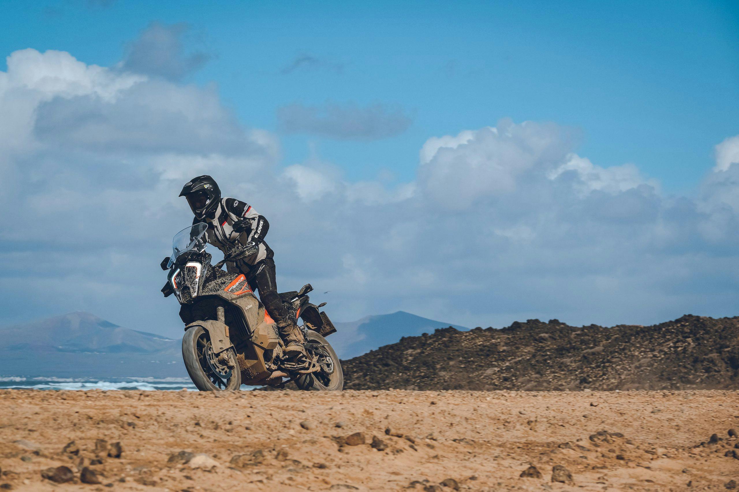 Il buon lavoro fatto in fase di sviluppo ha permesso di realizzare un’elettronica di controllo di altissimo livello. Lo zampino di Bosch è stato determinante, in grado di trasformare l’azione sull’acceleratore nella giusta quantità di potenza da scaricare a terra. Dei vari riding mode il migliore è indubbiamente lo Street, potenza piena a 160 cavalli, buona reattività del ride by wire e traction control che non soffoca il motore nemmeno quando si innesca il leggero spinning per colpa dell’asfalto bagnato. Aggiungo, per dovere di cronaca, il sorprendente lavoro offerto dalle gomme Mitas Terra Force di primo equipaggiamento, sviluppate su specifica dell’R&D KTM, che si rivelano generose in termini di grip in ogni condizione e fluidità nello scendere in curva. Dubbi fugati, su questa scelta. Almeno qui, sull’asfalto delle canarie.