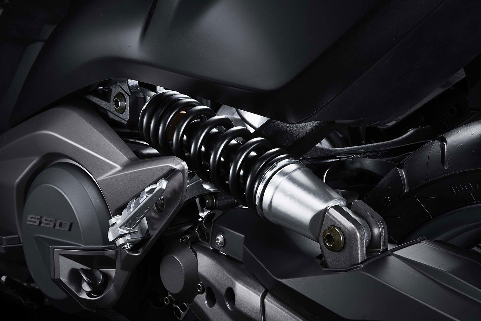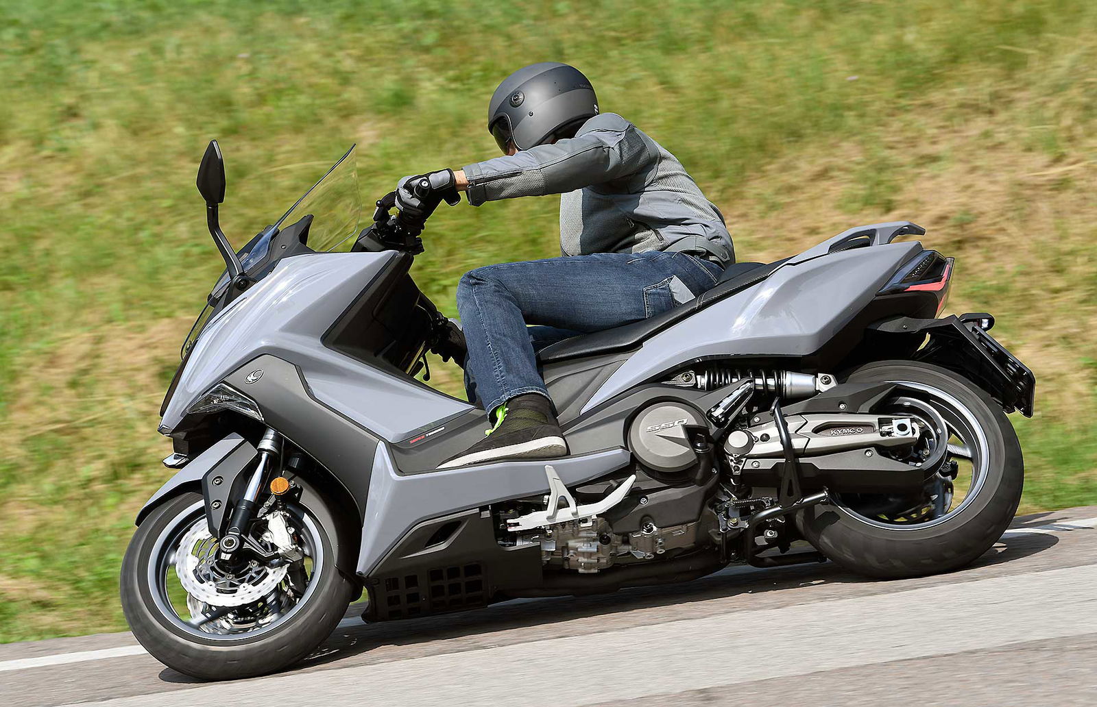 Con uno stile del genere e un motore del genere…può accompagnare solo. Battute a parte, il motore del nuovo scooter sport touring (così lo definiscono in Kymco) è un gioiello d’ingegneria. Bicilindrico orizzontale da 550 cc con fasatura a 270°, 8 valvole, raffreddato a liquido, è alimentato tramite iniezione elettronica e ha due contralberi per ridurre al minimo le vibrazioni. Omologato Euro4, è capace di 51 cv a 7.500 giri e 51,5 Nm, numeri che gli consentono di raggiungere i 161,7 km/h effettivi grazie anche al peso contenuto in 230 kg in ordine di marcia. 21 km/litro invece è il dato dichiarato sui consumi. L’elettronica che lo imbriglia comprende due mappe motore, una Full Power e una Rain, quest’ultima che taglia severamente la potenza (sotto il valore limite per le patenti A2, per intendersi). La trasmissione finale è a cinghia dentata.SCHELETRO PORTANTE