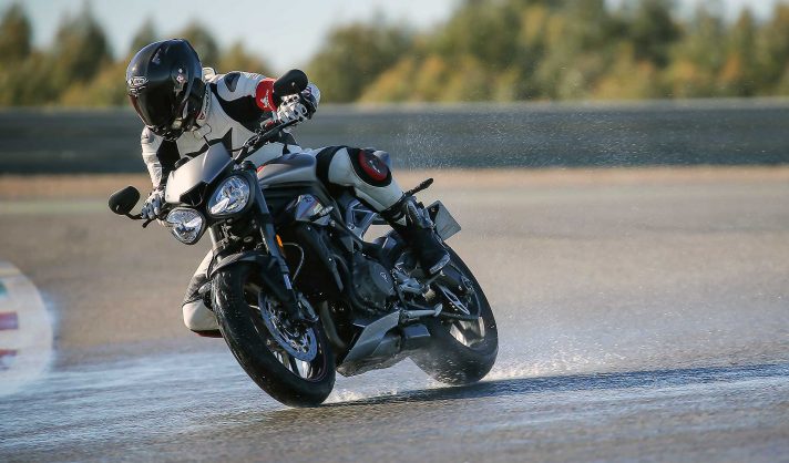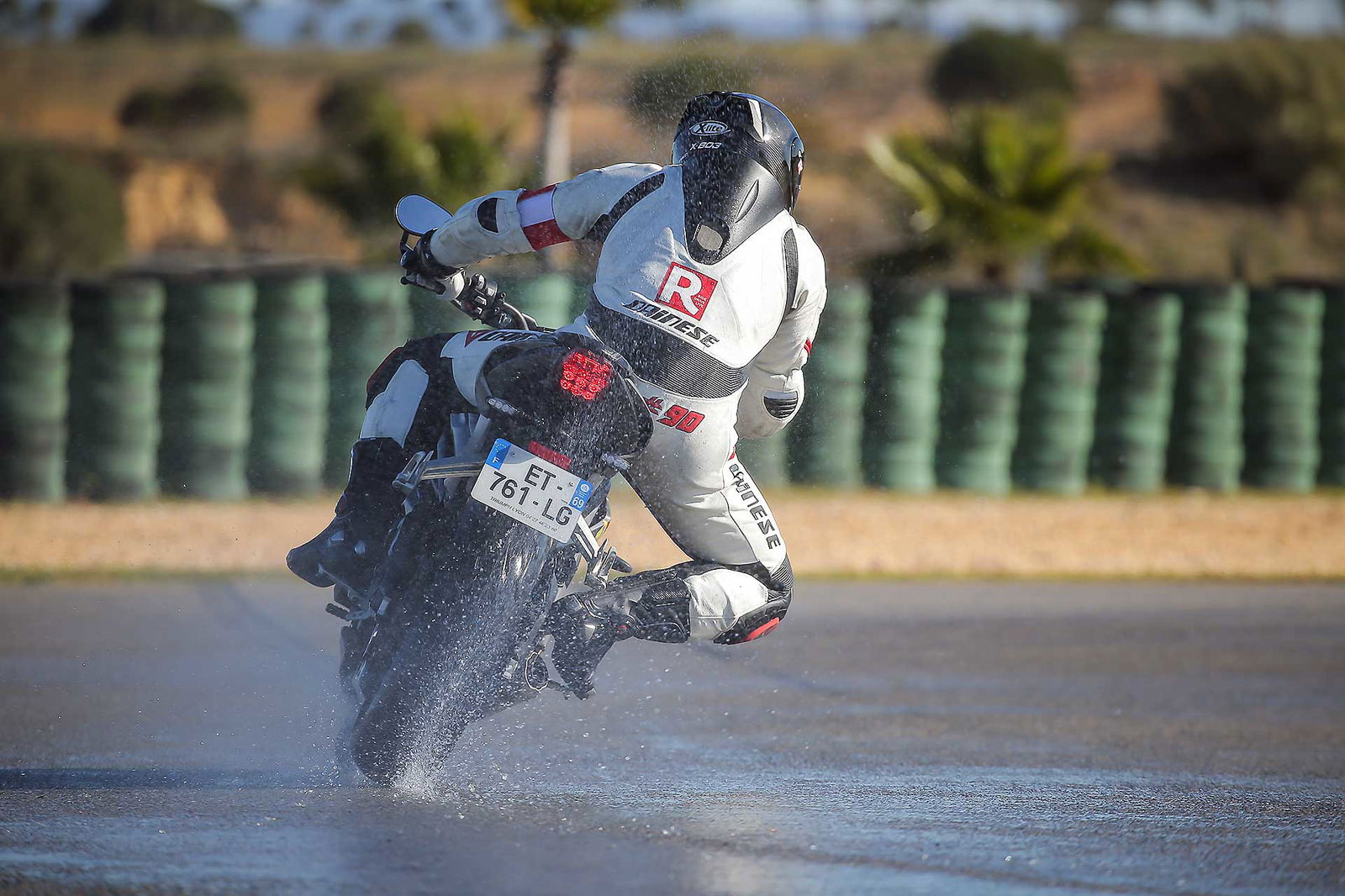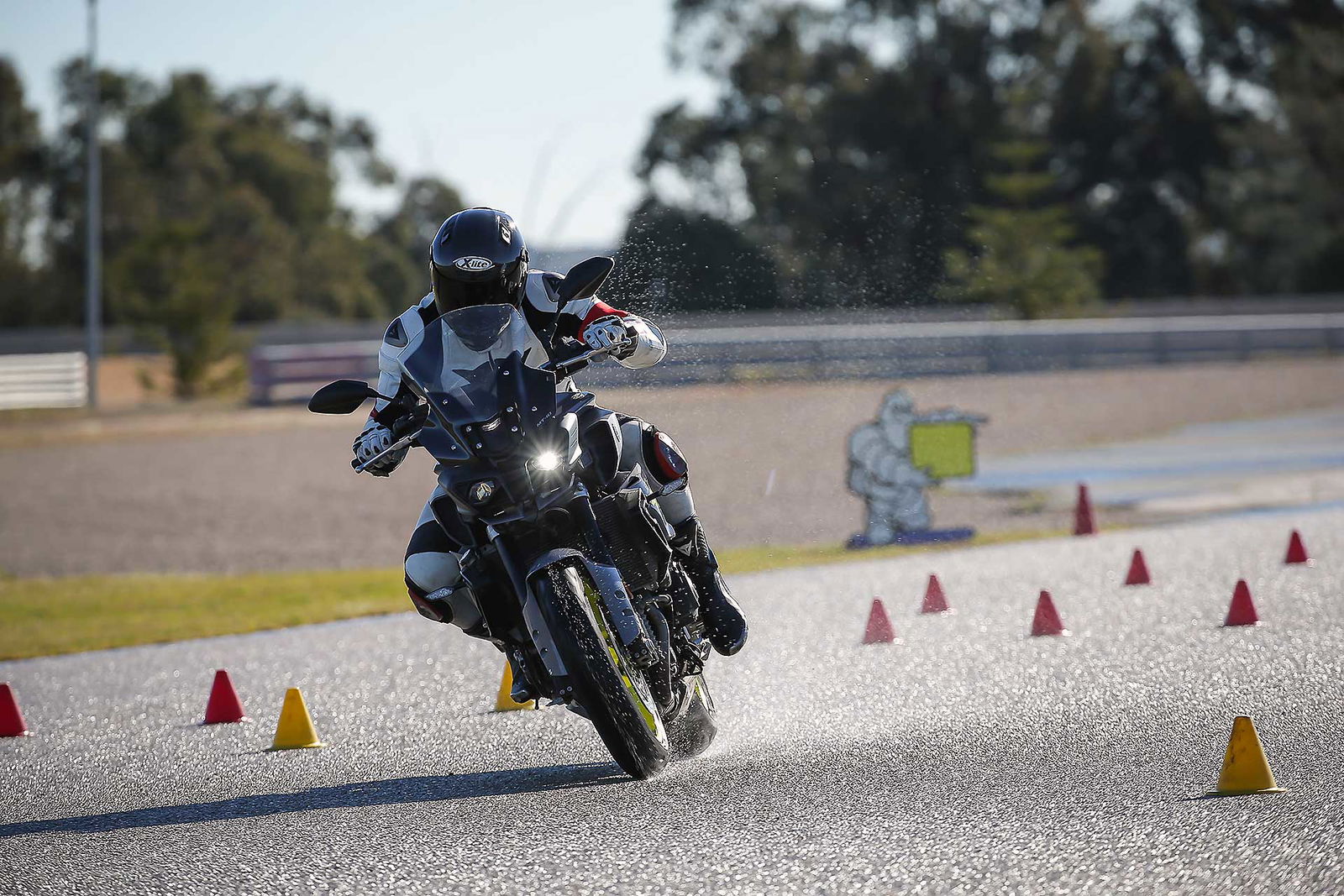 Il parterre delle moto presenti alla prova fa capire l’indole del nuovo prodotto Michelin. Se in occasione della prova del Pilot Road 4, che resta comunque in gamma, erano moto come R 1200 RT o Kawasaki GTR a farla da padrone, oggi ci troviamo al cospetto di Triumph 1290 Super Duke GT, Triumph Speed Triple, Yamaha Tracer 900, Aprilia Tuono 1100, oltre ad altre naked di media cilindrata. Insomma, sebbene in Michelin affermino di tenere il lato turistico in grandissima considerazione, appare chiaro che la Road 5 punti a essere più dinamica rispetto alla Road 4. Lo dice anche il nuovo profilo dell’anteriore, leggermente più appuntito per offrire più agilità.PROVE DIVERSECome sempre accade per Michelin, la giornata di prove è ben strutturata e composta da vari “workshop” (pardon “atelier”, i francesi ci tengono…) in cui misurare il nuovo arrivato in condizioni molto differenti. Pista allagata (con due frenate in ABS), pista asciutta, lungo tour stradale. Il Road 5 mi ha convinto pienamente sul bagnato: la prima prova su pista allagata con una Triumph Street Triple 765 trasmette grande feeling, l’avantreno è preciso, infonde fiducia in ingresso curva. Si guida molto “sciolti” e il posteriore sopporta manate di gas poco “ortodosse”. Qualche micro scivolamento (posteriore) compare solo quando cambio moto, saltando su una Yamaha MT-10, ma il comportamento resta di ottimo livello.IN PISTA