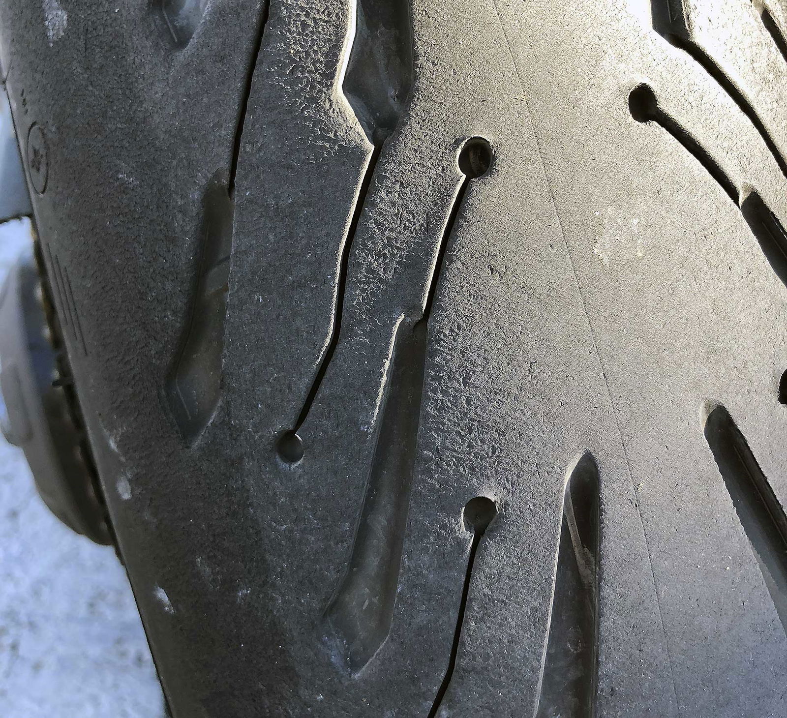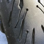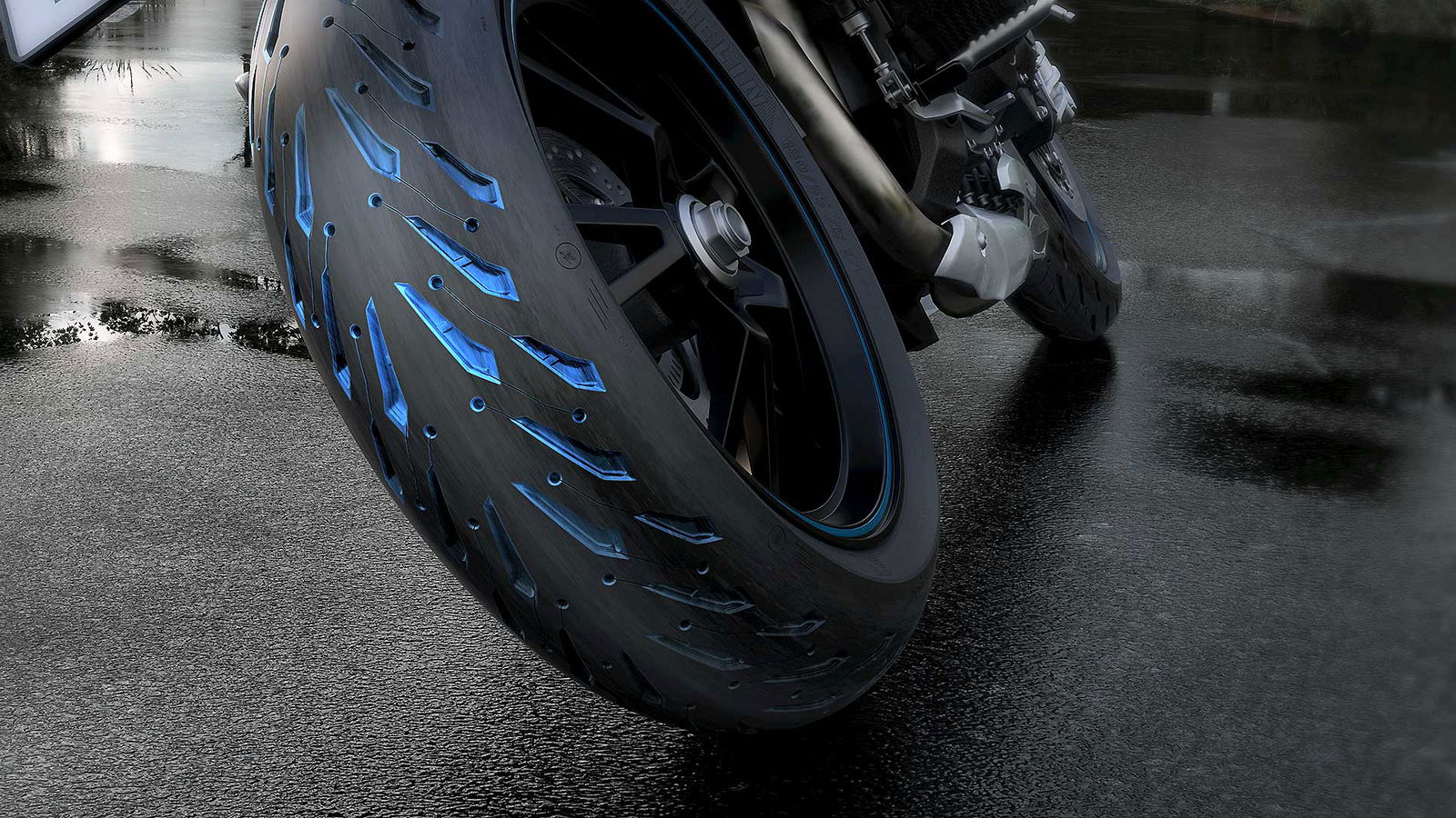 Due le novità introdotte da Michelin sulla Road 5: la carcassa ACT+ (Active Casing Technology) a rigidezza differenziata (meno rigidezza in centro, più rigidezza sulle spalle grazie all’aggiunta di una tela supplementare) e la mescola sulle spalle del posteriore che utilizza il Carbon Black (componente tipico delle gomme sportive) invece della silice (componente tipico delle gomme turistiche) per offrire un livello di grip superiore. Entrambi gli pneumatici sono bimescola, con il posteriore che utilizza la tecnologia 2CT + in cui la mescola “dura” centrale s’infila sotto la “morbida” sulle spalle, per evitare quanto più possibile discontinuità. Utilizzando la tecnica del 3D Metal Printing Michelin è riuscita ad ottenere stampi estremamente complessi e precisi, definendo la seconda generazione di lamelle (XST EVO) che ora hanno un piccolo “serbatoio” sul fondo, consentendo al battistrada di non perdere la capacità di drenare acqua anche a pneumatico consumato. Una tecnologia che Michelin importa dal mondo degli pneumatici invernali per auto.NUMERI E MISURE