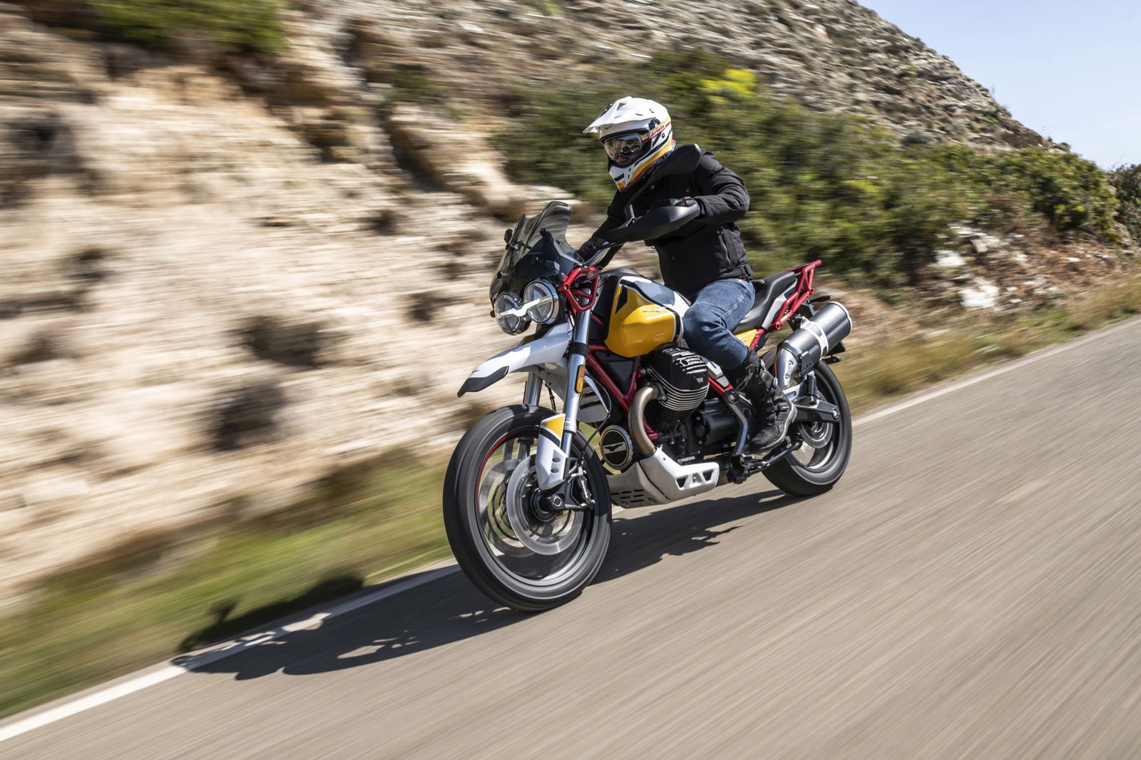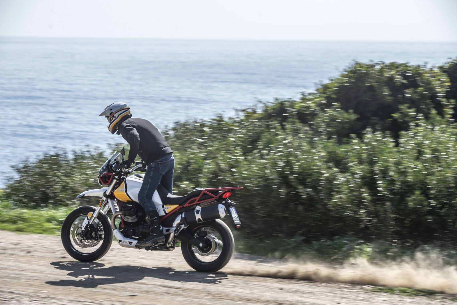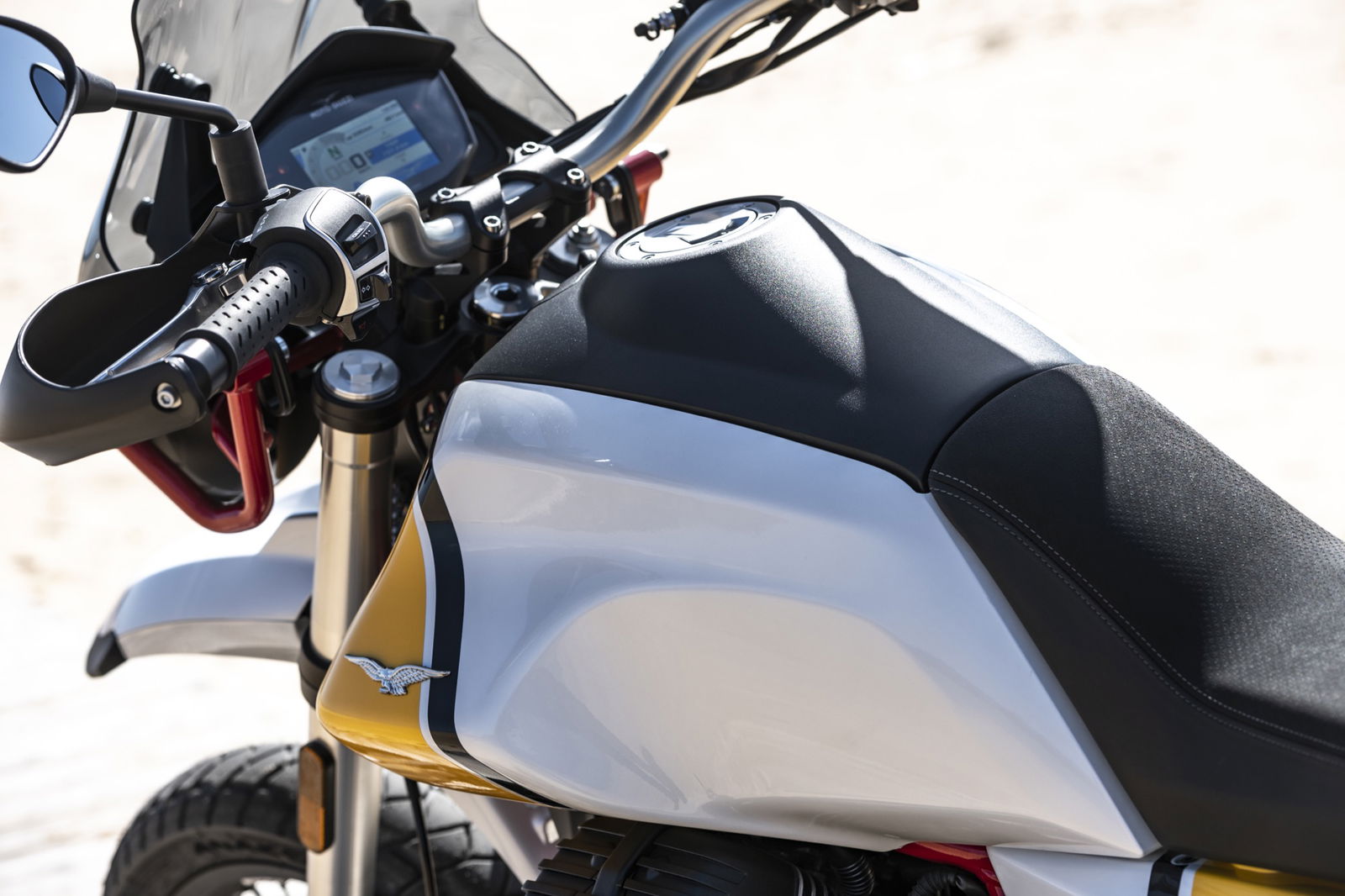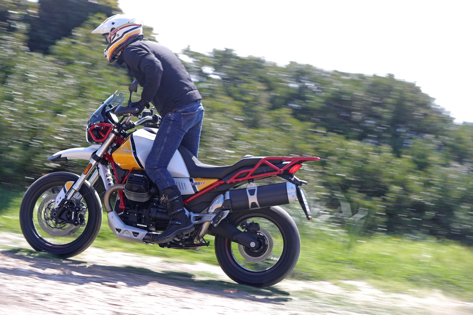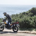 Anche i freni e le sospensioni risultano efficaci: hanno un approccio fluido dell’azione di guida, ma difficilmente vanno in difficoltà anche forzando il ritmo. Si riscontra dunque una sensibile evoluzione del comportamento dinamico, con maggiore precisione e rigore su strada unitamente a maggior robustezza, sostegno e feeling nel fuoristrada leggero a cui la Moto Guzzi V85 TT è ben disposta. La protezione aerodinamica del cupolino di serie è buona ma, soprattutto, si percepisce l’accurato studio aerodinamico al fine di ridurre le turbolenze. Con il vetro opzionale alto da turismo, meno accattivante ma più protettivo, migliora il comfort e la protezione anche per gli utenti oversize.Abbiamo provato entrambe le versioni di Moto Guzzi V85TT: praticamente identiche, nello specifico, la bicolor con le gomme “all road” si è mostrata molto versatile e non ha creato problemi anche su asfalto, comunicando al pilota in modo graduale e per tempo l’inizio di perdita di aderenza, cosa che avviene solo esagerando con il ritmo. La moto è sostanzialmente una turistica stradale, ma la notevole luce a terra e le sospensioni a lunga escursione permettono di affrontare e di divertirsi su facili tratti offroad, in particolare con la versione con le gomme Michelin.
