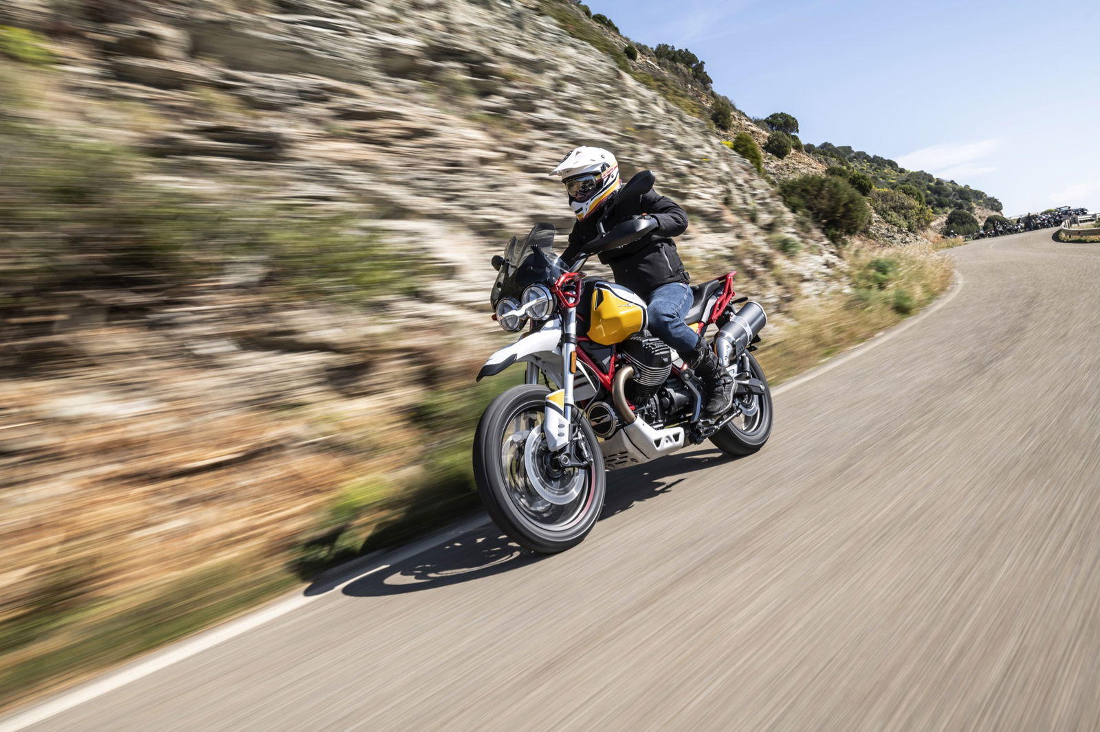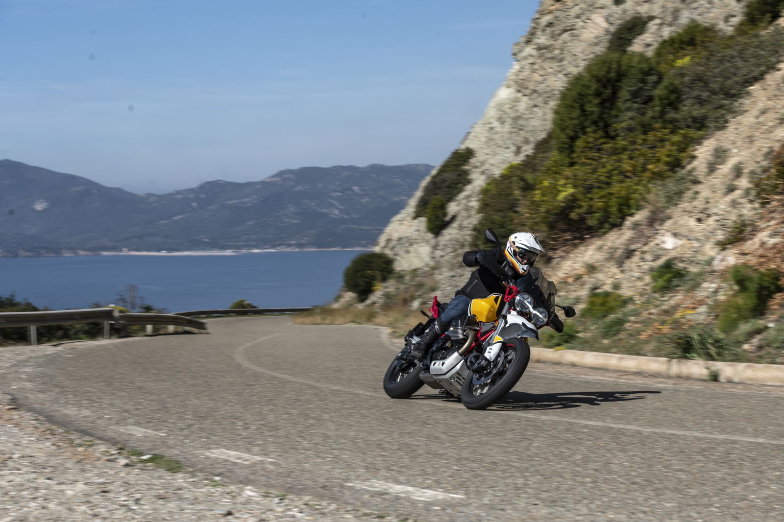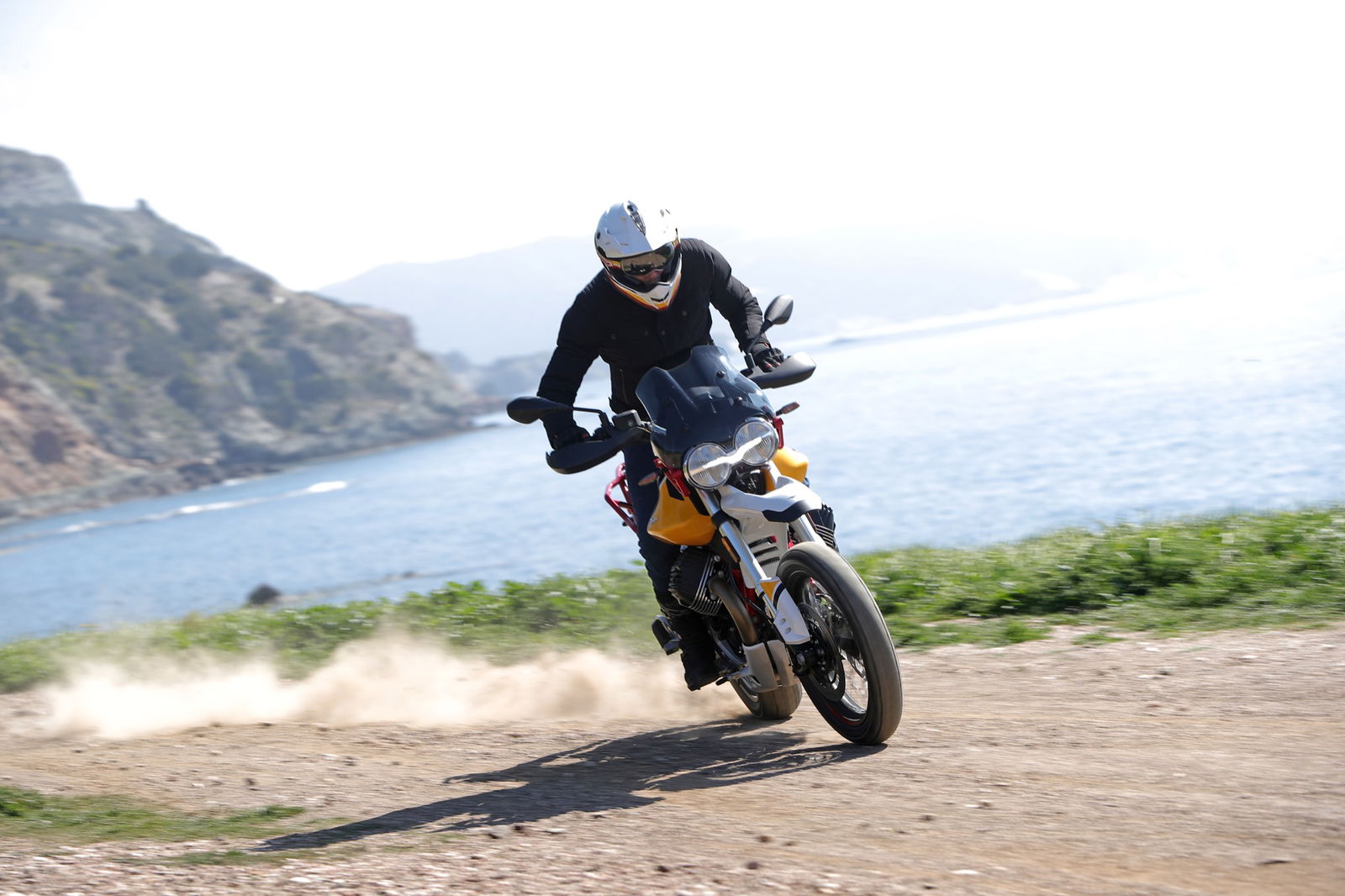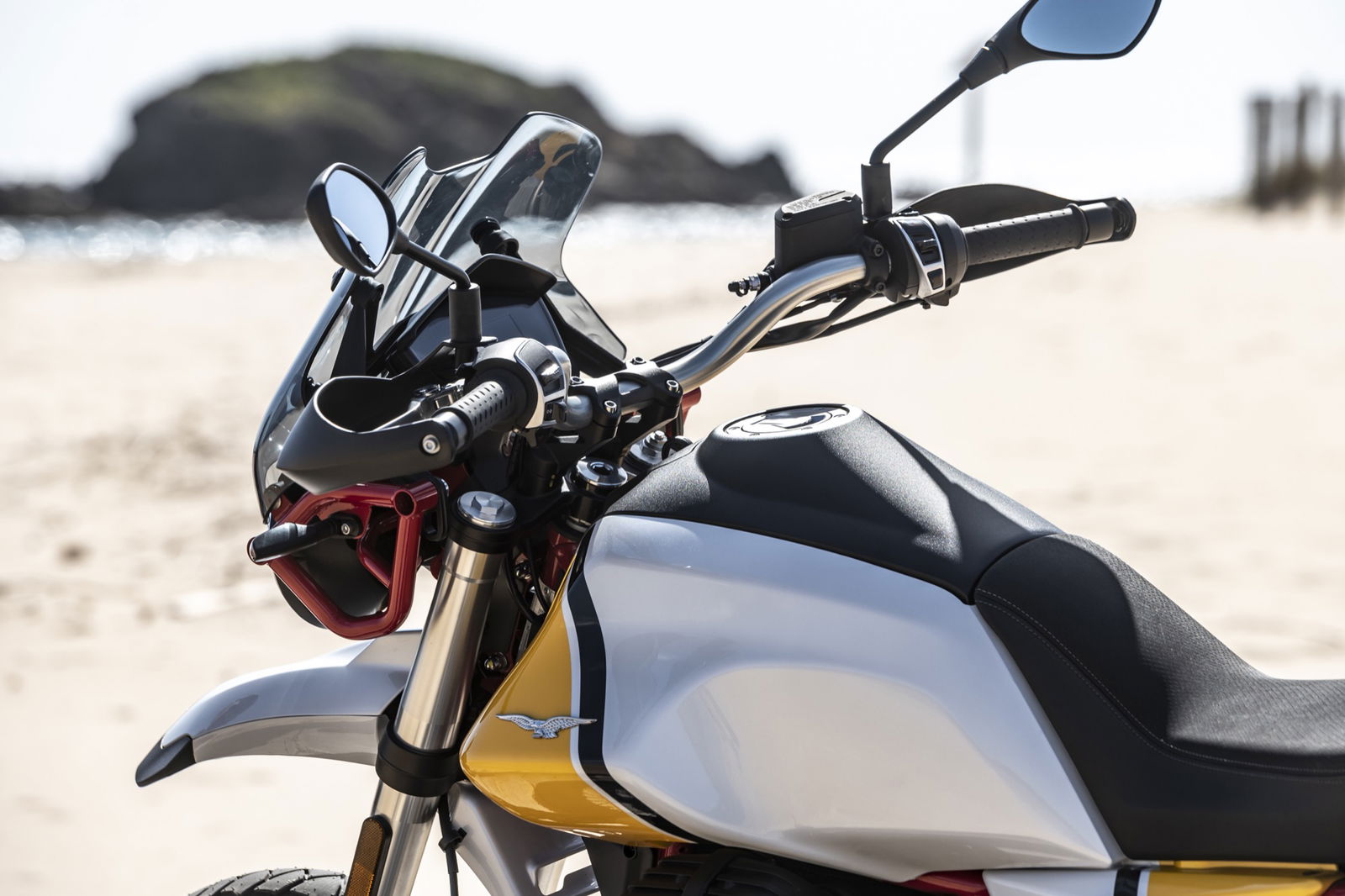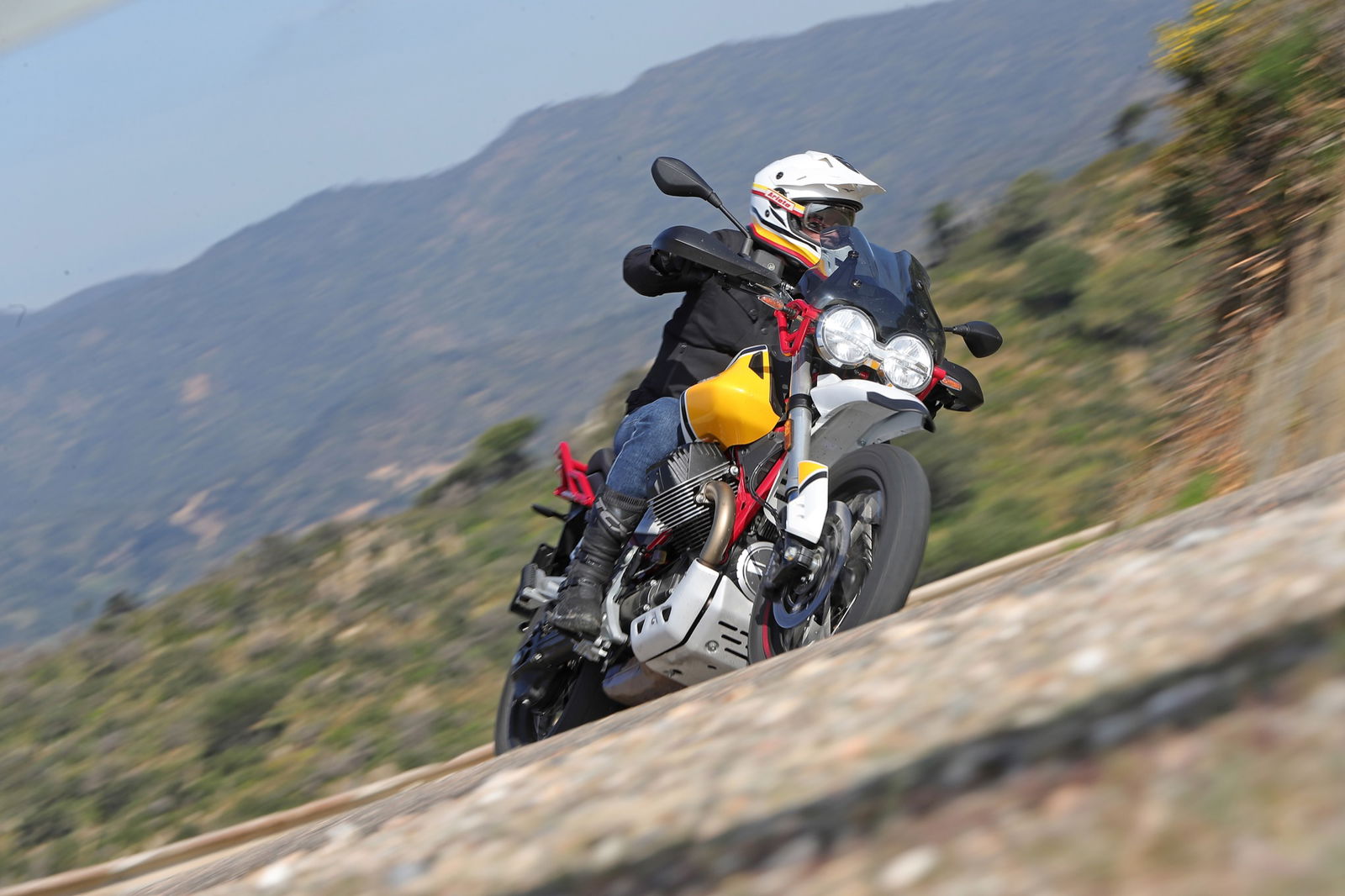 Anche i freni e le sospensioni risultano efficaci: hanno un approccio fluido dell’azione di guida, ma difficilmente vanno in difficoltà anche forzando il ritmo. Si riscontra dunque una sensibile evoluzione del comportamento dinamico, con maggiore precisione e rigore su strada unitamente a maggior robustezza, sostegno e feeling nel fuoristrada leggero a cui la Moto Guzzi V85 TT è ben disposta. La protezione aerodinamica del cupolino di serie è buona ma, soprattutto, si percepisce l’accurato studio aerodinamico al fine di ridurre le turbolenze. Con il vetro opzionale alto da turismo, meno accattivante ma più protettivo, migliora il comfort e la protezione anche per gli utenti oversize.Abbiamo provato entrambe le versioni di Moto Guzzi V85TT: praticamente identiche, nello specifico, la bicolor con le gomme “all road” si è mostrata molto versatile e non ha creato problemi anche su asfalto, comunicando al pilota in modo graduale e per tempo l’inizio di perdita di aderenza, cosa che avviene solo esagerando con il ritmo. La moto è sostanzialmente una turistica stradale, ma la notevole luce a terra e le sospensioni a lunga escursione permettono di affrontare e di divertirsi su facili tratti offroad, in particolare con la versione con le gomme Michelin.