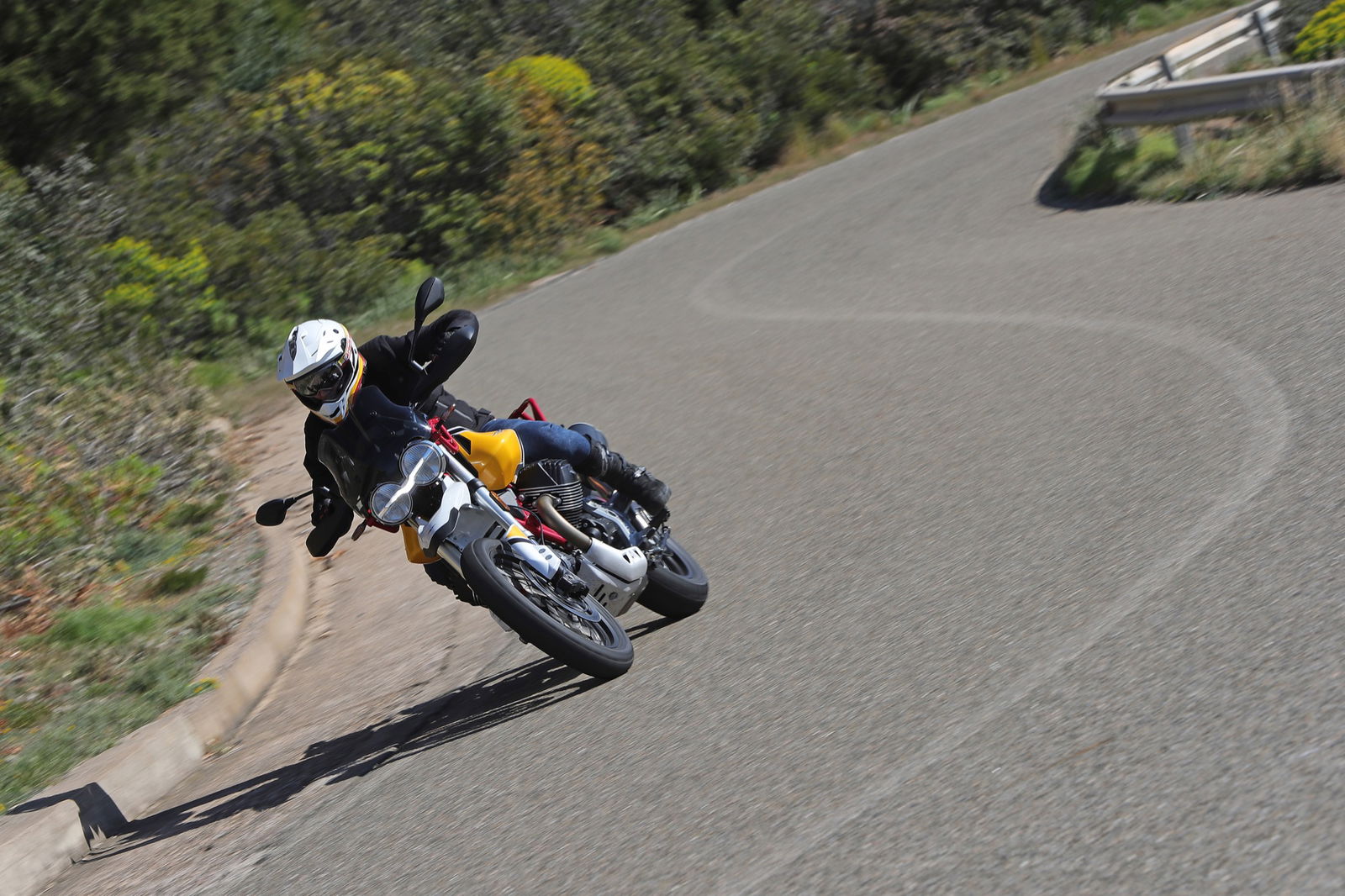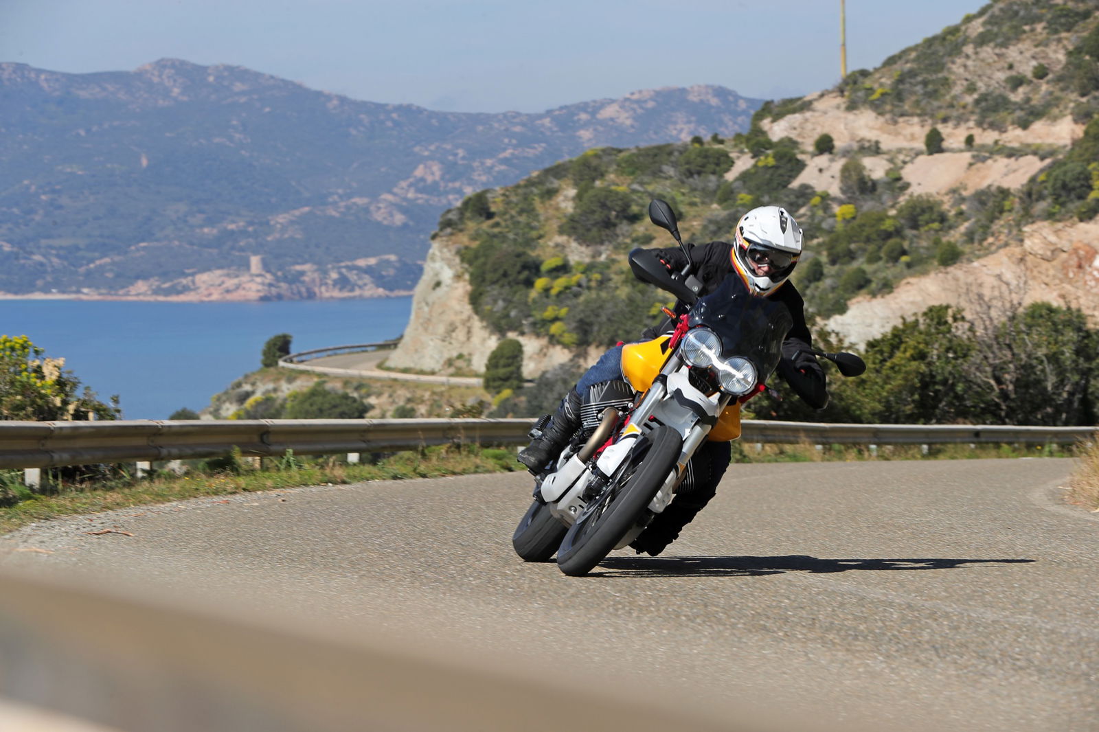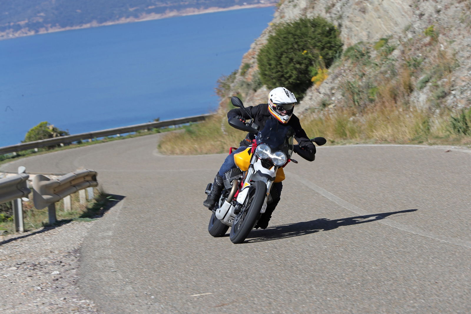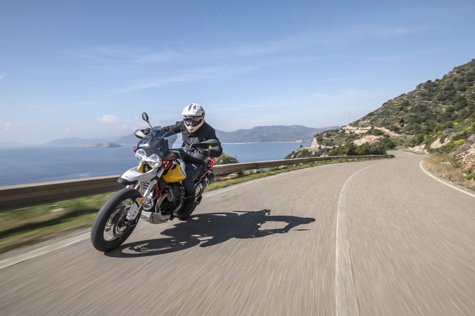 Anche i freni e le sospensioni risultano efficaci: hanno un approccio fluido dell’azione di guida, ma difficilmente vanno in difficoltà anche forzando il ritmo. Si riscontra dunque una sensibile evoluzione del comportamento dinamico, con maggiore precisione e rigore su strada unitamente a maggior robustezza, sostegno e feeling nel fuoristrada leggero a cui la Moto Guzzi V85 TT è ben disposta. La protezione aerodinamica del cupolino di serie è buona ma, soprattutto, si percepisce l’accurato studio aerodinamico al fine di ridurre le turbolenze. Con il vetro opzionale alto da turismo, meno accattivante ma più protettivo, migliora il comfort e la protezione anche per gli utenti oversize.Abbiamo provato entrambe le versioni di Moto Guzzi V85TT: praticamente identiche, nello specifico, la bicolor con le gomme “all road” si è mostrata molto versatile e non ha creato problemi anche su asfalto, comunicando al pilota in modo graduale e per tempo l’inizio di perdita di aderenza, cosa che avviene solo esagerando con il ritmo. La moto è sostanzialmente una turistica stradale, ma la notevole luce a terra e le sospensioni a lunga escursione permettono di affrontare e di divertirsi su facili tratti offroad, in particolare con la versione con le gomme Michelin.