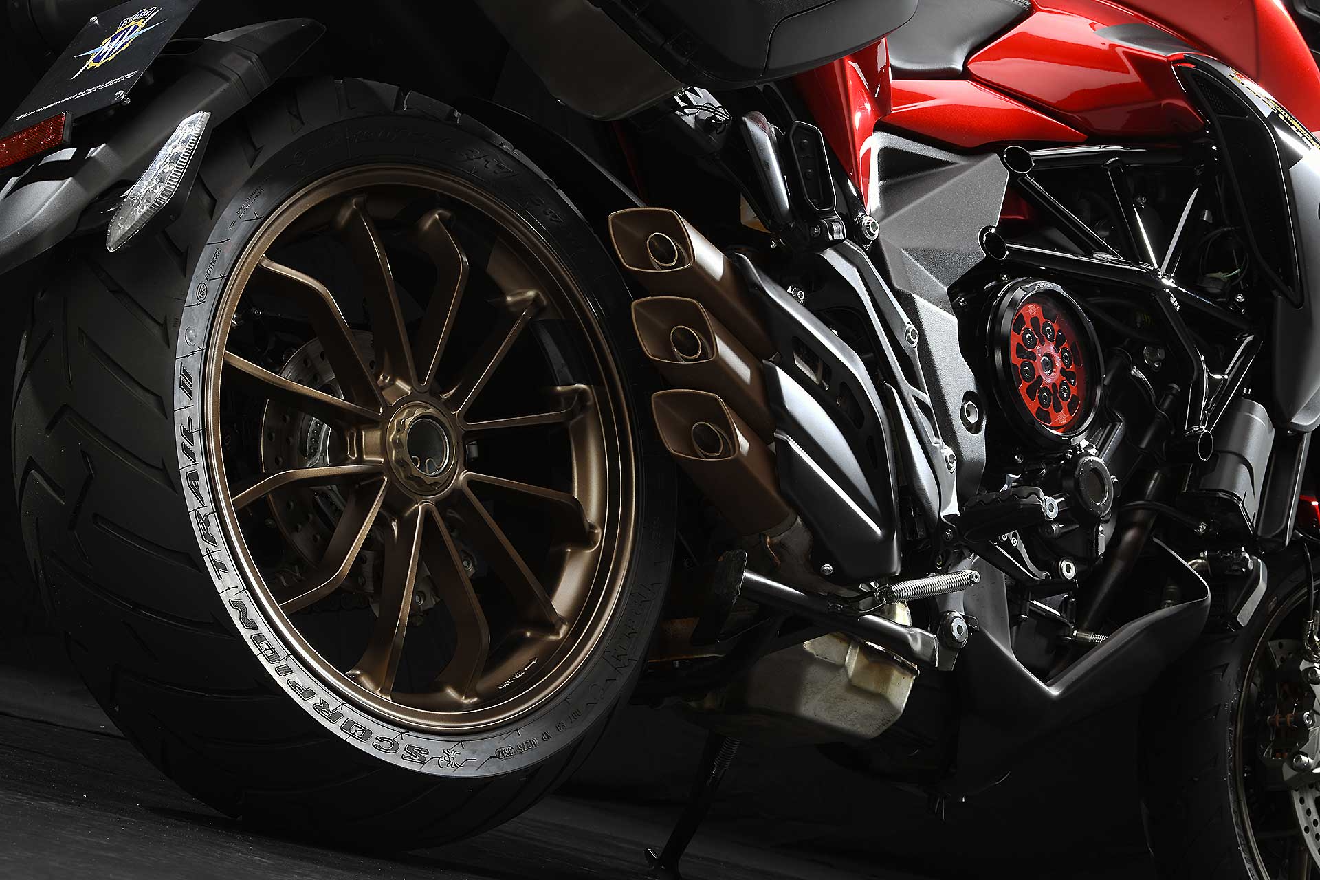 I vantaggi di questo sistema, evidenziato da uno scenografico coperchio trasparente realizzato in Lexan, che ha contribuito anche a ridurre la rumorosità meccanica, oltre a esentare dal tirare la leva – che avrebbe potuto anche sparire, ma che MV ha voluto mantenere per far capire che siamo al cospetto di una moto “meccanica” – comparati agli altri sistemi di cambiata “assistita” sono anche la leggerezza (nessun aggravio di peso, la differenza è solo 36 grammi) e la relativa semplicità costruttiva. Al pilota resta il gusto della cambiata, eliminando tutti gli “sbattimenti” ad essa collegati.Motore evoluto