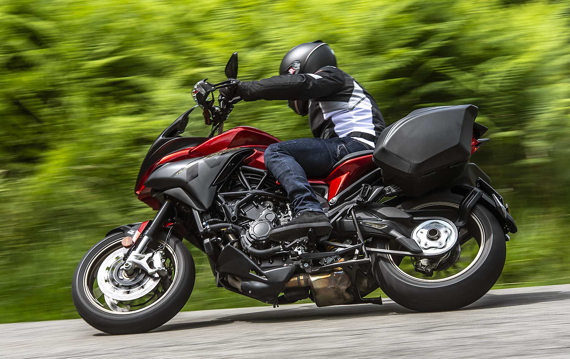 Oltre a questo il motore ha ricevuto altri interventi: il profilo delle camme è stato rivisto, sono cambiate le camere di combustione per una combustione più regolare, valvole e guidavalvole sono state riprogettate. La rumorosità è stata ridotta introducendo un Harmonic Damper che ha abbattuto il rumore meccanico, consentendo ai tecnici di concentrarsi sul sound del tre cilindri. La testa ha un nuovo fissaggio al telaio, cambiato anch’esso in quel punto per ottenere una ciclistica leggermente più rigida.Non cambiano i punti chiave del progetto Turismo Veloce, una moto che potremmo definire crossover nel vero senso della parola perché se analizziamo freddamente le caratteristiche tecniche (potenza, peso) appartiene alle medie, ma per dotazione, finiture, prezzo (sospensioni attive e frizione semiautomatica valgono 21.490 euro) appartiene senza dubbio al segmento premium. Una premium leggera, compatta, abitabile e divertente, e ora con qualcosa in più. A voi la scelta.RIDE“Non vogliamo più essere i primi, perché lo siamo stati spesso e poi sono arrivati gli altri… e ci hanno fregato”. Le parole di Giovanni Castiglioni in conferenza stampa possono suonare strane, al limite dell’arroganza. Se pensiamo a marchi motociclistici leader per tecnologia, MV Agusta non è il primo che viene in mente, tuttavia tornando indietro con la memoria scopriamo che al marchio di Schiranna sono attribuibili diverse “prime” nel mondo delle moto di serie. La prima a utilizzare un motore 4 cilindri a valvole radiali con la F4, la prima a progettare un telaio misto (traliccio di acciaio piastra in alluminio), la prima a portare su una moto omologata i cornetti ad altezza variabile (sull’esoterica F4 Tamburini), la prima a montare un albero motore controrotante. Insomma non si può dire che ai tecnici varesini manchi l’inventiva, perché hanno spesso aperto nuove strade. Soprattutto hanno voglia di osare, e se tutto questo fosse accompagnato da una capacità commerciale paragonabile, forse parleremmo di altri numeri. In ogni caso questa affermazione fa un po’ sorridere visto che arriva proprio durante il lancio della Turismo Veloce SCS.Semplicità e funzionalitàhttps://vimeo.com/273844454Questo sta alla base del sistema SCS, l’accordatura della frizione Rekluse con le mappature dell’elettronica spiega l’ottimo funzionamento della Turismo Veloce. Differenze con una moto normale? Una sola: l’utilizzo di un freno di stazionamento per fermare la moto quando è parcheggiata. Freno di stazionamento piazzato in modo molto “smart”, con un secondo piccolo pedale sulla destra e che si disinserisce semplicemente frenando. L’avviamento avviene tirando la frizione e questo è l’unico momento in cui vi dovrete ricordare di usarla. Poi potrete dimenticarvene, anche per innestare la prima. Rekluse ed elettronica lavoreranno per voi. E lo faranno molto bene.Meglio di un umano?