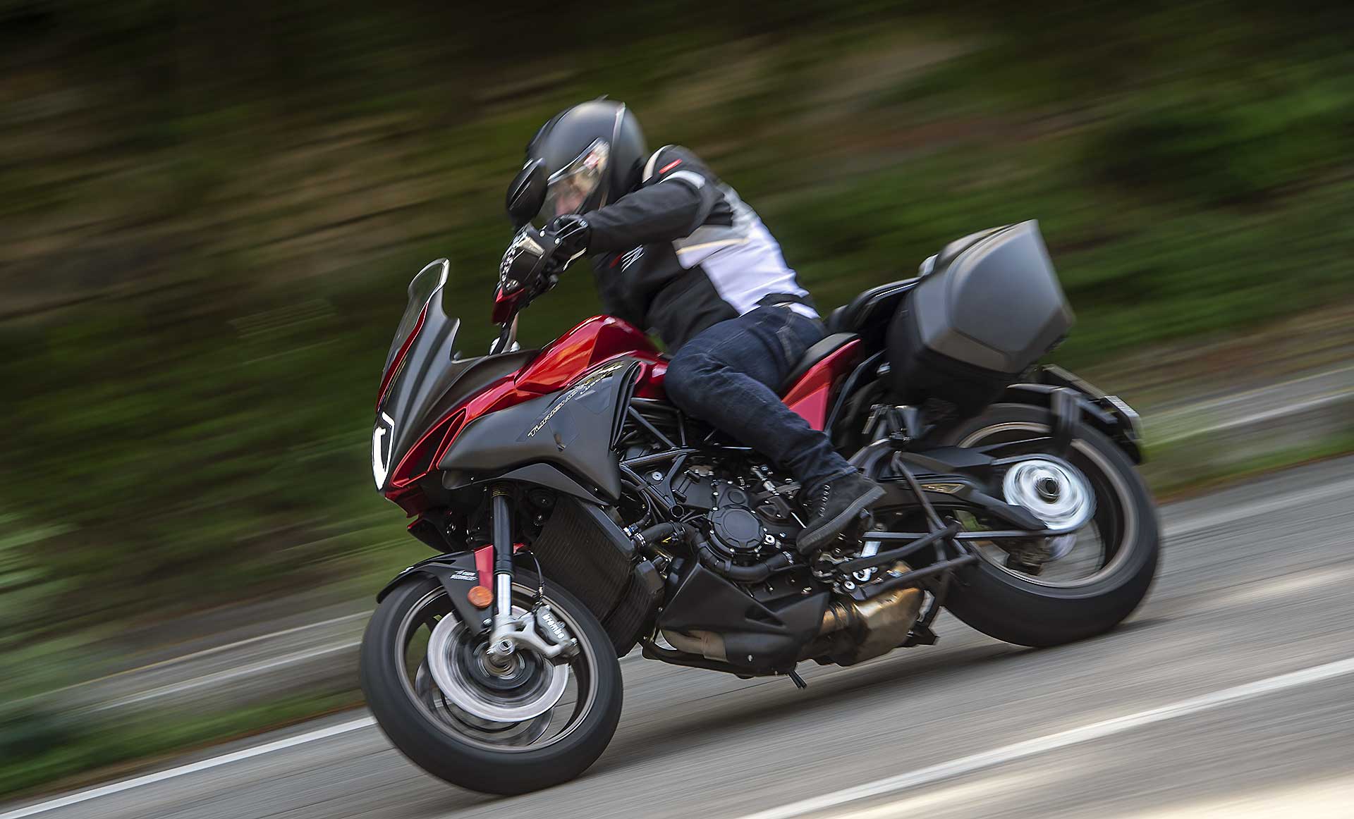La posizione di guida è azzeccata: percepisci di essere a bordo di una moto compatta (la più compatta tra le moto con le borse) ma non è poco abitabile; il manubrio è largo nel modo giusto, il cupolino protegge abbastanza bene (meglio nella posizione rialzata, in quella tutta bassa lascia fuori completamente il casco), e una volta in sella il mix tra agilità proverbiale e feeling trasmesso (con la complicità della Pirelli Scorpion Sync dal grip fenomenale) riesce a conquistarti. La Turismo Veloce può essere goduta con calma, usando marce lunghe con il motore non si fa aspettare troppo, oppure aggredita. Guidata sportivamente dà soddisfazione perché è agilissima, cambia direzione in un amen e consente correzioni dell’ultimo secondo. Quando inizi a guidare sportivamente basta poco per dimenticarsi di essere alla guida di una crossover, sembra più una motard sportiva.Su misura