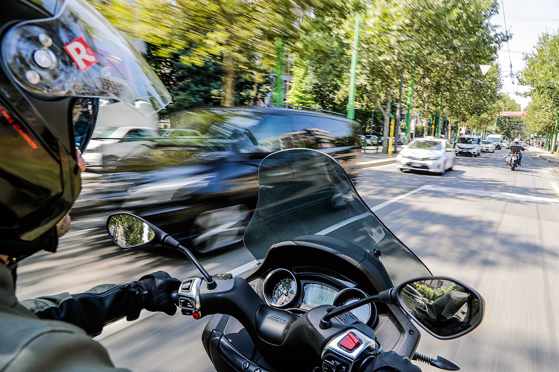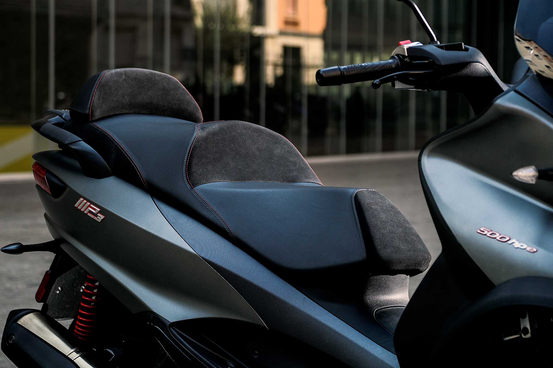 Quello che piace dell’MP3 500 Sport è la qualità generale del mezzo. Piaggio ha lavorato molto per offrire una percezione di qualità elevata. È un mezzo premium e si capisce. E muovendolo a motore spendo si capisce anche che non è un mezzo leggero da gestire, anche se la sella (ridisegnata e confortevole) a soli 790 mm da terra aiuta parecchio. Chi cerca qualcosa di più guizzante in città magari rivolga le proprie attenzioni verso uno Yourban, l’MP3 500, invece, si fa apprezzare molto nei percorsi più veloci e scorrevoli delle arterie extraurbane dove tra l’altro può mettere in mostra le notevoli prestazioni sciorinate dal suo monocilindrico da 493 cc. Monocilindrico che si è peraltro molto raffinato nel funzionamento. Più “morbido”, meno soggetto a restituire le poderose “pistonate” in accelerazione che caratterizzavano le prime versioni di questo motore. Il motore Hpe convince, pur avendo perso a mio parere un pizzico di sprint rispetto al passato, ma guadagnando in fruibilità e piacevolezza di guida.PIU’ FLUIDO