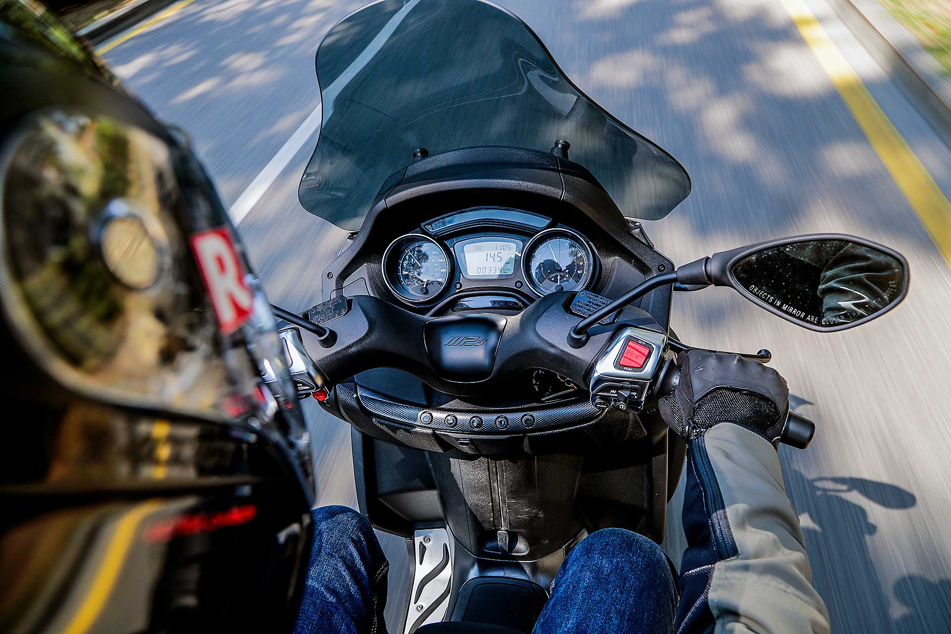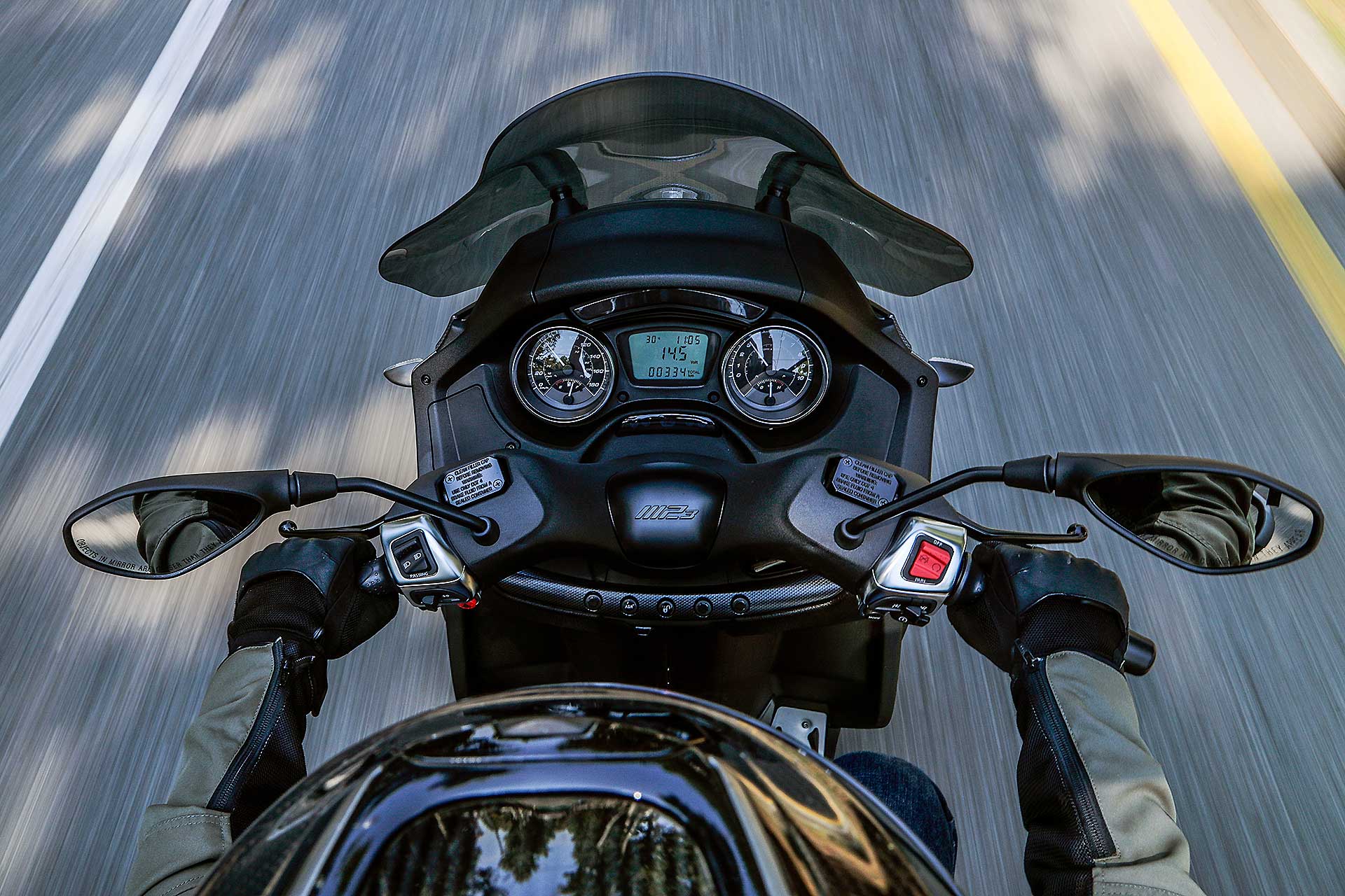 Le prestazioni, infatti, sono un po’ più diluite rispetto alle prime versioni meno strozzate dai limiti anti inquinamento anche se restano da primo della classe. Brillante allo spunto, ben accoppiato al lavoro di frizione e variatore, e dotato di un buon allungo in velocità, questo 500 tiene fede all’allestimento sportivo dell’MP3 che conferma le sue caratteristiche ciclistiche con però la percezione che Piaggio abbia affinato tutto il meccanismo anteriore. Lo sterzo appare ora meglio isolato che in passato rispetto alle sollecitazioni ricevute dalle ruote, tutto il comparto anteriore sembra assorbire meglio le asperità, di contro è il posteriore a rivelarsi un po’ “secco” nelle risposte. L’assetto è quindi tendenzialmente un po’ rigido. Se cercate spazio e abitabilità con l’MP3 500 avete trovato pane per i vostri denti. La sella è bassa ma larga e ottimamente conformata e il nuovo parabrezza offre una protezione davvero buona.COMFORT ZONECon lui vien quasi voglia di viaggiare anche perché dotazione e spazio per bagagli sono di tutto rispetto. Comodo sopra il cruscotto lo sportello in cui riporre il cellulare con tanto di presa USB per ricaricarlo, comodo l’enorme vano sottosella. E comoda anche la pedana, anche se il pedale del freno (necessario per l’omologazione che consente di guidarlo con patente B) ingombra un po’ nella parte destra. Comodo anche il sistema del blocco di basculamento, che permette di non poggiare mai i piedi a terra ma che richiede una minima malizia. Lo scooter va fermato sempre dritto per evitare fastidiosi sbilanciamenti durante le ripartenze.