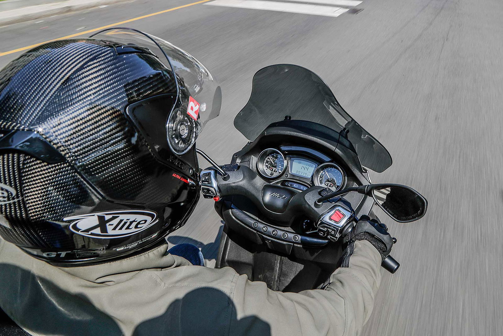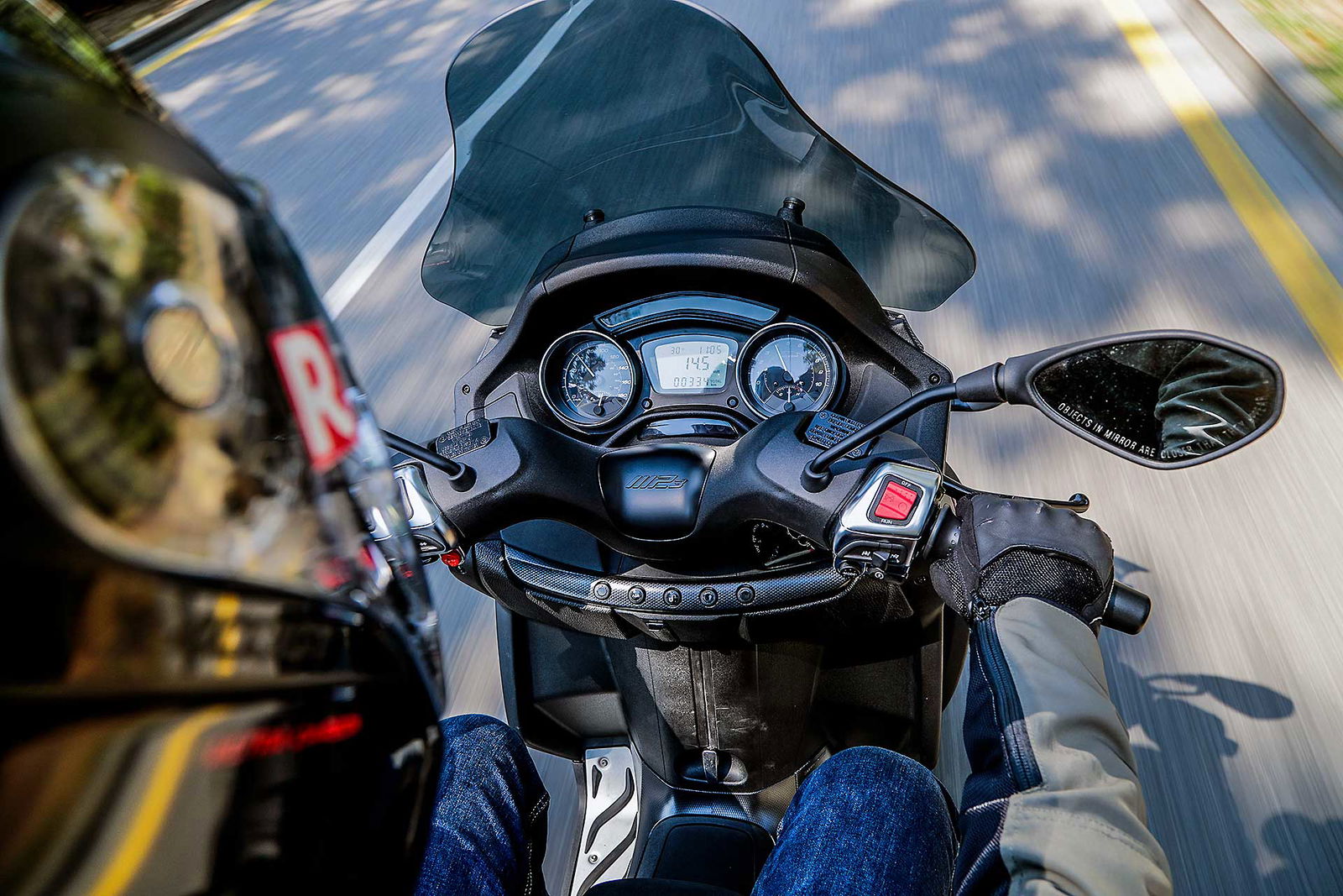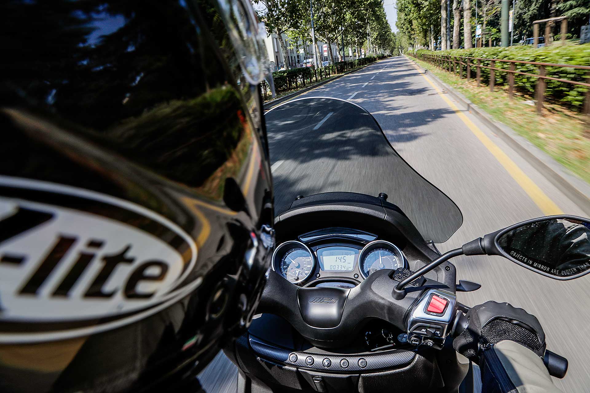 Quello che piace dell’MP3 500 Sport è la qualità generale del mezzo. Piaggio ha lavorato molto per offrire una percezione di qualità elevata. È un mezzo premium e si capisce. E muovendolo a motore spendo si capisce anche che non è un mezzo leggero da gestire, anche se la sella (ridisegnata e confortevole) a soli 790 mm da terra aiuta parecchio. Chi cerca qualcosa di più guizzante in città magari rivolga le proprie attenzioni verso uno Yourban, l’MP3 500, invece, si fa apprezzare molto nei percorsi più veloci e scorrevoli delle arterie extraurbane dove tra l’altro può mettere in mostra le notevoli prestazioni sciorinate dal suo monocilindrico da 493 cc. Monocilindrico che si è peraltro molto raffinato nel funzionamento. Più “morbido”, meno soggetto a restituire le poderose “pistonate” in accelerazione che caratterizzavano le prime versioni di questo motore. Il motore Hpe convince, pur avendo perso a mio parere un pizzico di sprint rispetto al passato, ma guadagnando in fruibilità e piacevolezza di guida.PIU’ FLUIDO
