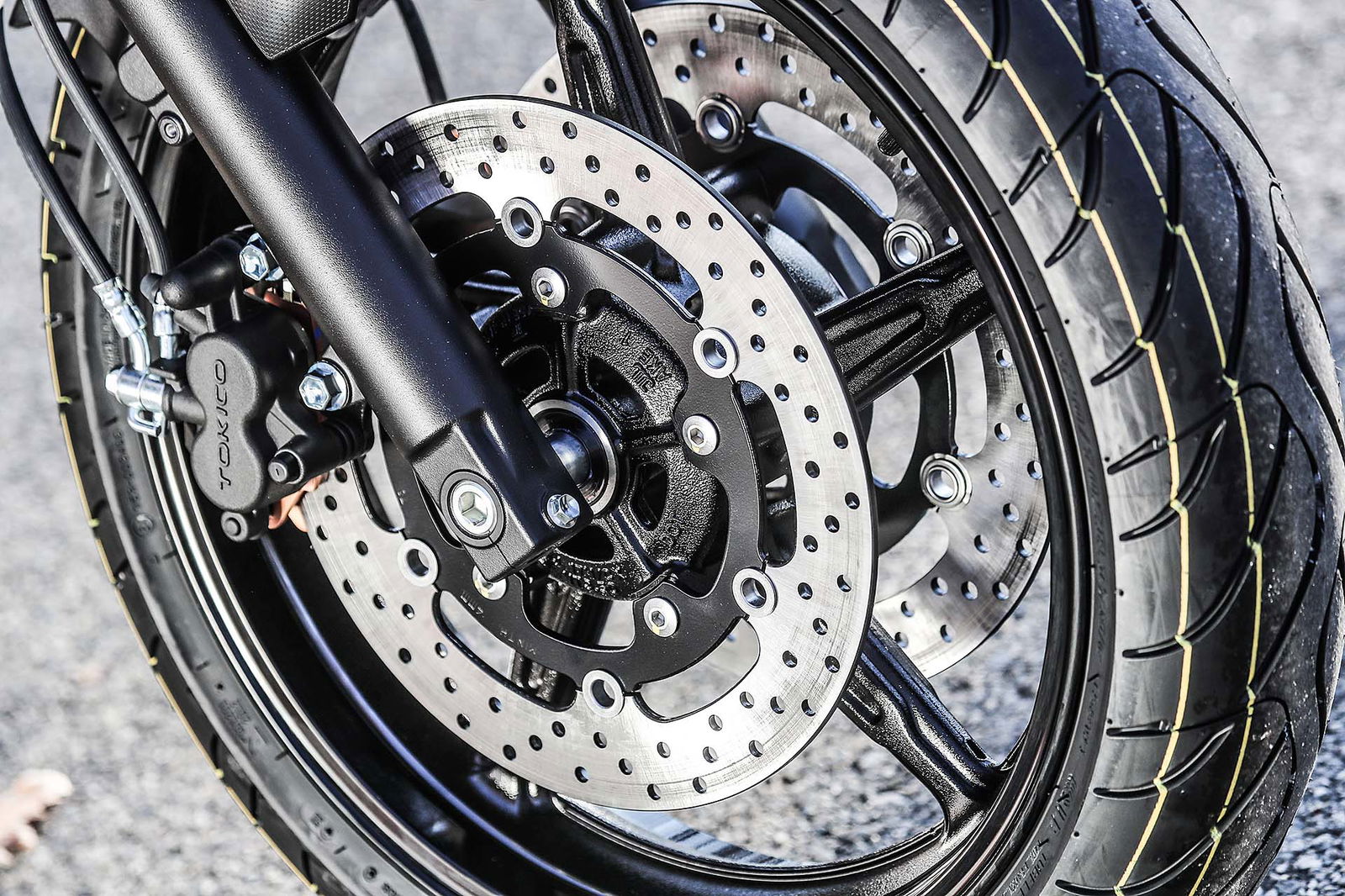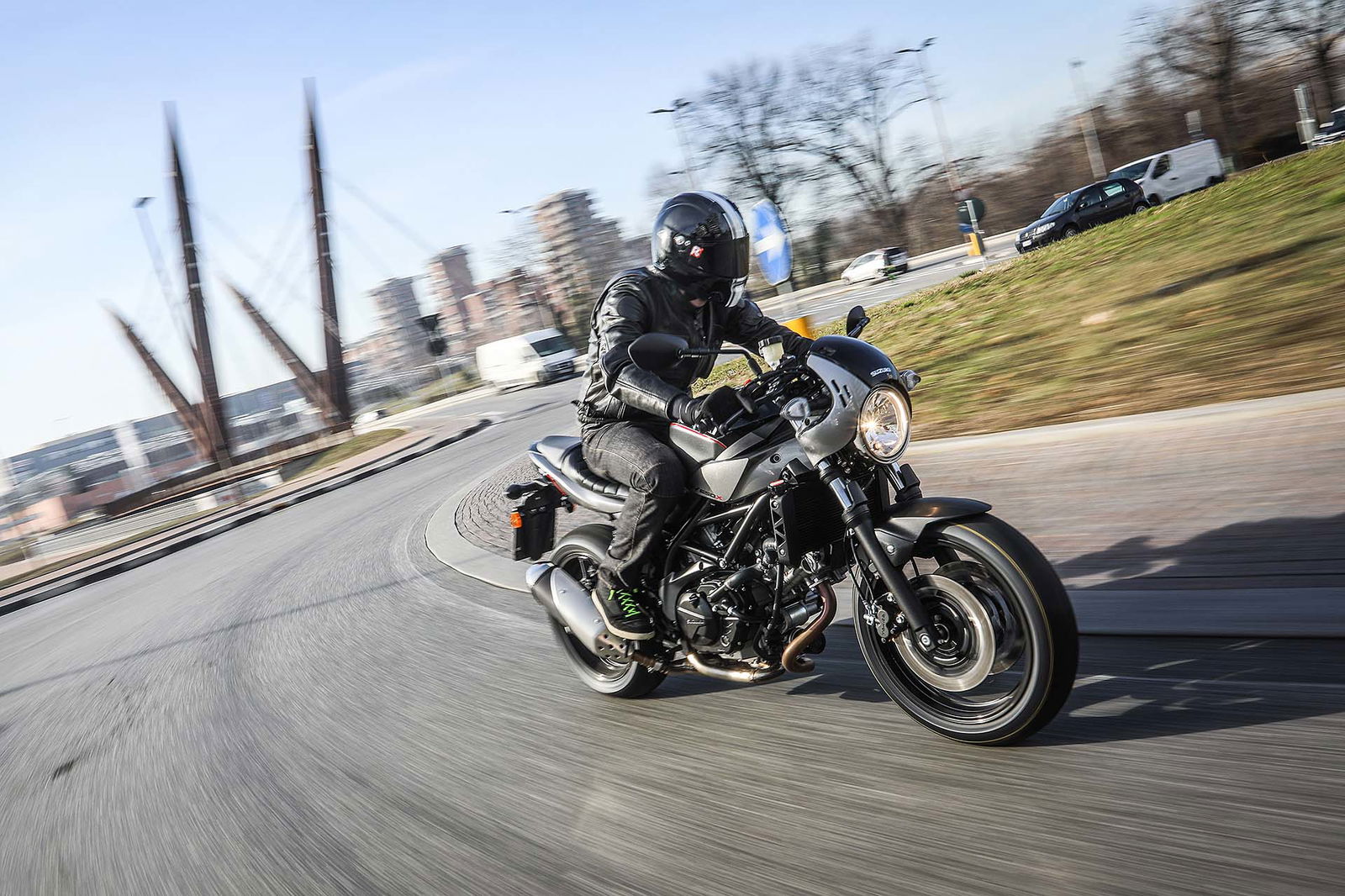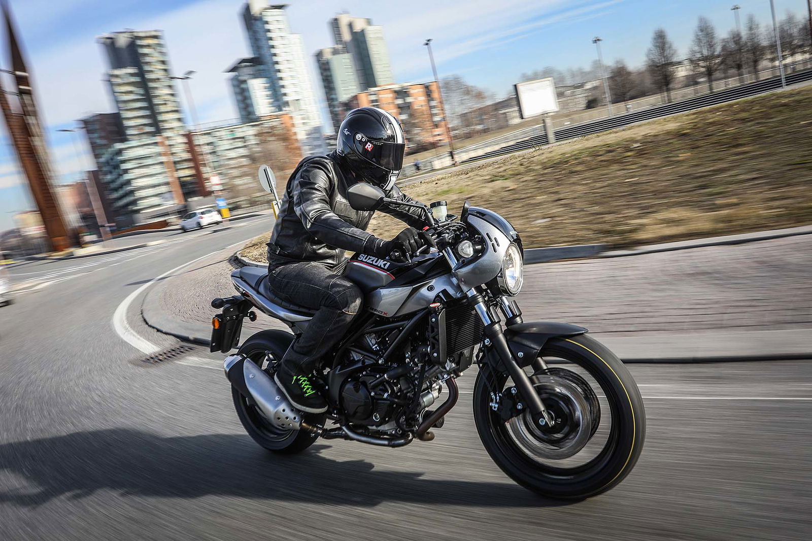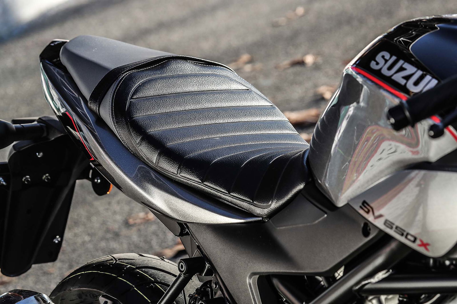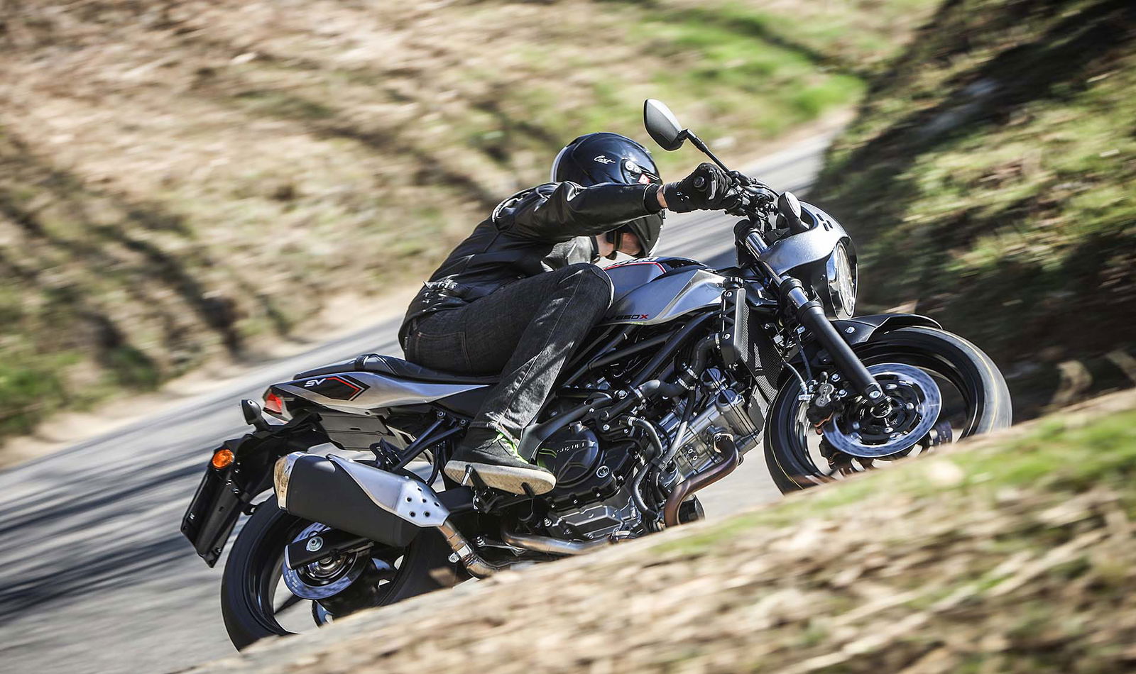 FUORI È RACERNuovo abito, dicevamo. La Suzuki SV650X eredita gli stilemi del concept chiamato SV650 Rally, mostrato da Suzuki nella primavera del 2016. Monta un cupolino minimalista sopra il faro tondo, ha la sella con impunture a vista (tra l’altro leggermente meno imbottita) a 785 mm da terra e dal serbatoio spuntano due discreti fianchetti che non s’intromettono nella posizione di guida. Non è tutto: la colorazione della X è unica, un mix ben calibrato di grigio e nero con classico adesivo Suzuki sul serbatoio, come anche le pedane pilota e passeggero nere. https://www.youtube.com/watch?v=Fu4ut-L_dxYQUESTIONE DI ERGONOMIALa peculiarità principale della Suzuki SV650X è la sua ergonomia: al posto del classico manubrio tubolare ci sono due semimanubri posizionati sopra la piastra di sterzo, un po’ come avveniva sulla versione S di qualche anno fa (che però montava anche un cupolino più protettivo…). Ne consegue una posizione di guida decisamente più sportiva e caricata sull’anteriore, motivo per cui la forcella è più precaricata (e ora è anche regolabile).