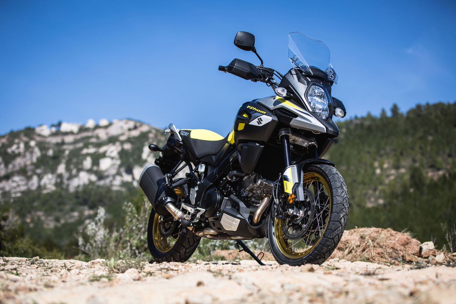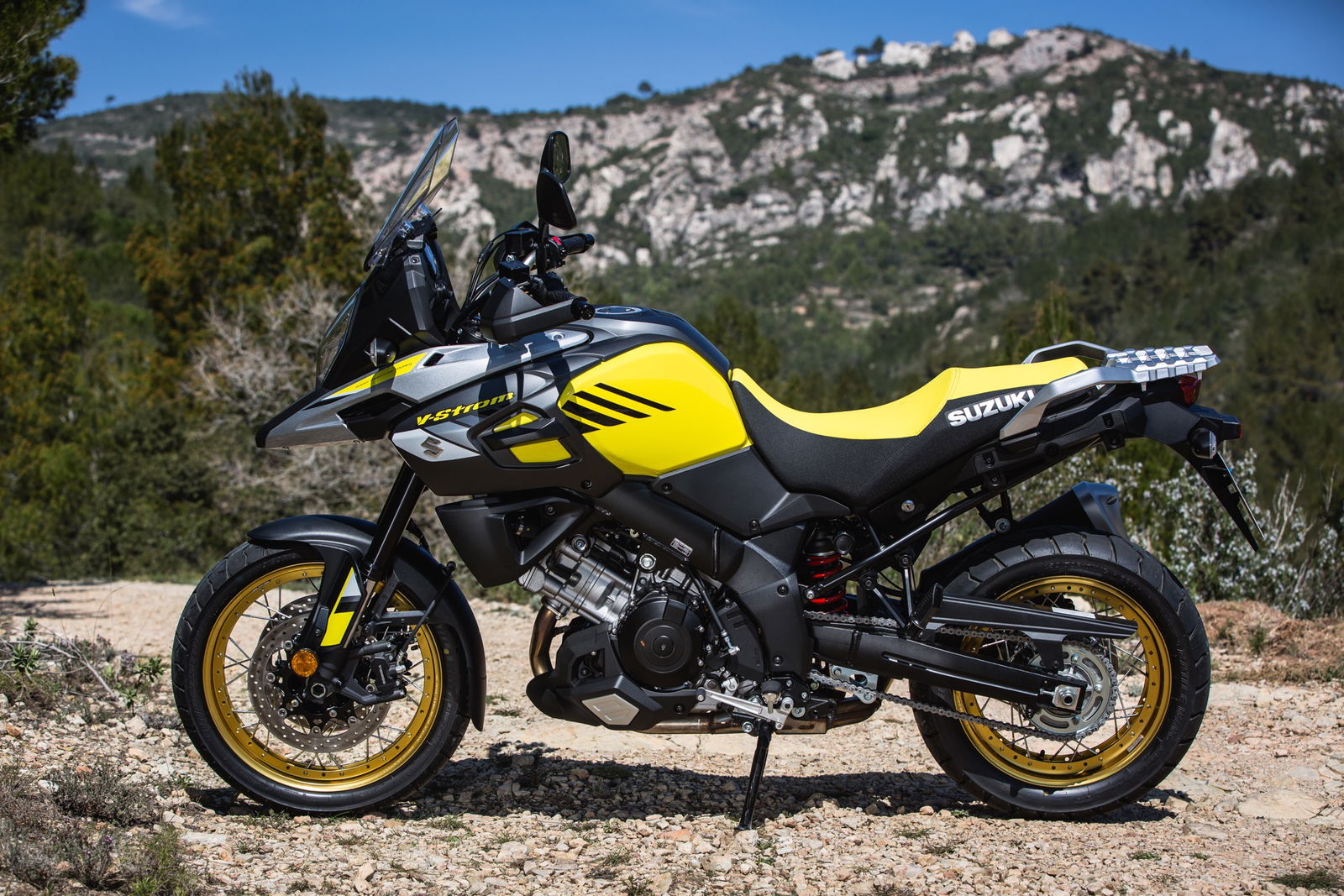 Come già accennato, la Suzuki V-Strom 1000 2017 può essere ordinata con cerchi in lega, oppure in allestimento XT, con i raggi. In entrambi i casi la ruota posteriore è da 17”, con pneumatico 150/70, e quella anteriore è da 19”, gommata 110/80. I cerchi in lega sono sempre neri; quelli a raggi sono invece neri per gli esemplari bianchi e neri, mentre hanno una spettacolare finitura dorata in abbinamento al Champion Yellow, che ricorda i modelli RM da offroad.