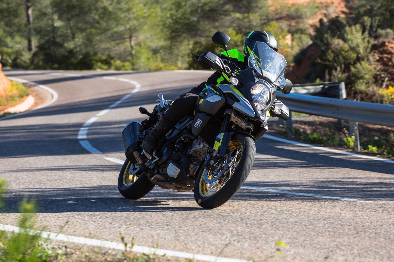 Se da ferma non mette in soggezione, la Suzuki V-Strom 1000 si fa presto dare del tu anche una volta in movimento, nonostante sulle prime non appaia agile come la proverbiale bicicletta. Con 1.555 mm di interasse, oppone un po’ di resistenza nei primi cambi di direzione. Basta però aiutarsi un po’ con i movimenti del busto e guadagnare un minimo di velocità per trovarsi tra le mani una moto rigorosa e bilanciata, che con poco sforzo pennella le curve in modo esemplare. Il suo pane quotidiano sono più gli slalom giganti che quelli speciali ma anche nelle svolte strette sa infondere fiducia ed esce a testa alta anche dai tornanti… a chiocciola.
