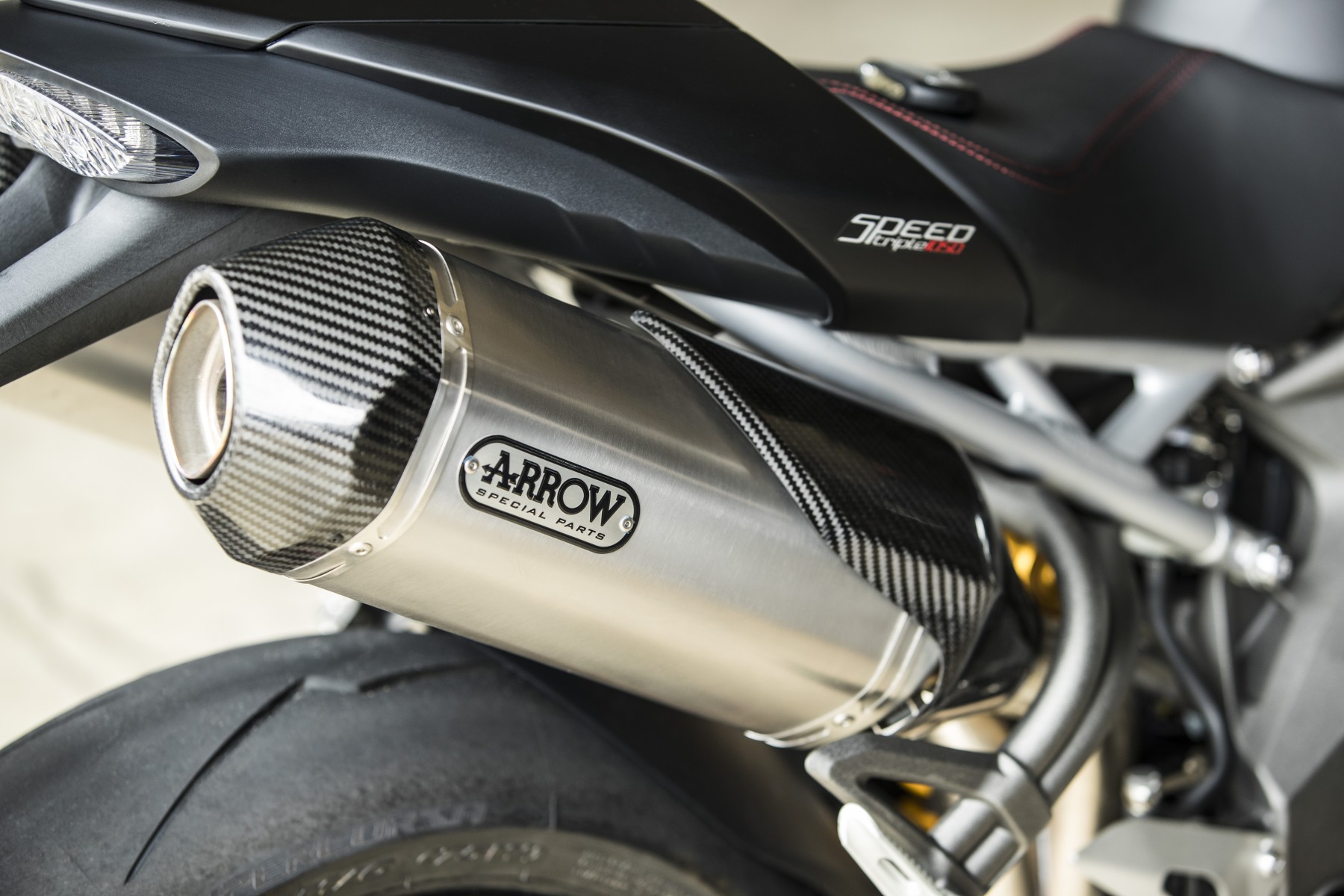 Passano gli anni ma le rumorosità meccaniche, anche se mitigate, rimangono inconfondibili. Mi riferisco al cuore a tre cilindri da 1.050 cc, che anche grazie all’Euro4 è meno rumoroso di prima – non saprei dire di quanti decibel in meno – ma mantiene la sua voce. Ad appagare l’orecchio ci sono i due terminali di scarico Arrow, che cantano sonorità vintage. Si sente nell’aria quando la nuova Speed Triple si sta avvicinando: ricorda i motori da competizione degli anni ’70. I cavalli oggi sono 150 e la coppia di 117 Nm, con mille giri guadagnati in allungo.
