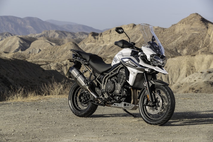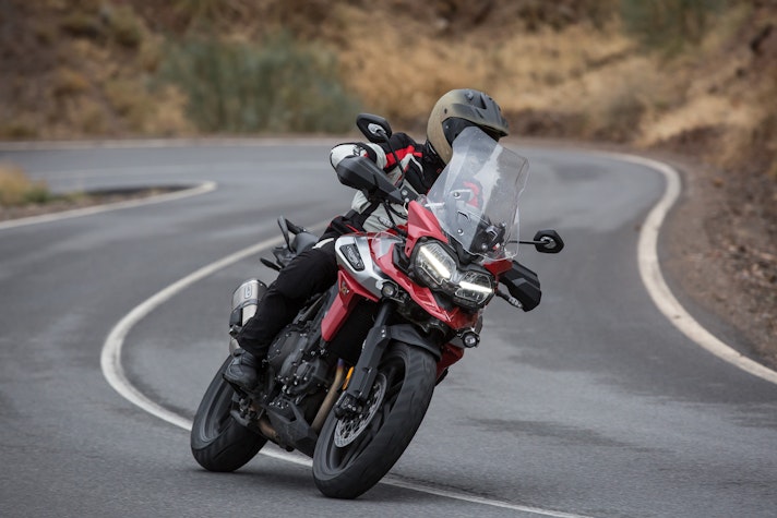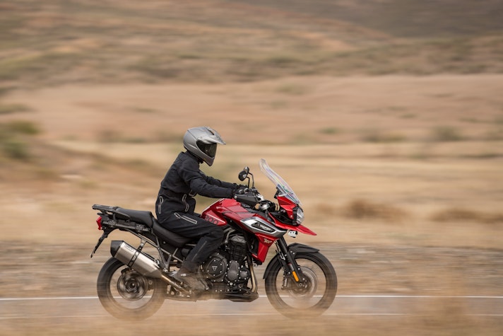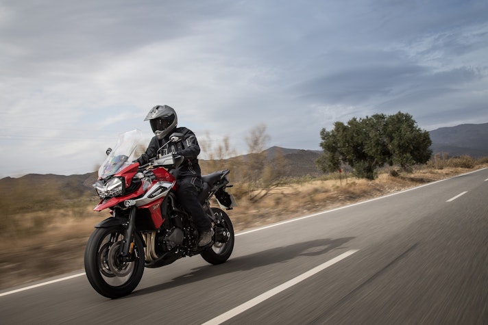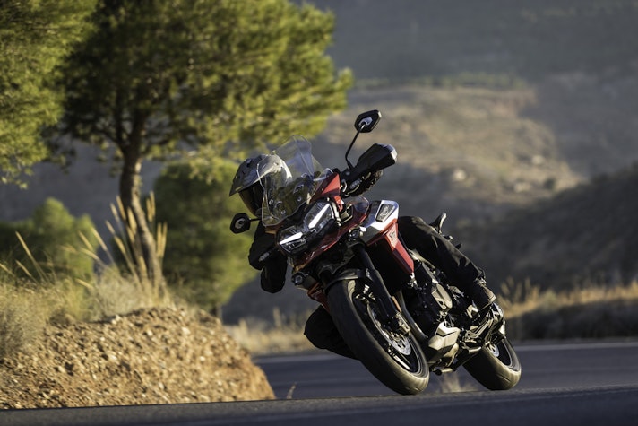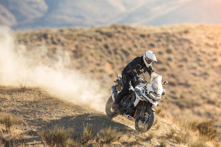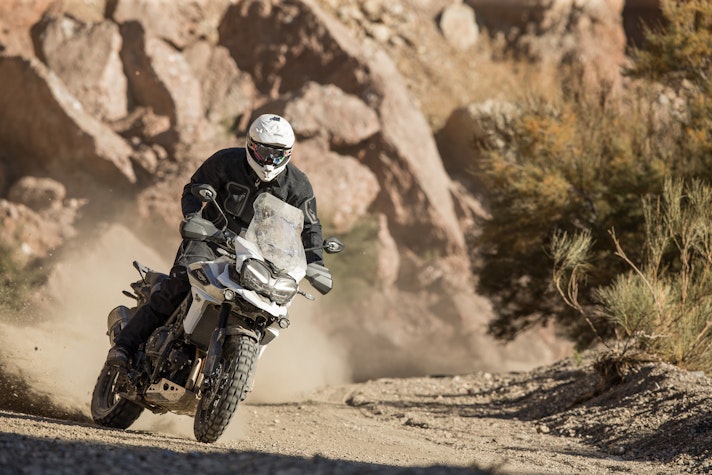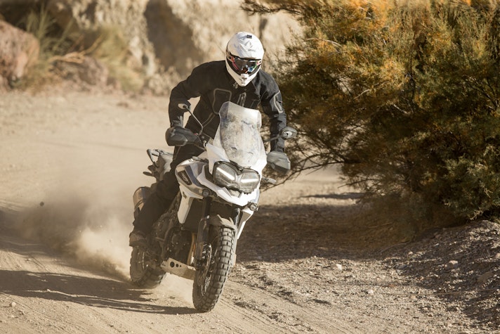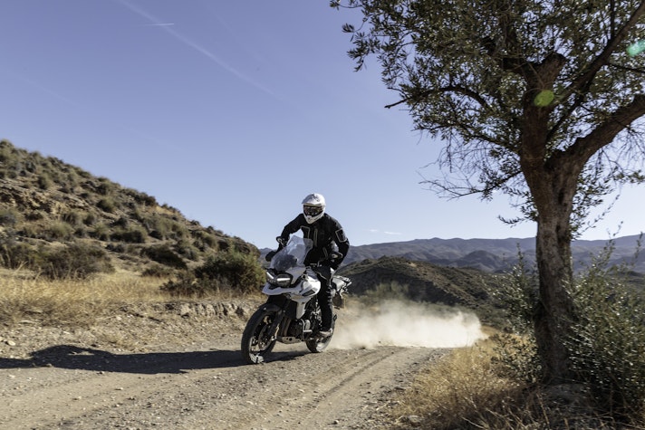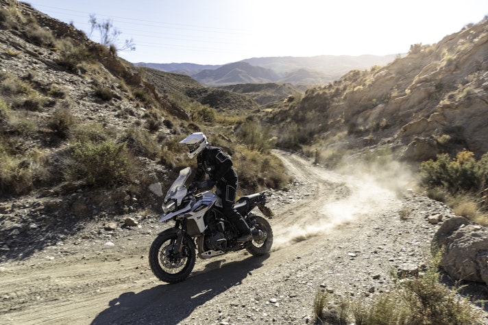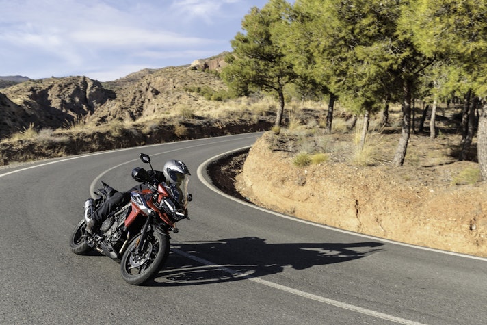 Lontano dall’asfaltoTasselli spigolosi vestono le Pirelli Scorpion Trail che ci accompagnano alla scoperta del deserto di Tabernas e delle compatte strade bianche esplorate per capire come la “Tigerona” si comporta fuoristrada. Il peso c’è e si sente sempre ed è un compagno con cui fare i conti nel malaugurato caso che si scivoli e la moto si corichi a terra come una balena spiaggiata. I 240 kg ci sono tutti, ma sono ben distribuiti tra avantreno e ruota posteriore. A disposizione la mappatura offroad e la Pro che toglie anche l’ultimo pizzico di controllo di trazione per offrire tutta la libertà che serve per far pattinare la ruota posteriore in lunghe derapate ma che conserva il funzionamento dell’ABS solo sulla ruota anteriore.La Tiger è una scommessa vinta da Triumph anche in questo contesto, perché guidando in piedi sulle pedane si sta meglio che seduti e il manubrio più vicino, benché rialzato rispetto alla posizione stradale, aiuta a controllare la ruota anteriore quando prende sotto evitando così che l’avantreno perda direzionalità. Il motore è ancora protagonista perché non tossisce e recalcitra sui sentieri a regimi minimi e offre coppia preziosa anche in terza marcia, quella giusta, che si può usare per uscire dalle curve in progressione con il posteriore che derapa in modo molto progressivo.