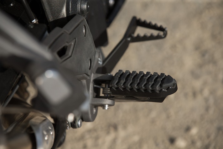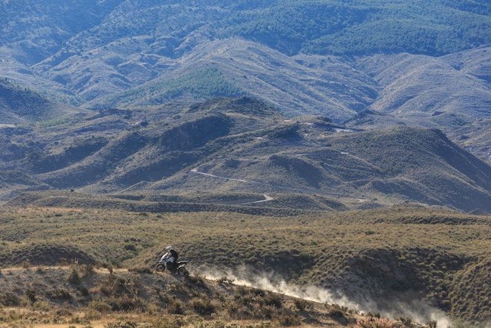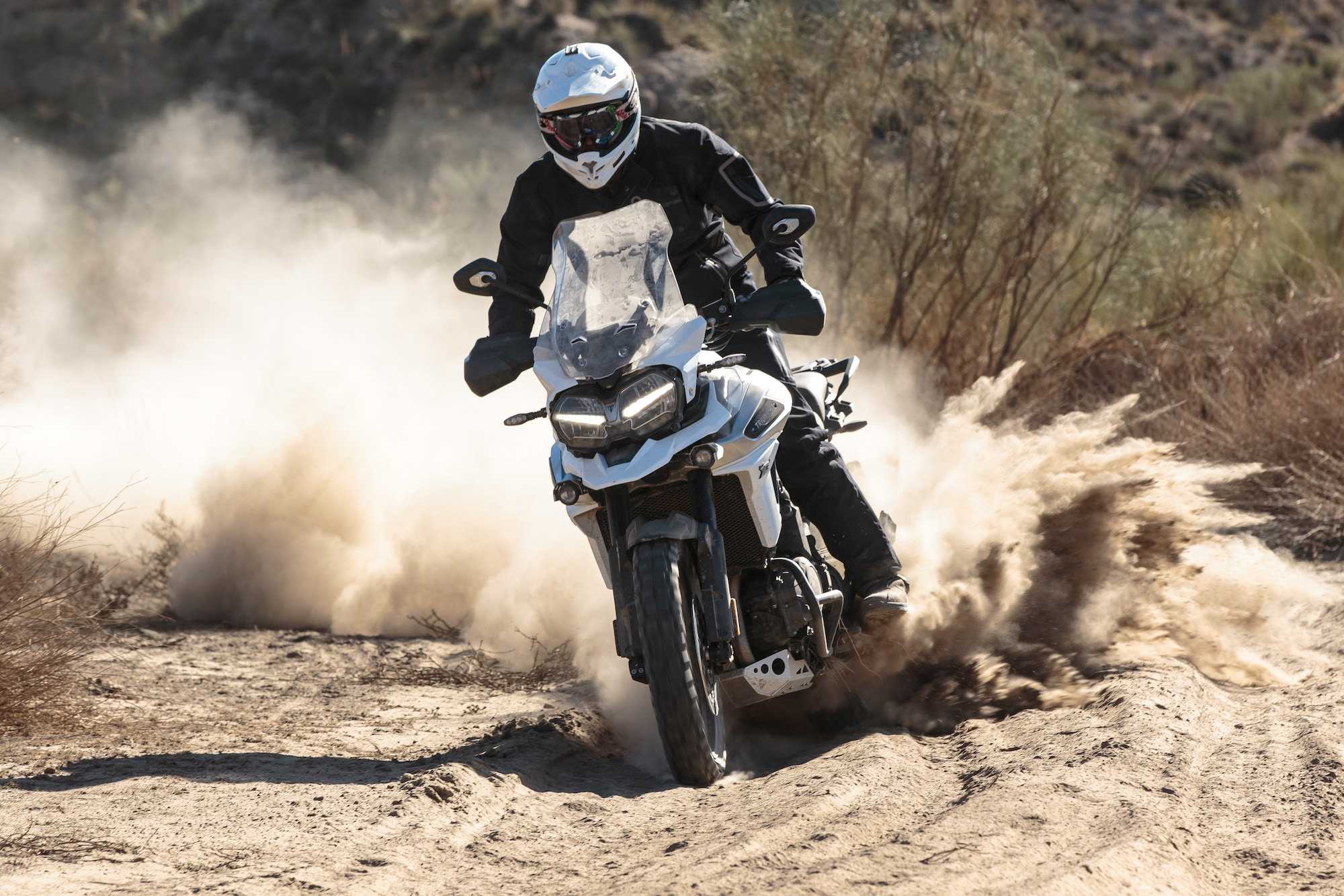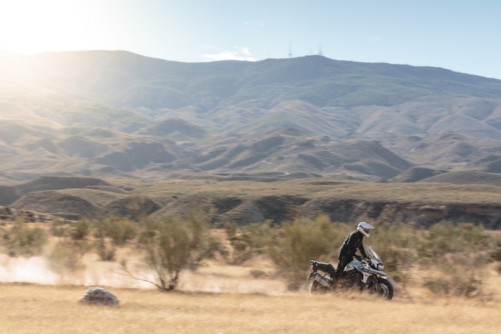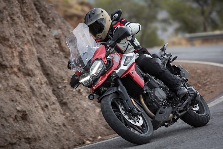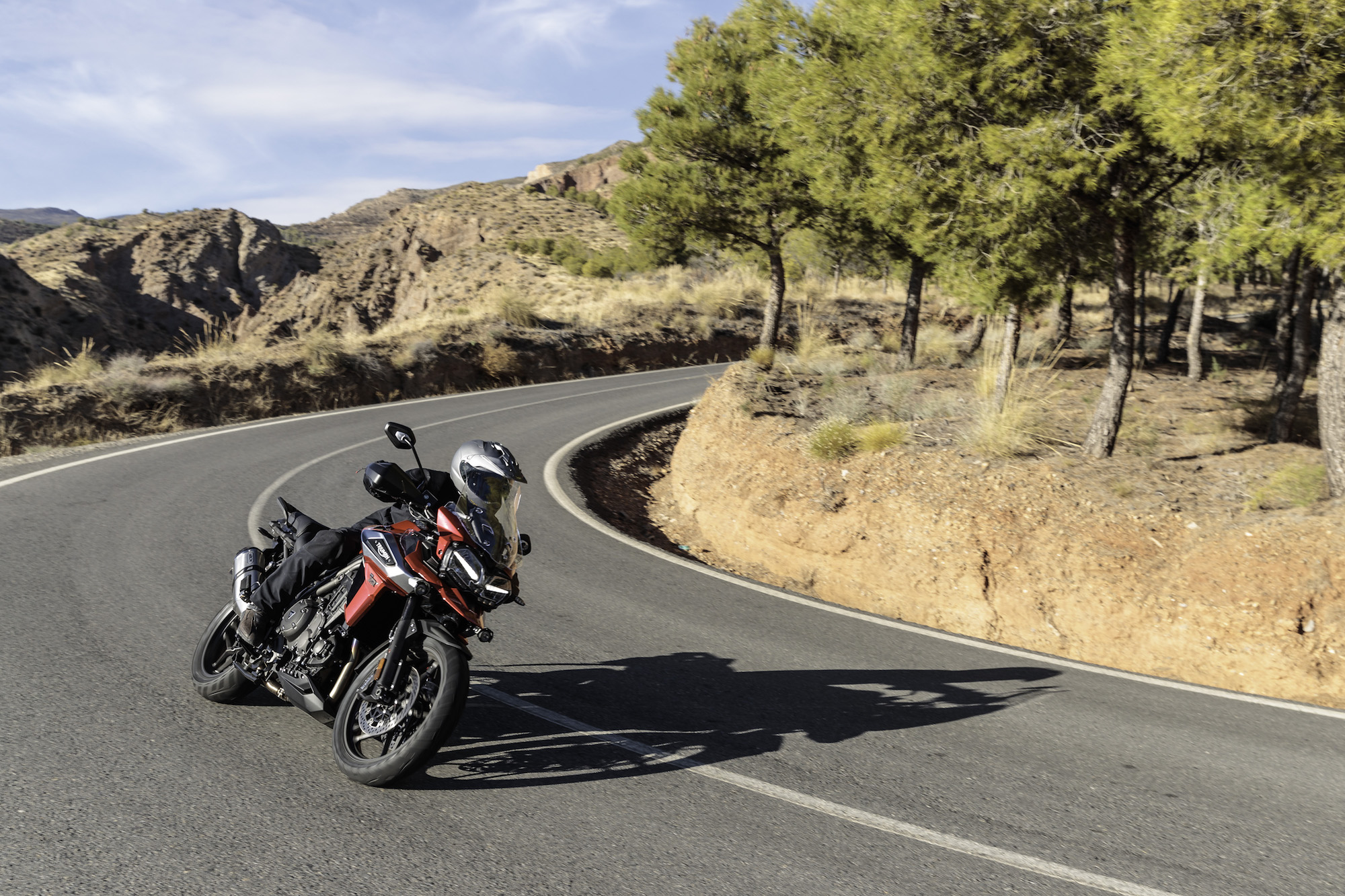 Lontano dall’asfaltoTasselli spigolosi vestono le Pirelli Scorpion Trail che ci accompagnano alla scoperta del deserto di Tabernas e delle compatte strade bianche esplorate per capire come la “Tigerona” si comporta fuoristrada. Il peso c’è e si sente sempre ed è un compagno con cui fare i conti nel malaugurato caso che si scivoli e la moto si corichi a terra come una balena spiaggiata. I 240 kg ci sono tutti, ma sono ben distribuiti tra avantreno e ruota posteriore. A disposizione la mappatura offroad e la Pro che toglie anche l’ultimo pizzico di controllo di trazione per offrire tutta la libertà che serve per far pattinare la ruota posteriore in lunghe derapate ma che conserva il funzionamento dell’ABS solo sulla ruota anteriore.La Tiger è una scommessa vinta da Triumph anche in questo contesto, perché guidando in piedi sulle pedane si sta meglio che seduti e il manubrio più vicino, benché rialzato rispetto alla posizione stradale, aiuta a controllare la ruota anteriore quando prende sotto evitando così che l’avantreno perda direzionalità. Il motore è ancora protagonista perché non tossisce e recalcitra sui sentieri a regimi minimi e offre coppia preziosa anche in terza marcia, quella giusta, che si può usare per uscire dalle curve in progressione con il posteriore che derapa in modo molto progressivo.