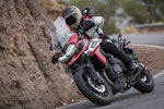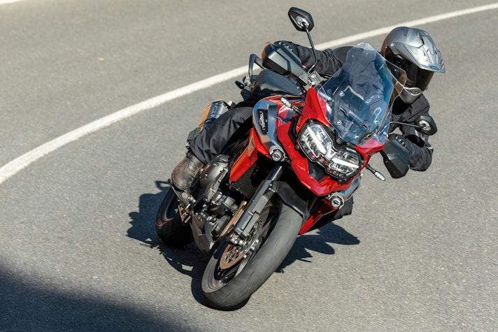 A mio parere valgono più i 121 Nm di coppia che non i 141 cavalli di potenza riportati nella scheda tecnica. A questo motore non piace girare alto eppure raggiunge e sorpassa i 10.000 giri, spingendo forte da 8.000. Ma è altrettanto vero che nell’arco della giornata mi sono dovuto sforzare per raggiungere questi regimi di rotazione, perché il meglio è sotto. Questo triple è bello fino a metà della scala del contagiri, da 1.500 fino a 5.500 giri, perché in questo range è pastoso, pieno e gustoso. Esco dalle rotonde cittadine in terza, affronto i tornanti di montagna nello stesso rapporto e vado a stuzzicare il minimo senza che tossisca e rifiuti la marcia; accelero e senza toccare la frizione punto quarta e quinta marcia, aiutato dal quick shifter – disponibile anche in scalata – che annulla i trasferimenti di carico. Così mi posso guardare intorno anche se immerso nelle nuvole di un temporale infinito. Meglio di così!