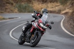 È sorprendente la protezione dall’aria, al pari della pastosità del motore quando si viaggia a regimi costanti sui tratti veloci. È in questo contesto che emerge la filosofia del progetto, aiutato da un motore che vibra poco e “scarica” quel poco di vibrazioni prevalentemente sul manubrio. La sella è ancora più comoda che in precedenza e la triangolazione con le pedane non affatica nemmeno dopo tanti chilometri. Ciò non significa che le strade di montagna o i percorsi quotidiani non siano terreno di caccia della Tiger 1200: il baricentro un po’ alto e un avantreno poco cedevole rendono solo meno emozionante la guida tra le curve, ma a soddisfare davvero è la precisione con cui, nonostante le condizioni climatiche, l’avantreno si lascia condurre, infondendo fiducia e comunicando la sensazione di solidità e grip costante. Anche la sospensione posteriore merita la lode per la capacità di adattarsi in pochi secondi alle diverse tarature, WP in questo senso è una grande conferma. Nell’arco della giornata il traction control ha funzionato solo un paio di volte, a conferma della bontà della ciclistica e del buon grip meccanico offerto dal forcellone e telaio.