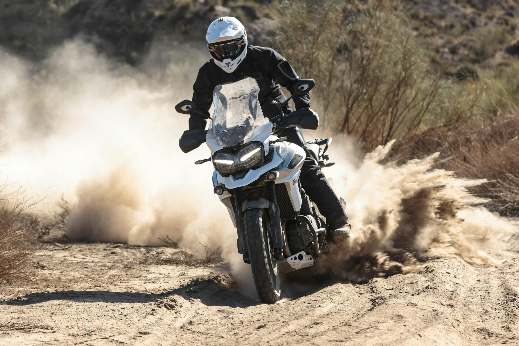 Tasselli spigolosi vestono le Pirelli Scorpion Trail che ci accompagnano alla scoperta del deserto di Tabernas e delle compatte strade bianche esplorate per capire come la “Tigerona” si comporta fuoristrada. Il peso c’è e si sente sempre ed è un compagno con cui fare i conti nel malaugurato caso che si scivoli e la moto si corichi a terra come una balena spiaggiata. I 240 kg ci sono tutti, ma sono ben distribuiti tra avantreno e ruota posteriore. A disposizione la mappatura offroad e la Pro che toglie anche l’ultimo pizzico di controllo di trazione per offrire tutta la libertà che serve per far pattinare la ruota posteriore in lunghe derapate ma che conserva il funzionamento dell’ABS solo sulla ruota anteriore.La Tiger è una scommessa vinta da Triumph anche in questo contesto, perché guidando in piedi sulle pedane si sta meglio che seduti e il manubrio più vicino, benché rialzato rispetto alla posizione stradale, aiuta a controllare la ruota anteriore quando prende sotto evitando così che l’avantreno perda direzionalità. Il motore è ancora protagonista perché non tossisce e recalcitra sui sentieri a regimi minimi e offre coppia preziosa anche in terza marcia, quella giusta, che si può usare per uscire dalle curve in progressione con il posteriore che derapa in modo molto progressivo.