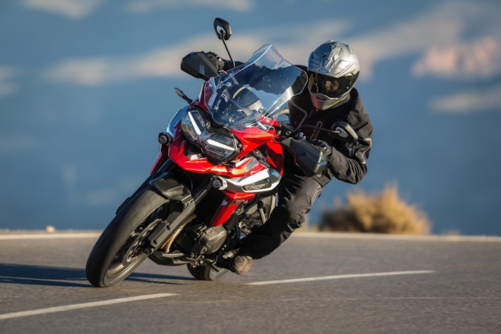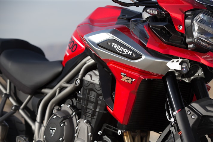 La passerella dell’EICMA 2017 è stata utile per capire, ancor prima di guidarla, dove la Tiger 1200 sia cambiata: le linee sono più slanciate e tese, l’aspetto più aggressivo, valorizzato da nuove grafiche e accostamenti cromatici inediti. La carta d’identità parla di una riduzione di peso di ben 10 kg, figlia di un lavoro accurato su molti componenti, a partire da telaio, impianto di scarico e motore. Il tre cilindri in linea da 1.215 cc eroga 141 cavalli a 9.350 giri, la potenza più alta finora ottenuta su una Triumph con trasmissione a cardano, con la coppia massima a 121 Nm e gli intervalli di manutenzione ogni 16.000 km.