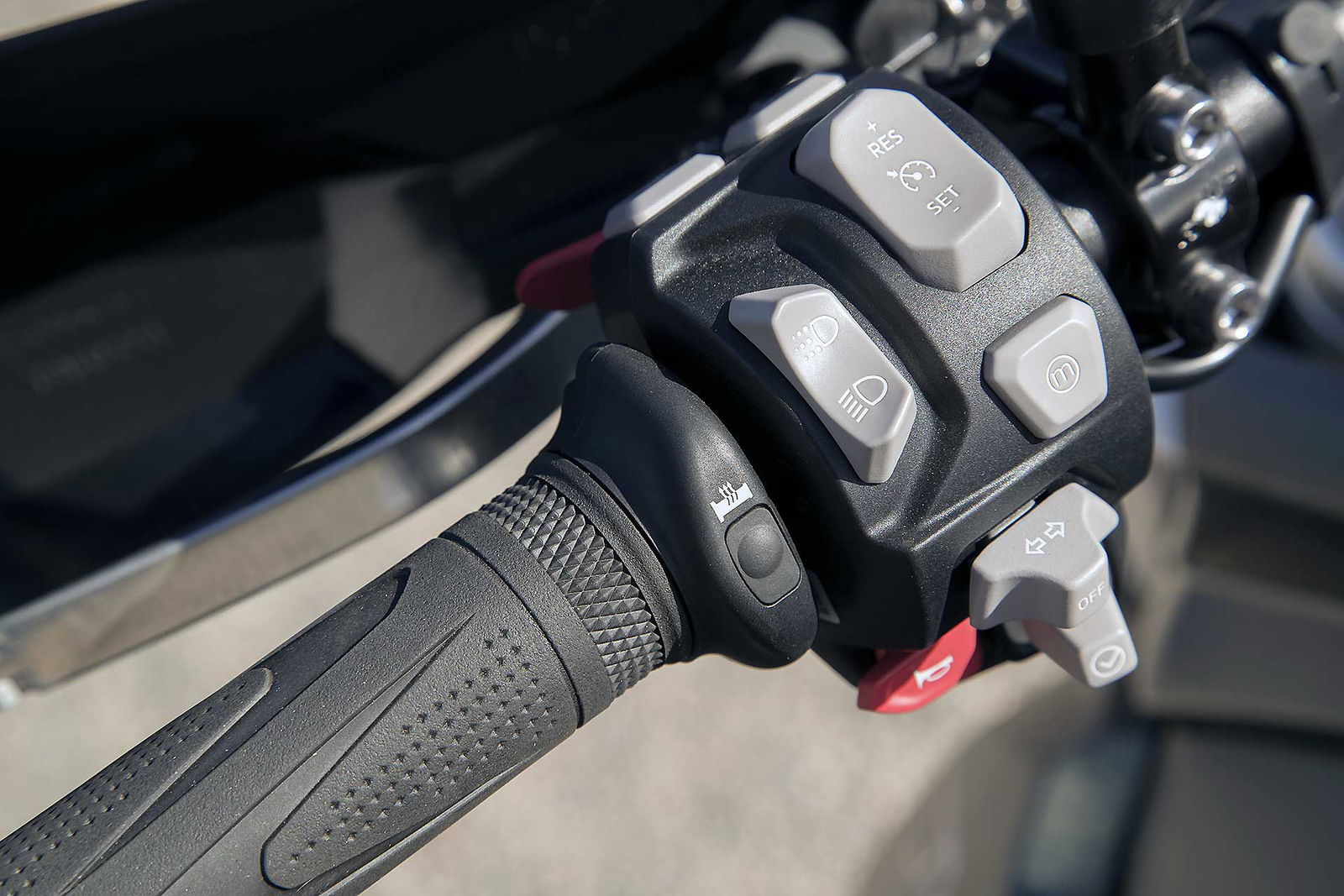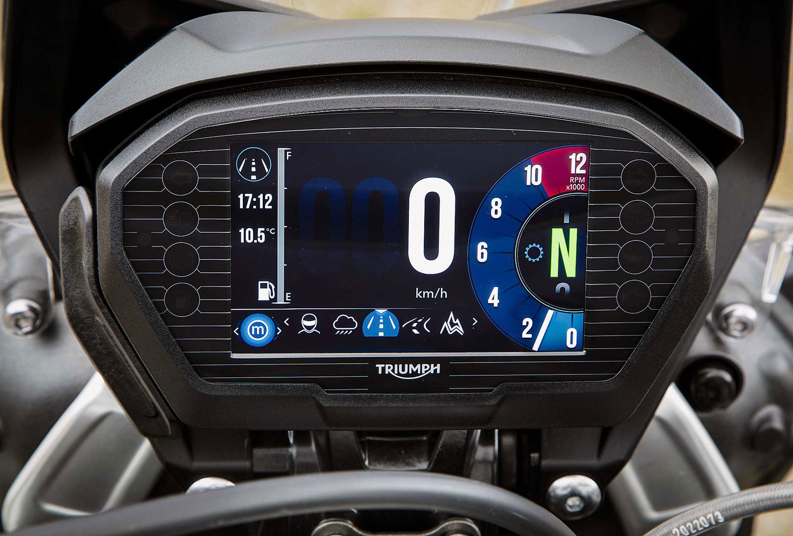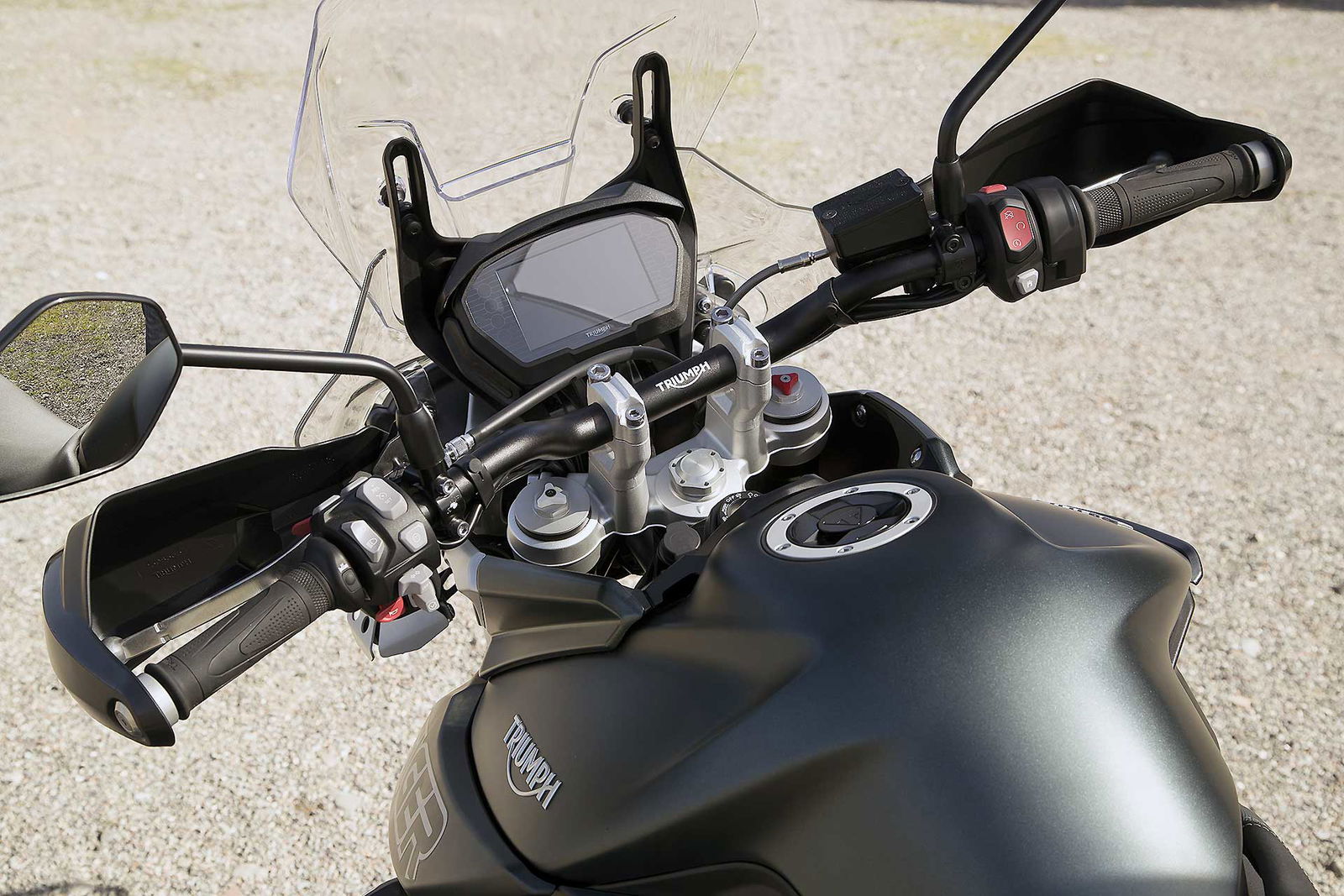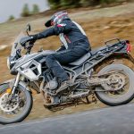 I 95 cavalli, potenza molto simile a quella della Honda Africa Twin per intenderci, sono a mio parere la giusta cavalleria per spostare un peso nell’ordine dei 200 kg. Siamo all’interno del “cerchio magico” del 200X100 (200 kg per 100 cv) che su tutte le moto provate offrono sempre la giusta alchimia fatta da bella guida e prestazioni e guidabilità. Tiger rispetta questi valori alla lettera e non è quindi un caso che motore e ciclistica siano così ben accordati. Il motore è ora giunto a quella che possiamo definire la terza generazione: non vibra in nessuna delle posizioni “critiche” (pedane, sella o manubrio), dispone di mappature per ogni condizione di guida e ha una rumorosità meccanica distinta accompagnata da un rumore allo scarico sempre ben riconoscibile!COME TI GUIDOChe sia lo stile di guida oppure il meteo a dettare le regole del test, la Tiger ha la mappa giusta per ogni richiesta. il blocchetto di controllo (illuminato, primizia per il segmento) posizionato sul lato sinistro del manubrio, conosciuto e apprezzato con la 1200 (–> provata qui), permette in pochi istanti di selezionare tutte le possibili opzioni per personalizzare risposta del motore, traction control, eventuale disattivazione dell’ABS e riscaldamento delle manopole e sella. Parto con la XC, la sella in posizione alta, manopole e sella tiepide e la configurazione più sportiva del motore.UN TRIPLE GENEROSO
