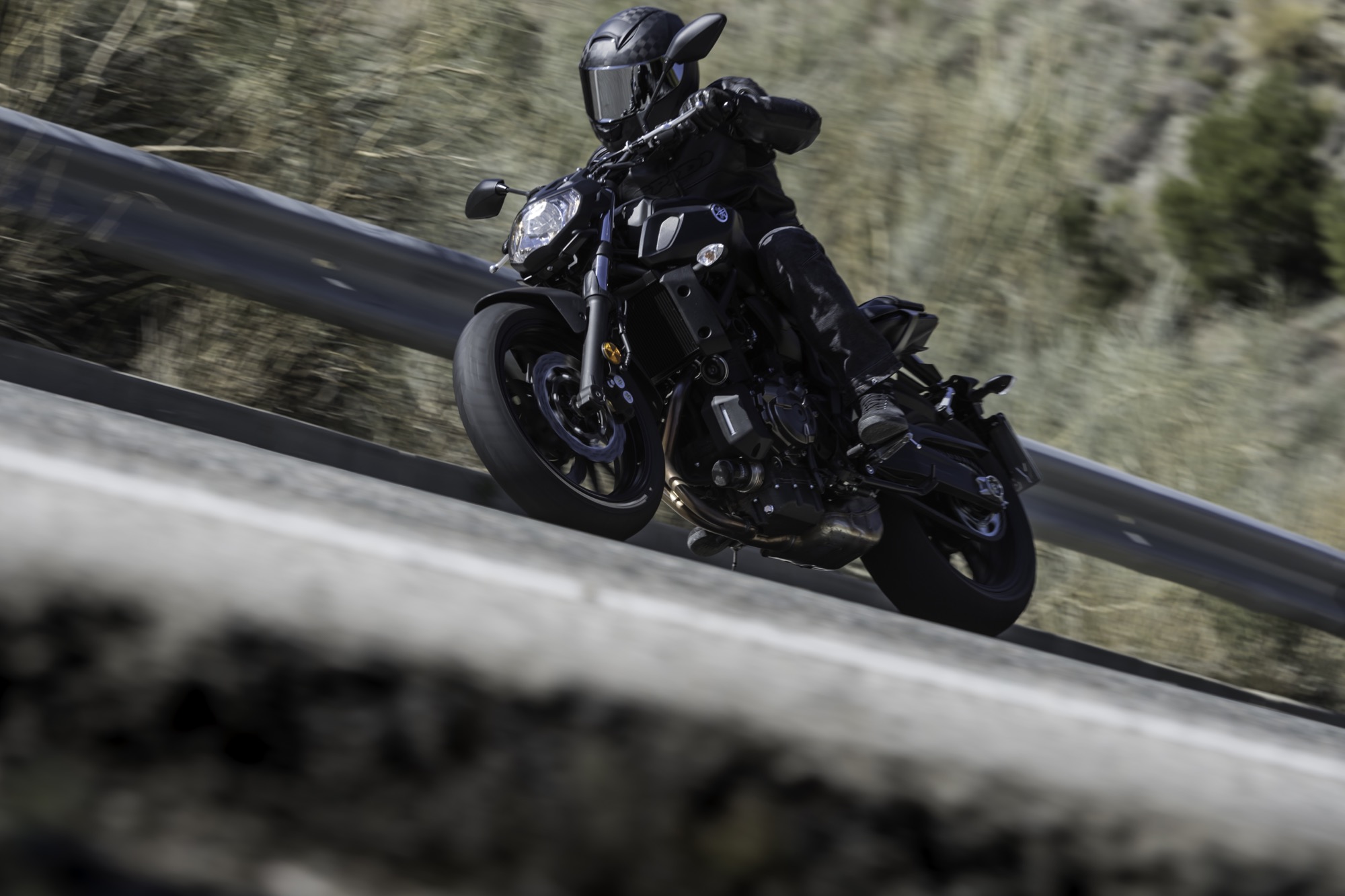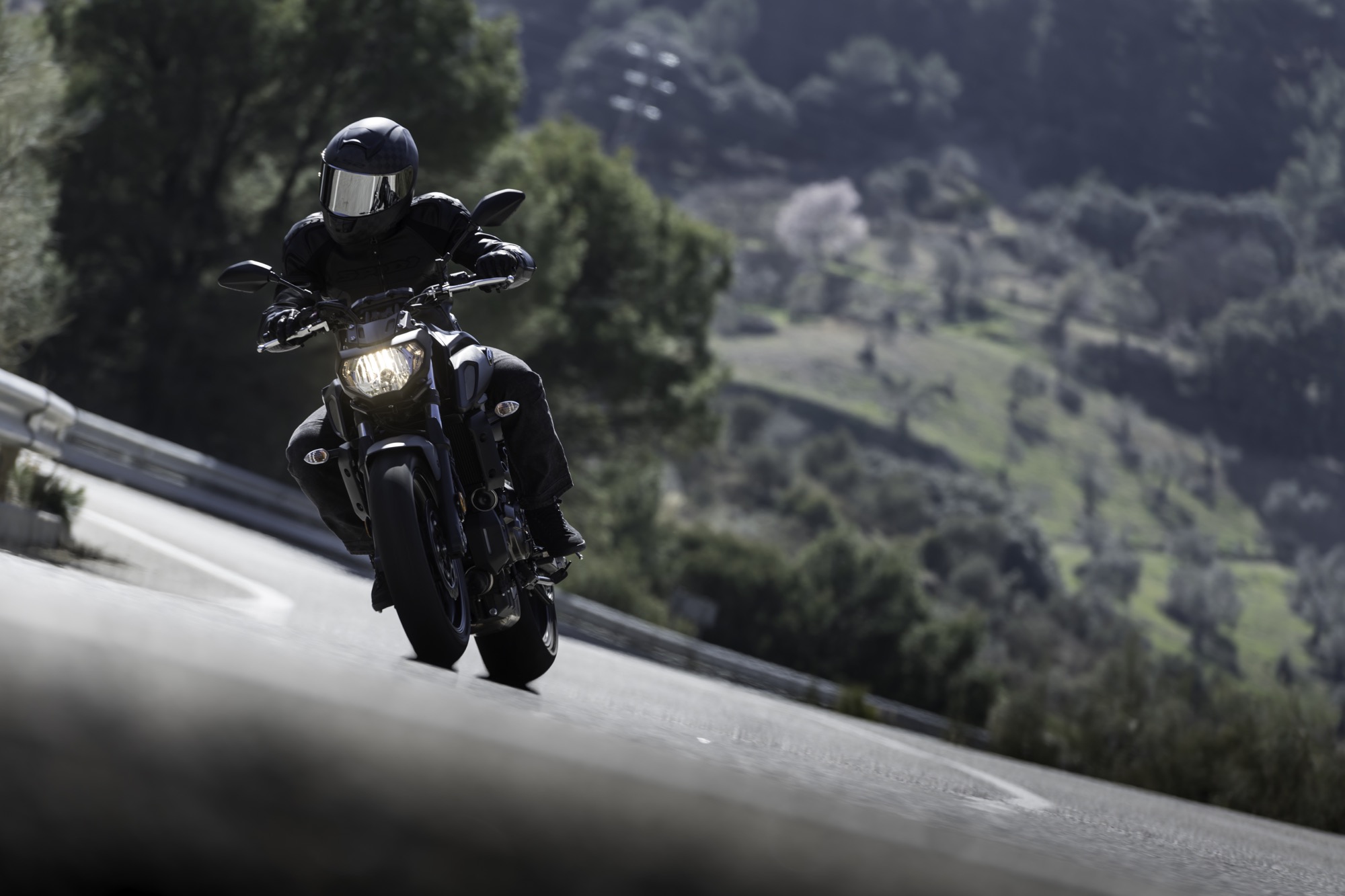 La MT-07 dimostra fin dai primi chilometri di muoversi bene nel misto stretto e strettissimo: leggera, maneggevole, docile nella risposta al gas, ha tutte le caratteristiche che servono per creare immediata confidenza, persino tra le curve continue da seconda marcia che si arrampicano su e giù per i boschi.