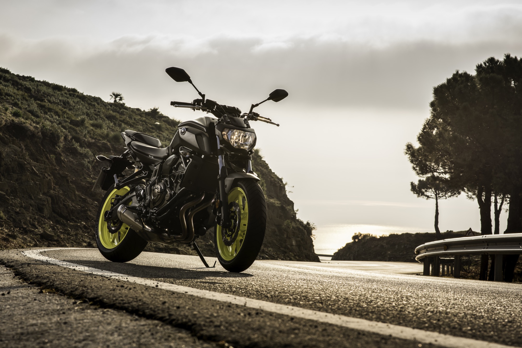 Gli interventi di carattere estetico sono stati molto più numerosi di quanto una prima occhiata lasci intuire. Si va dal parafango anteriore in singolo pezzo alle prese d’aria ridisegnate e ampliate, dal nuovo disegno del gruppo ottico anteriore aalle paratie del radiatore riposizionate. Oltre alla zona centrale completamente nuova, sono inediti sulla MT-07 il gruppo ottico posteriori ispirato alla MT-09 e i fianchetti. La colorazione nera del manubrio e delle pedane dimostra l’attenzione ai dettagli, un tratto caratterizzante della produzione Yamaha.