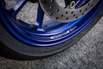 Andando con ordine, la prima cosa che si nota della MT-09 SP è chiaramente l’esclusiva colorazione Silver Blu Carbon. La livrea alterna sapientemente l’argento con il nero, utilizzato in questo caso anche per il manubrio, le leve e la piastra di sterzo, mentre il blu dei cerchi, delle grafiche e delle cuciture della sella provvede a dare una marcia in più all’insieme. In questo quadro a tinte scure spiccano alla grande le sospensioni, vere e proprie prime donne dell’allestimento SP. Debutta la forcella KYB a steli rovesciati da 43 mm con foderi dorati, completamente regolabile nell’idraulica e con doppio registro per il freno in compressione, per le basse e le alte velocità. Sul fronte opposto c’è il monoammortizzatore Öhlins con serbatoio e pomello di regolazione esposti orgogliosamente sul lato sinistro, come una medaglia appuntata al petto, con regolazione del precarico molla e del freno idraulico nelle due direzioni.