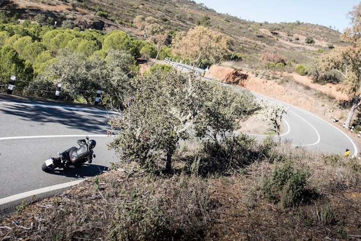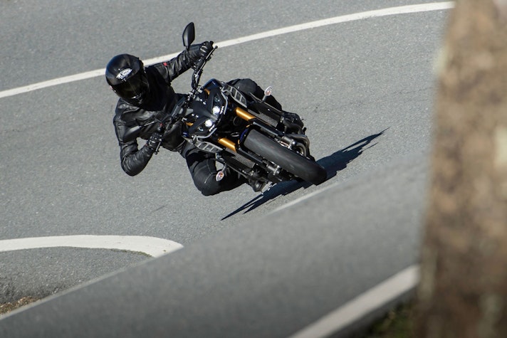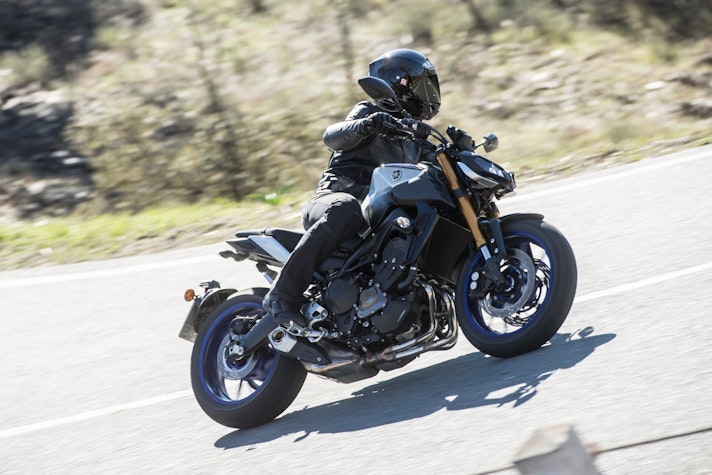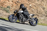 Una volta in movimento la MT-09 SP mostra in fretta quali vantaggi portino la nuova forcella e l’ammortizzatore Öhlins. Questa versione dispone di un assetto molto più neutro, più composto nei trasferimenti di carico, in staccata o in uscita di curva a gas spalancato. Così configurata, la moto si rivela più precisa e meno nervosa, pur restando agilissima, docile ai comandi e sempre coerente nelle reazioni, anche quando si è già in piega e si cerca di modificare la traiettoria. Con la loro scorrevolezza, le sospensioni regalano un gran feeling e in ogni momento si ha una chiara idea del grip delle gomme Bridgestone Battlax Hypersport, anche quando l’asfalto non è in condizioni ideali. Il risultato è una moto che si avvicina come rendimento alle naked più sportive, senza perdere il tradizionale carattere giocoso e divertente, quasi da maxi motard. Al limite dell’istigazione a delinquere.
