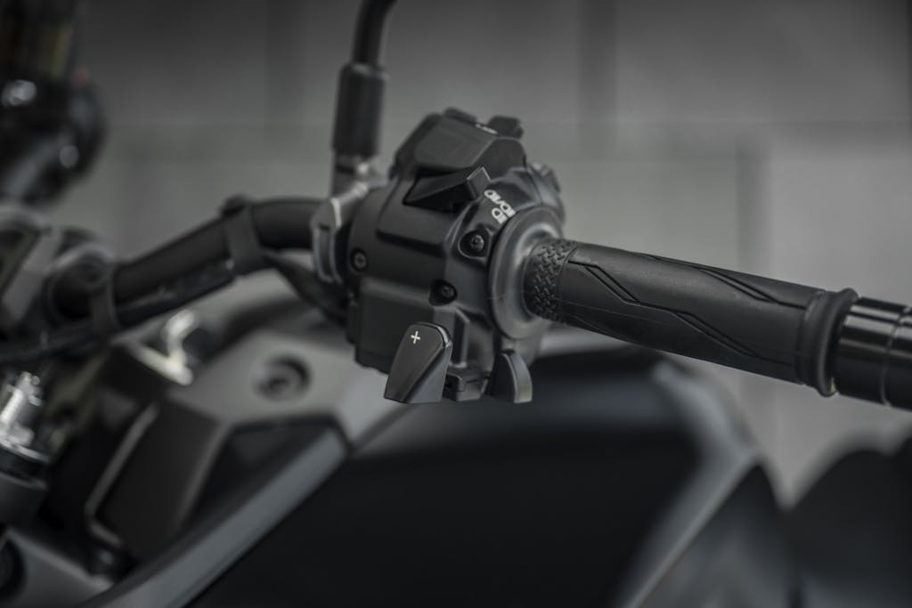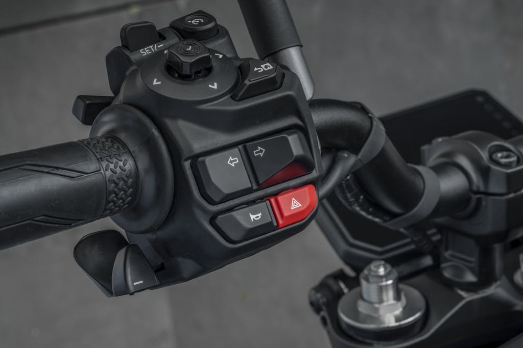 Sul blocchetto sinistro, in basso, il bilanciere collega i due tasti, siglati rispettivamente “-” (per scalare) e “+” (per inserire il rapporto superiore). Dato che sono collegati l’uno all’altro è possibile salire o scendere di rapporto utilizzando anche soltanto l’indice e non indice e pollice come con altre soluzioni, ad esempio i controlli di trazione di alcune supersportive. Lasciando il pollice a stringere la manopola la sicurezza aumenta, perché la presa è migliore.