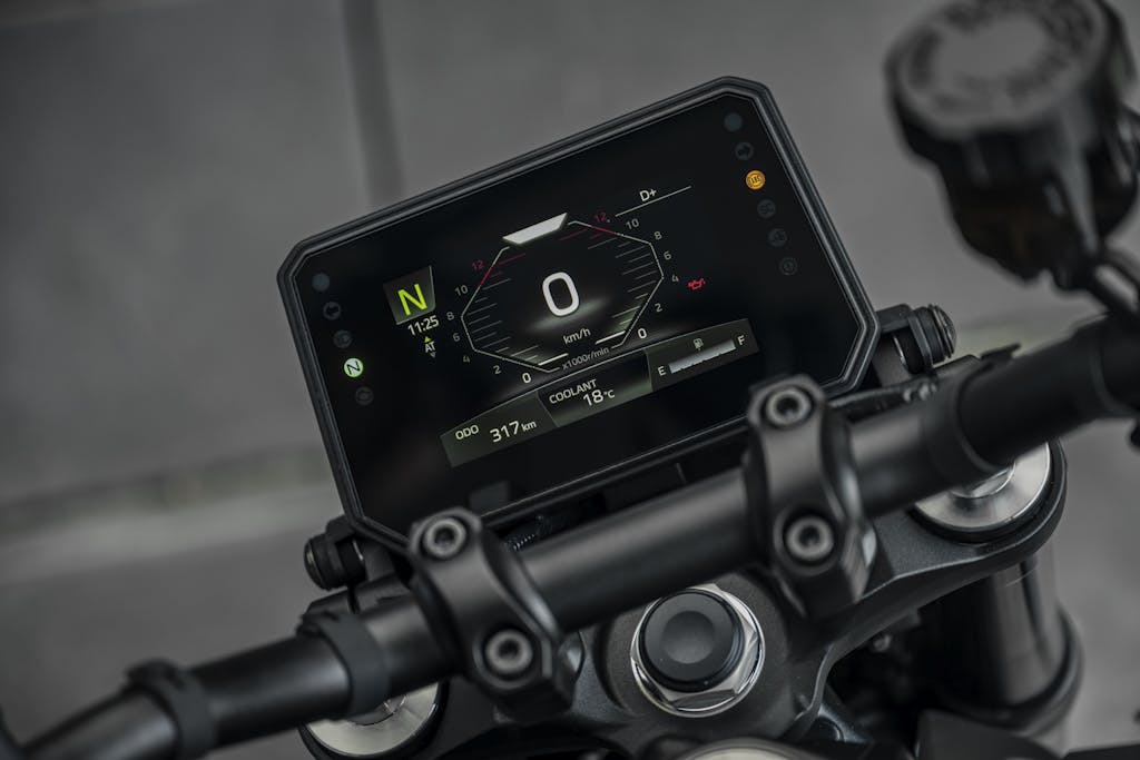 In modalità automatica sono previste due logiche di funzionamento: la più votata al comfort (D) effettua il cambio marcia sfruttando al massimo la coppia del motore, ed è quindi adatta alla guida rilassata, anche in città; la modalità D+, invece, alza il regime di cambiata, assecondando la naturale sportività della MT-09. Il passaggio da un Ride Mode automatico all’altro è semplicissimo, tramite il pulsante Mode in bella vista sul blocchetto destro. Lo stesso pulsante, quando la modalità inserita è manuale (MT), permette di passare da un Ride Mode all’altro tra i cinque già visti sulla MT-09 (Street, Rain, Sport, Custom 1, Custom 2).