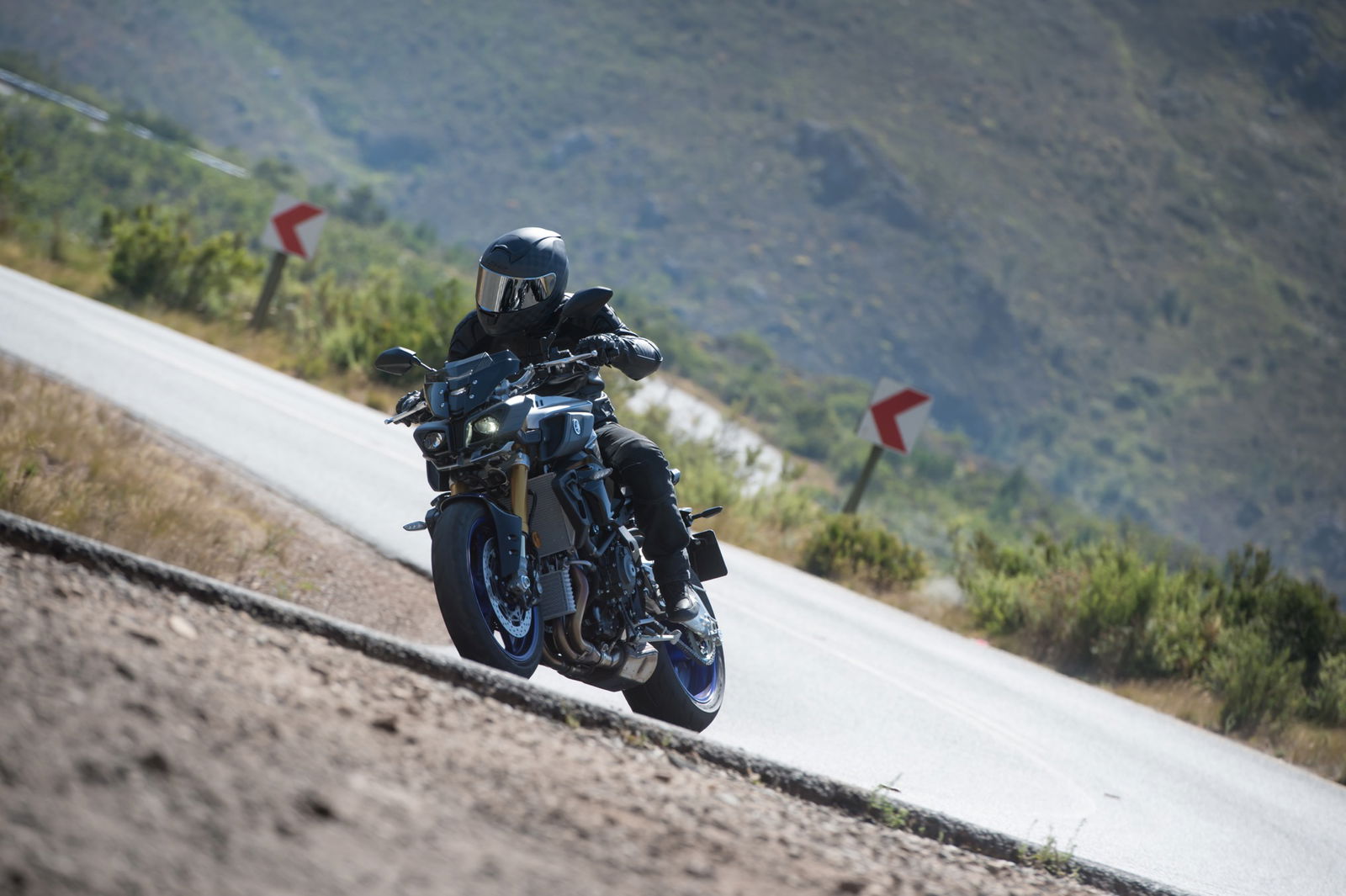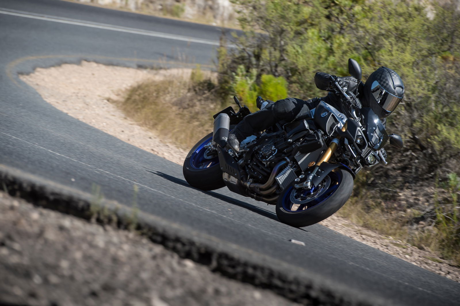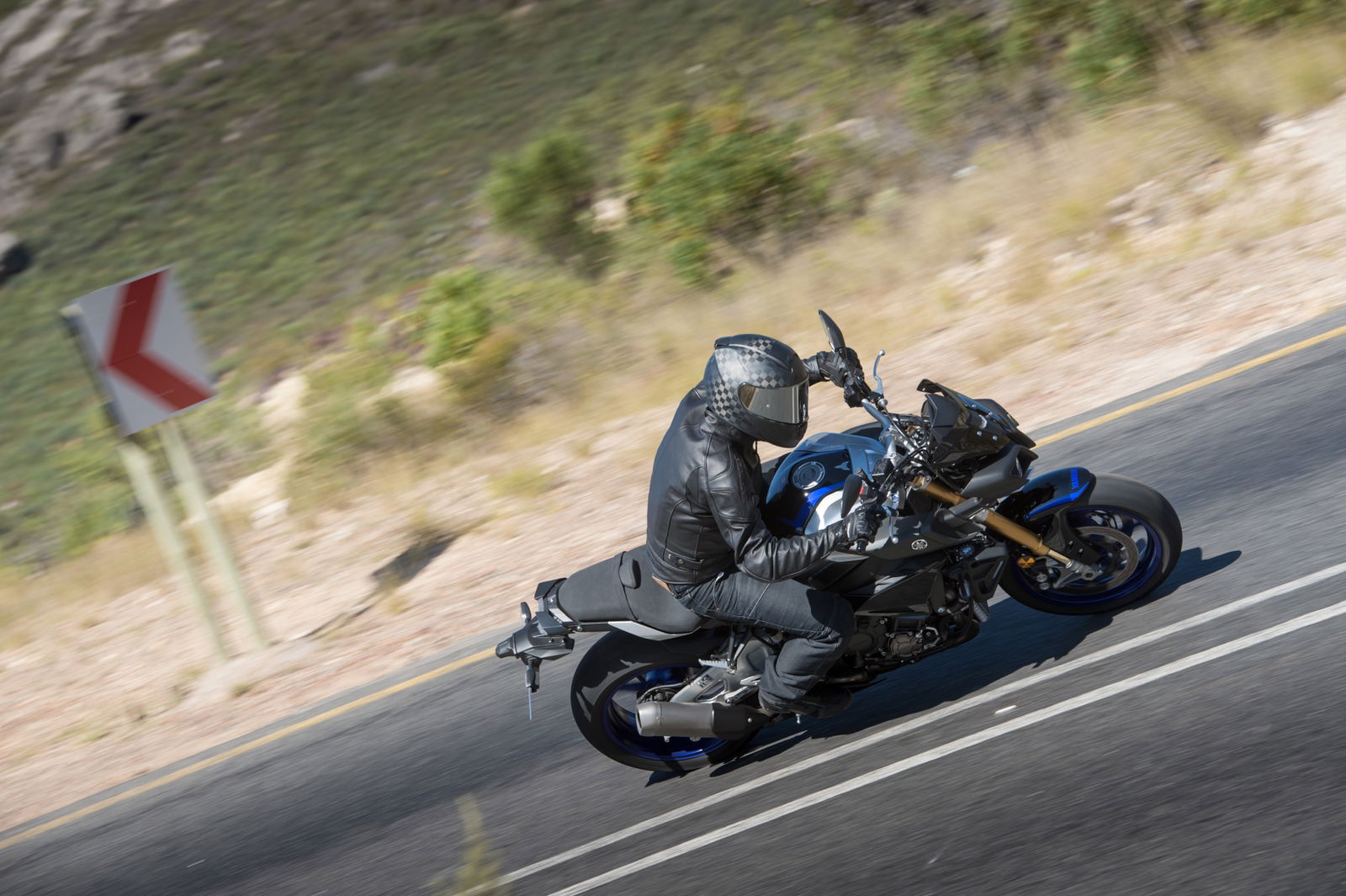 Cape Town di primo mattino è assediata dal traffico: la prova della Yamaha MT-10 SP, quindi, è iniziata tra le auto in coda, un modo per verificare la versatilità della moto in condizioni di utilizzo tipiche per abita in città. Maneggevole e intuitiva, colpisce fin da subito per l’estrema regolarità di erogazione, che si concretizza nella totale assenza di on-off: un pregio indiscutibile, a beneficio di piloti esperti e meno esperti. Come già detto cambiare Mode è facile ma si può fare soltanto a motore fermo: difficile se il gruppo di tester, complici strade che diventano quasi deserte fuori città, viaggia a medie stellari… Meglio, quindi, intervenire sulle singole opzioni, anche perché nella guida è immediato percepire le differenze: in Mode A, con tutte le opzioni su 1 (erogazione sportiva, controllo di trazione poco invasivo e sospensioni rigide su A-1), la Yamaha MT-10 SP è precisa e affilata, ma richiede in cambio un certo impegno, soprattutto perché forcella e ammortizzatore sono tarati per fondi stradali perfetti, difficili da trovare su strade aperte al traffico; l’erogazione è cattiva, racing, ed emozionante.