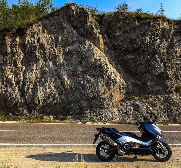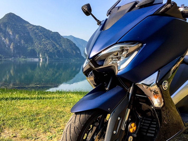 Milano-Riva del Garda. Dovessi farla in auto non avrei dubbi: autostrada A4, radio a palla e aria condizionata. Ma sono su due ruote (non dico in moto per il rischio di essere lapidato), quindi meno autostrada c’è, meglio è. Mi organizzo così: da Milano prendo l’A4 in direzione Venezia, uscita Brescia Ovest. Da lì s’imbocca la statale del Caffaro per fare le Coste di Sant’Eusebio, poi lago d’Idro, lago di Ledro e infine si sbuca a Riva del Garda. Un giro che consiglio a chiunque sia per il paesaggio, sia per la quantità di curve, da far venire il mal di stomaco. Anche perché l’intenzione è quella di provare lo Yamaha TMAX DX sul classico terreno di caccia delle moto sportive.DA FERMOParto presto la mattina, perché voglio evitarmi il devastante traffico tra Pero e Cormano (un grande classico per i milanesi). Stivo tutto con facilità sullo Yamaha TMAX DX: i miglioramenti nel sottosella si vedono tutti, anche se il tasto per alzare la sella nel tunnel centrale non è il massimo. Convincono anche la strumentazione, con il piccolo display a colori che cambia intensità a seconda della luce che percepisce, e i comandi al manubrio. Controllo di trazione, mappature motore e parabrezza si regolano con semplicità. La posizione di guida è molto confortevole: si è ben inseriti nel mezzo, non si ha la sensazione di essere appollaiati sul trespolo. La sella è abbondante quanto basta, come lo spazio per i piedi (e porto il 45…). Guardo le leve dei freni: sono entrambe regolabili nella distanza. Molto motociclistica, come sensazione.ORE CHIARE