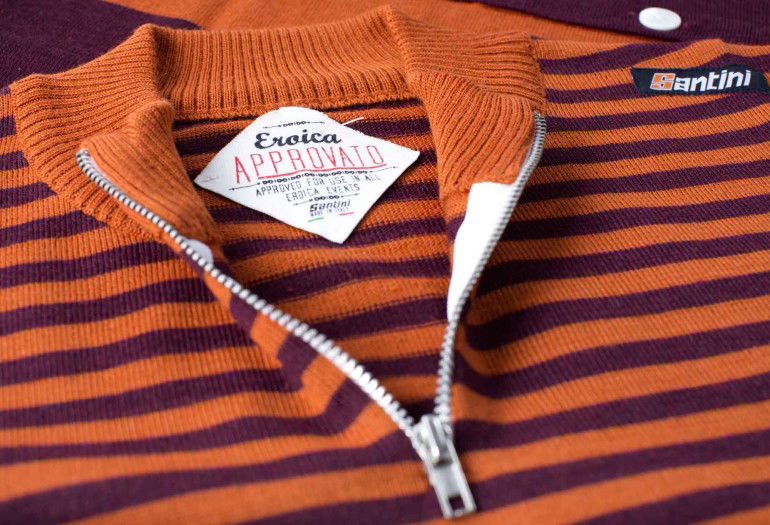 Una collezione italiana che porta indietro nel tempo con il suo stile discreto ispirato agli Anni ’40 e ’50. Per concepire questi modelli, Santini ha rinunciato ai materiali più avanzati o alle soluzioni tecnologiche più innovative che caratterizzano i suoi prodotti, con l’intento di mantenere l’integrità e la qualità proprie dell’Eroica per onorare la storia del Ciclismo.La maglia ufficiale per l’appuntamento di Gaiole in Chianti è realizzata in lana, arricchita dal ricamo del logo originale dell’evento su fronte e retro, con dettagli d’altri tempi come la zip corta in metallo e la tripla tasca posteriore chiusa con bottoni in madreperla. Originale dell’Eroica è anche il color vinaccia, accompagnato da un tocco di arancione proprio del marchio Santini, che per l’occasione ha ripreso il suo logo storico. Infine, a certificarne l’originalità un’etichetta posizionata all’interno del collo, che ne approva l’utilizzo in tutte le gare del circuito Eroica.