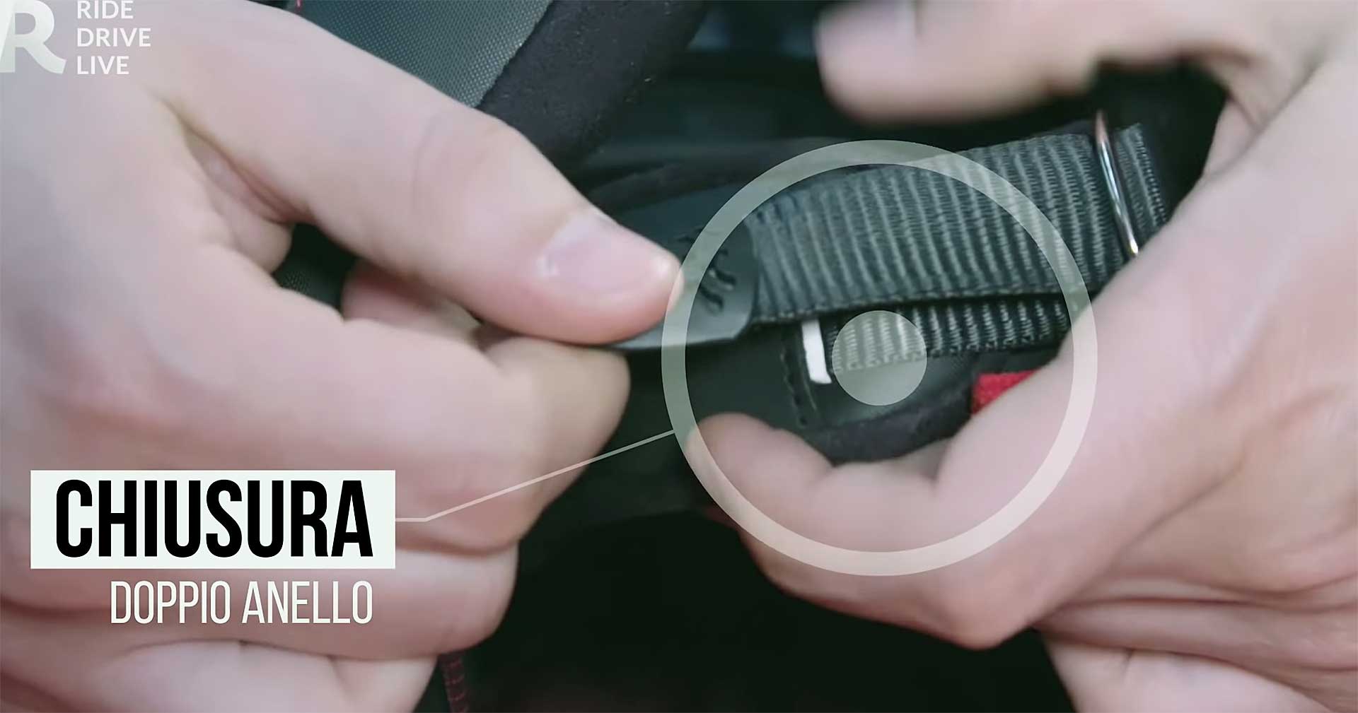 Lo Shark Race-R Pro è un integrale racing a tutti gli effetti e quindi la chiusura non poteva essere che la classica, a doppio anello. Una sicurezza in più per chi va in pista. Una curiosità, il laccetto ha un fermo magnetico, più pratico del comune bottone a pressione.