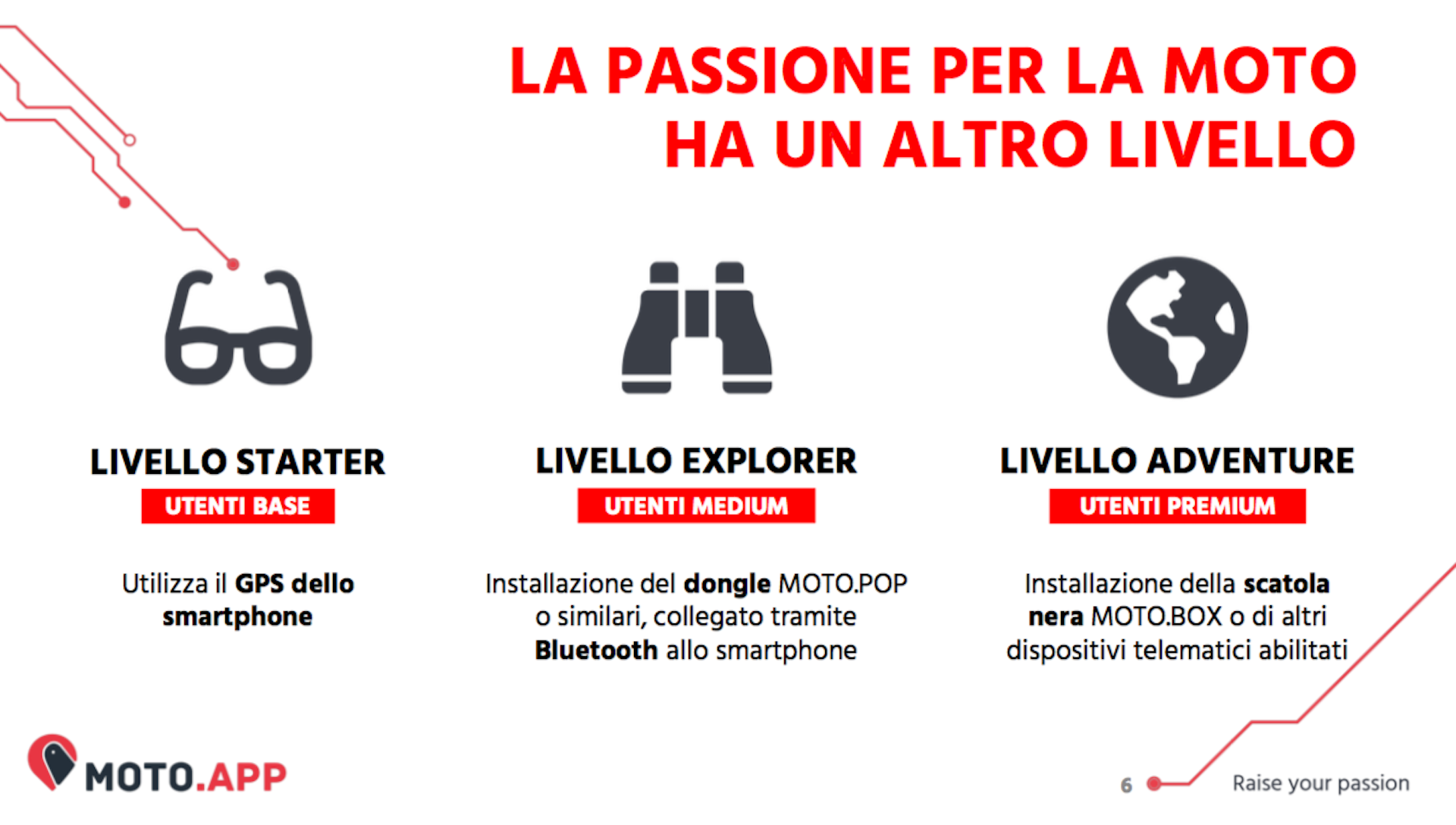 È un supporto che aiuta i motociclisti a guidare meglio e mira a diventare un punto di riferimento e condivisione: è la nuova Moto App, lanciata da Confindustria ANCMA, l’Associazione Nazionale Ciclo, Motociclo e Accessori. Sviluppata dalla milanese B2C Innovation, è la prima in Italia che permette di registrare itinerari, monitorare e condividere con altri appassionati informazioni e tenere sotto controllo la qualità del manto stradale. Come? Attraverso Moto App gli utenti possono fotografare le buche, che saranno geolocalizzate sulla mappa cittadina in modo da avvisare gli altri motociclisti.Come funzionaSi accede a Moto App dopo averla scaricata gratuitamente da Apple Store e Google Play, quindi ci si iscrive inserendo i dati personali, la targa della moto o dello scooter; successivamente si seleziona l’allestimento della moto e si carica una foto. I veicoli dello stesso motociclista vengono associati a Moto App, che riconosce se i veicoli stessi siano dotati di un dispositivo telematico, suddividendo gli utenti tra Starter, Explorer e Adventure.