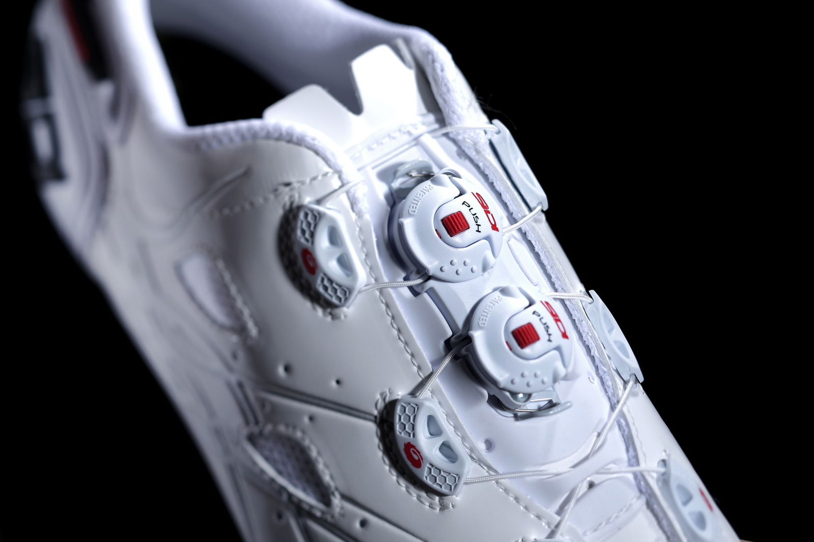 Degna di nota la dislocazione dei rotori Techno 3 Push, deputati a regolare l’intensità della chiusura, posti al centro della tomaia e quindi in grado di lavorare in modo simmetrico. Interessante il sistema di ritenzione posteriore (tallone tecnico regolabile Reflex) che permette di modulare il livello di avvolgimento del tallone. Non manca la possibilità di sostituire il tacco in gomma, soggetto a usura. Le Shot sono in catalogo nelle misure da 40 a 48 e in cinque colorazioni: bianca, nera con inserti bianchi, giallo fluorescente, azzurro, bianca con inserti rossi; le ultime due non sono disponibili in Italia. Il prezzo è di 389 euro. IL GIUDIZIO DI REDChiusura TECNO-3 PUSH SYSTEMI tre punti di aggancio sulla tomaia e le due leve di regolazione consentono di raggiungere un connubio molto efficace tra scarpa e piede. L’estesa modularità del meccanismo di chiusura permette di trovare il livello ottimale di tensione e di modificarlo agevolmente durante l’uso. Basta infatti agire sui pulsanti laterali oppure sui due rotori per allentare o aumentare la tensione di chiusura.Rispetto a modelli Sidi precedenti, risalenti a qualche anno fa e ampiamente diffusi tra i ciclisti, per intenderci quelli con la leva all’altezza del collo e i due strappi in velcro sulla parte anteriore, sulle Shot la sensazione della calzata è molto diversa e decisamente migliore. La tomaia aderisce perfettamente al piede, mantenendolo fermo in qualsiasi condizione di spinta, senza tuttavia comprimerlo.