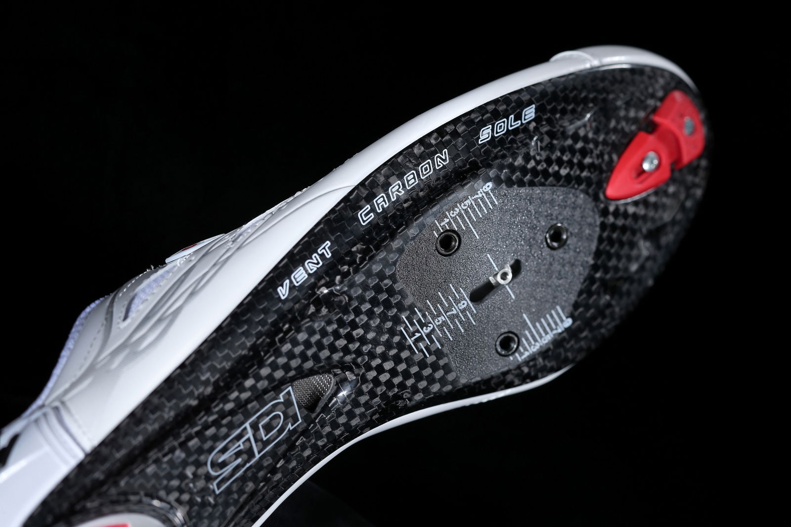 Suola VENT CARBONLa rigidità della suola si avverte fin dai primi minuti d’uso. Spingendo sui pedali, seduto o fuori sella, la sensazione è che la spinta sia particolarmente efficace e diretta. Merito della suola, che non si deforma, senza per questo essere troppo penalizzante in termini di comfort. Meno efficace, o quanto meno difficile da avvertire, è il beneficio che dovrebbe arrivare dal sistema di ventilazione e dispersione del calore. Sono presenti due prese d’aria al centro e nella parte frontale della suola, collegate ad appositi canali di aerazione. La presa d’aria frontale può essere aperta o chiusa agevolmente con l’ausilio di un cacciavite. Tuttavia, al variare delle condizioni meteorologiche e di temperatura, è davvero difficile avvertire differenze.