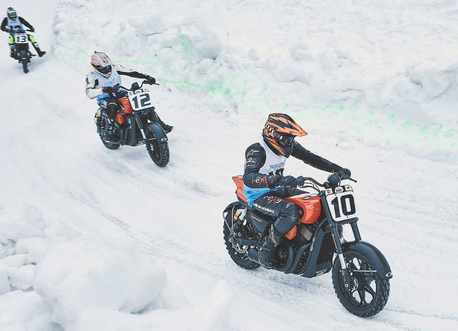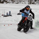 Morale, ho chiuso secondo assoluto con subito dietro Negri e poco dopo Zaffaroni. In sostanza tre italiani nei primi quattro non è male, per il nostro importatore, su sedici partecipanti. Inutile dire che se Xaus non fosse caduto sarei arrivato terzo, ma queste sono le gare. Mi sento di ringraziare Snow Quake, Deus Italy, Giacomo Marzoli e Simona Bendotti di Harley-Davidson Italia per il supporto live e in differita, come pure il tifo da lontano di Bob Lonardi, Responsabile Comunicazione H-D. Inoltre, chiedo scusa a un avversario di cui non ricordo il numero di gara, al quale ho involontariamente (giuro) dato una sportellata nelle prime battute della prima batteria al mattino, dopo una delle mie pessime partenze: non è nello spirito Snow Quake e quindi mi spiace, ma veramente non ho fatto apposta. E ora cerchiamo di scoprire chi è questo outsider che ha spiazzato tutti: Ruben a un certo punto, a cena mi fa: “Oh, sono andato a vedere chi è sul profilo Instagram… ho capito tutto, chiedigli se per lui è la prima volta sul ghiaccio, vedrai”. Così, durante la cena celebrativa al Deus Café di Milano, con il sottoscritto alla soglia dei 39 di febbre, chiediamo al vincitore se avesse precedenti esperienze specifiche. E lui, candidamente, dice ammiccando: “Abito nello Stato di New York e dove vivo mi sono fatto una pista di ghiaccio fuori casa, perciò sono piuttosto allenato”. Ok. Se non altro, nessuno di noi deciderà di appendere il casco al chiodo, Xaus, in primis, che sembrava quasi rassicurato dalla risposta dell’arrembante ma onesto American boy.MA ‘STA HARLEY COME VA?Il motore High Output Revolution X 750 si è rivelato portentoso e la moto, così messa a punto, consente prestazioni anche su ghiaccio inimmaginabili pensando alla sua mole originale e alle condizioni di aderenza a dir poco precaria. Ciclistica ok, l’assenza del freno anteriore (nel flat non si usa), per chi non è abituato all’inizio crea scompiglio sugli automatismi nella fase di frenata in prossimità delle curve. Come tutte le cose richiede assuefazione, ma poi diventa una caratteristica propedeutica alla tecnica di guida specifica, in quanto bisogna arrivare a entrare in curva scalando, più che frenando, onde favorire il pattinamento della ruota posteriore, per poi gestire il tutto con il gas. Imbottitura sella praticamente quasi inesistente, ma in comfort qui non conta e pedane in posizione un po’ innaturale ma poi ci si adatta anche a quelle. Unico appunto: personalmente avrei sicuramente montato un manubrio molto più largo: la piega scelta a mio parere è poco favorevole alla guida, specialmente considerando il peso della moto. Il resto… sublime.