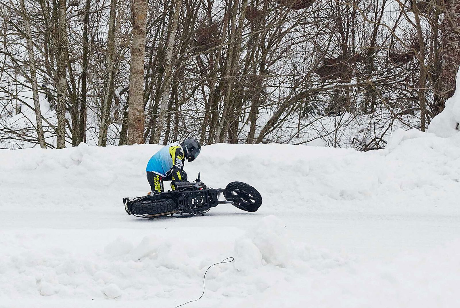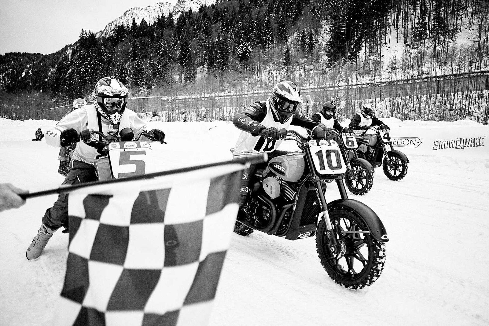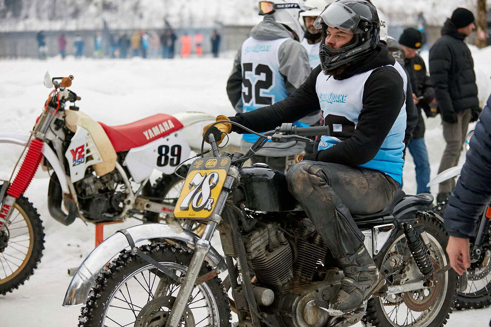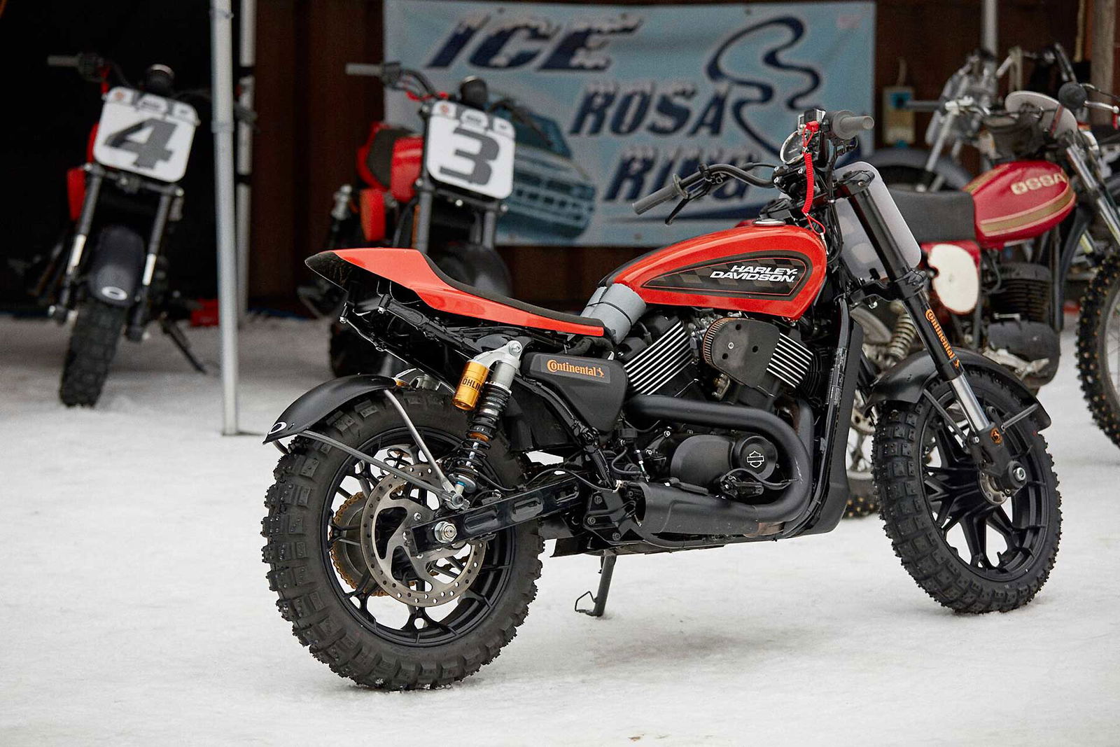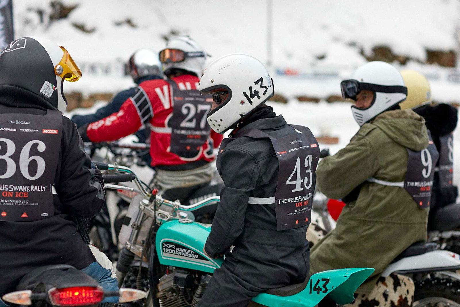 “Sì, ma tranquillo, zero pressione, c’è solo da andare a divertirsi!” Credici. Gli faccio notare che lui stesso non ha questo approccio neppure per andare a prendere il cappuccino al bar. Totalmente inutile. “Ma poi, tu non avevi mica vinto la categoria Inappropriate l’anno scorso?” Come dire, la richiesta con l’adesione integrata propria di chi sa di essere piuttosto convincente.Capito, vado. Allora, mi ritrovo la sera del 16 gennaio, come sempre trattato come un principe da Harley-Davidson Italia (grazie) in un bell’alberghetto a Riva Valdobbia, a 200 metri dall’Ice Rosa Ring, un impianto invernale permanente dove si svolgono varie attività anche con le auto. Arriva il mattino che in questa stagione nelle prime ore è a dir poco tetro, ma è il momento di alzarsi. Una fatica cane: avendo i brividi influenzali in corso già dentro nel letto, l’idea di uscire e buttarmi in quell’inferno glaciale, è in assoluto l’ultima cosa che vorrei fare in quel momento, ma l’impegno è preso e va rispettato. Poi mi conosco e so che “a caldo” mi scatta quello che serve. Diciamo che il cielo grigio con il nevischio nell’aria non sono stati di certo effetti motivanti. Comunque, giunto sul posto ritrovo subito la bella atmosfera della Snow Quake, format inventato da Deus Ex Machina Italia e ceduto quest’anno a Sideburn. C’è allegria e agonismo scanzonato. Ma non troppo… perché alla fine una gare è sempre una gara. Vabbè, mi butto, non ho niente da perdere, a parte la salute.LA MOTO
