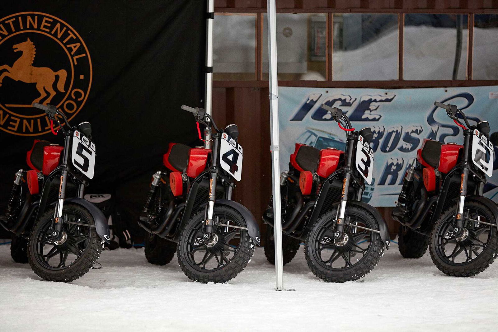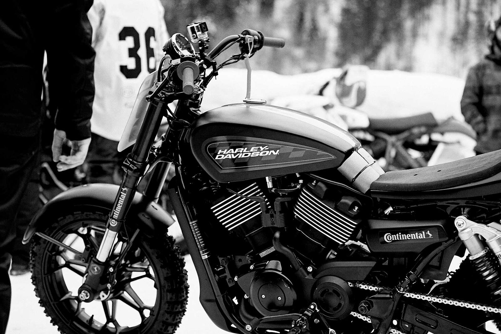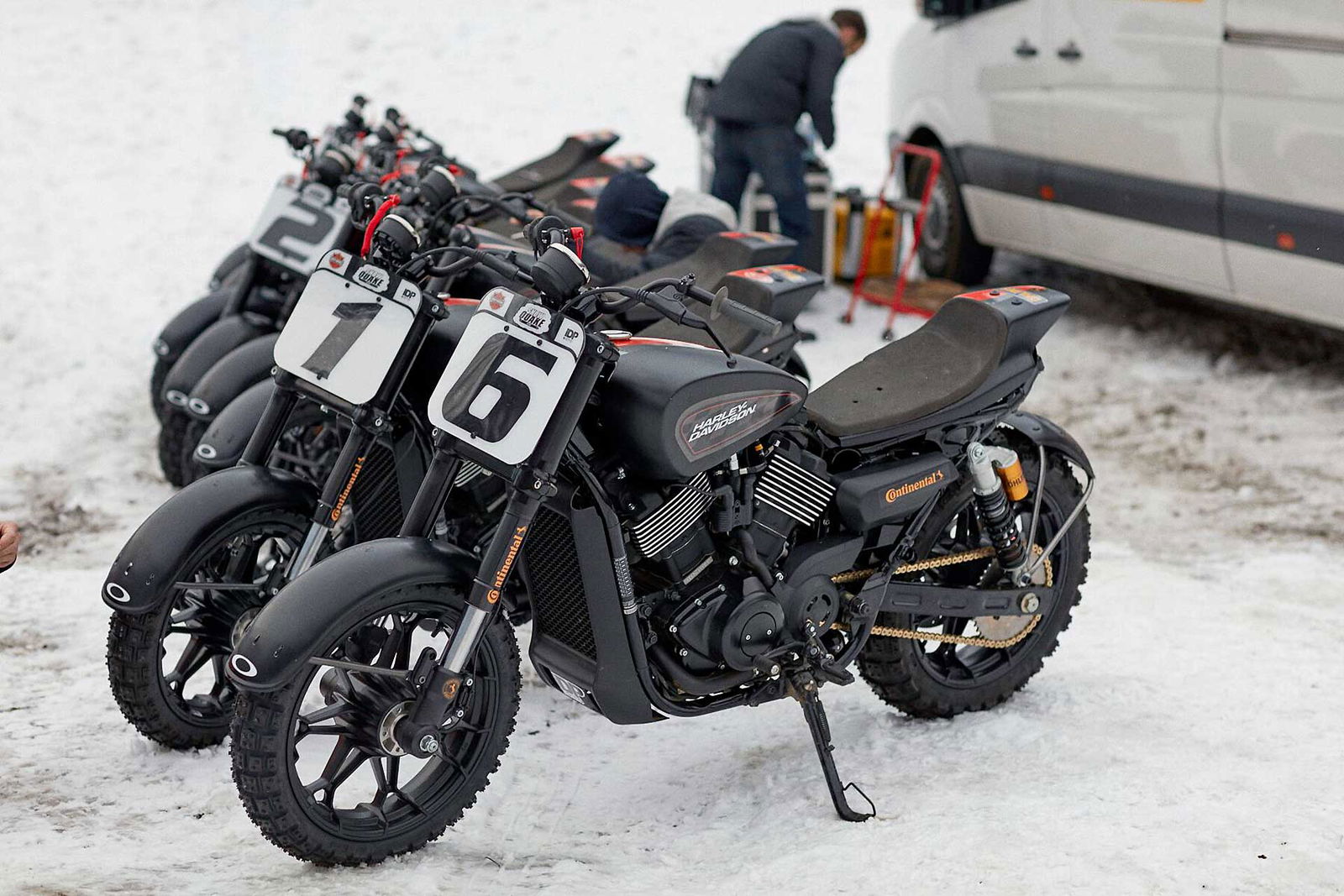 Le moto sono state realizzate da IDP Moto ed equipaggiate con pneumatici Continental TCK80 dotati di 500 chiodi, protezioni per le entrambe le ruote, conversione della trasmissione da cinghia a catena e una serie di modifiche di dettaglio che includono lo switch di spegnimento di sicurezza con il cavo a sgancio magnetico fissato al polso destro del pilota. In realtà la base di partenza è quella delle moto usata per la gara la gara Harley-Davidson Hooligan STT International Invitational Flat Track svoltasi in occasione della European Bike Week di Faaker See, in Austria, lo scorso mese di settembre.COME È ANDATAPartecipanti 15 + 1. Si intende che oltre ai 15 selezionati (di cui cinque italiani) per partecipare alla gara, si aggiunge l’ex pilota Superbike Ruben Xaus che aveva precedentemente sviluppato la versione da Flat Track sull’impianto di Andorra dove lo spagnolo gestisce varie scuole e attività motociclistiche ad alto livello. Così, con la sua dovuta tabella numero 1 si presenta al via delle batterie mattutine dimostrando sin da subito di avere immediata confidenza con la moto, che sommata al suo palmares, lo rendono il favorito d’obbligo del challenge. Io non sono in forma, ma regagisco e mi faccio forte del fatto che le batterie eliminatorie sono su soli tre giri, perciò la debilitazione fisica non dovrebbe più di tanto emergere. Arriva il mio turno, mi schiero con il numero 10 e nelle prime due batterie ho difficoltà a trovare il modo giusto di partire: sia con la prima marcia che con la seconda sono infatti rimasto un po’ al palo nelle prime due “pre” manche: fortunatamente riesco a concluderle ugualmente al comando, dopo buoni recuperi. Nella batteria eliminatoria vera e propria non posso più sbagliare lo start, quindi mi impongo di dare veramente poco gas, anche perché facendo mente locale e osservando le partenze delle altre gare ho notato che con quel tipo di chiodatura delle gomme, premia lo start meno irruente.