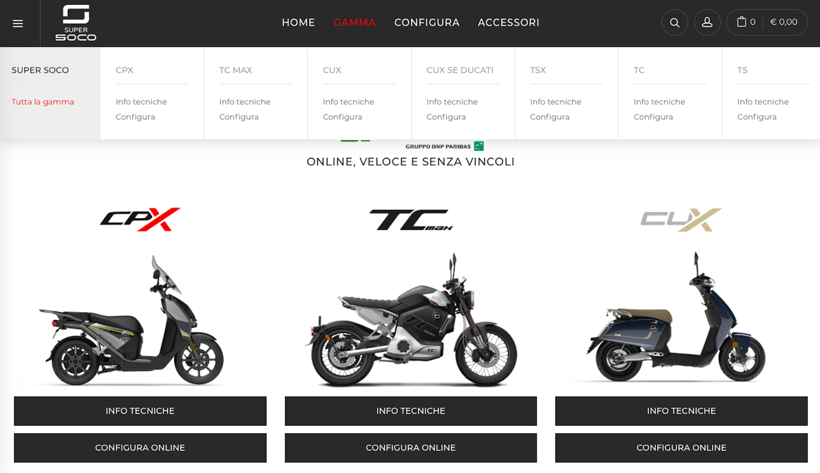 Il nuovo canale online di Super Soco punta a offrire un supporto anche alla rete dei suoi negozi. La moto o lo scooter acquistati, attraverso una procedura che accompagna l’utente passo dopo passo, potranno essere recapitati a domicilio o, appunto, presso un punto vendita scelto dal cliente.Capitolo metodi di pagamento. I modelli elettrici Super Soco si potranno acquistare pagando con carta di credito o bonifico in un’unica soluzione oppure a rate, da 3 a 60. Se si opta per quest’ultima soluzione, in fase di finalizzazione dell’acquisto sarà visualizzata una proposta di finanziamento redatta in collaborazione con Findomestic.