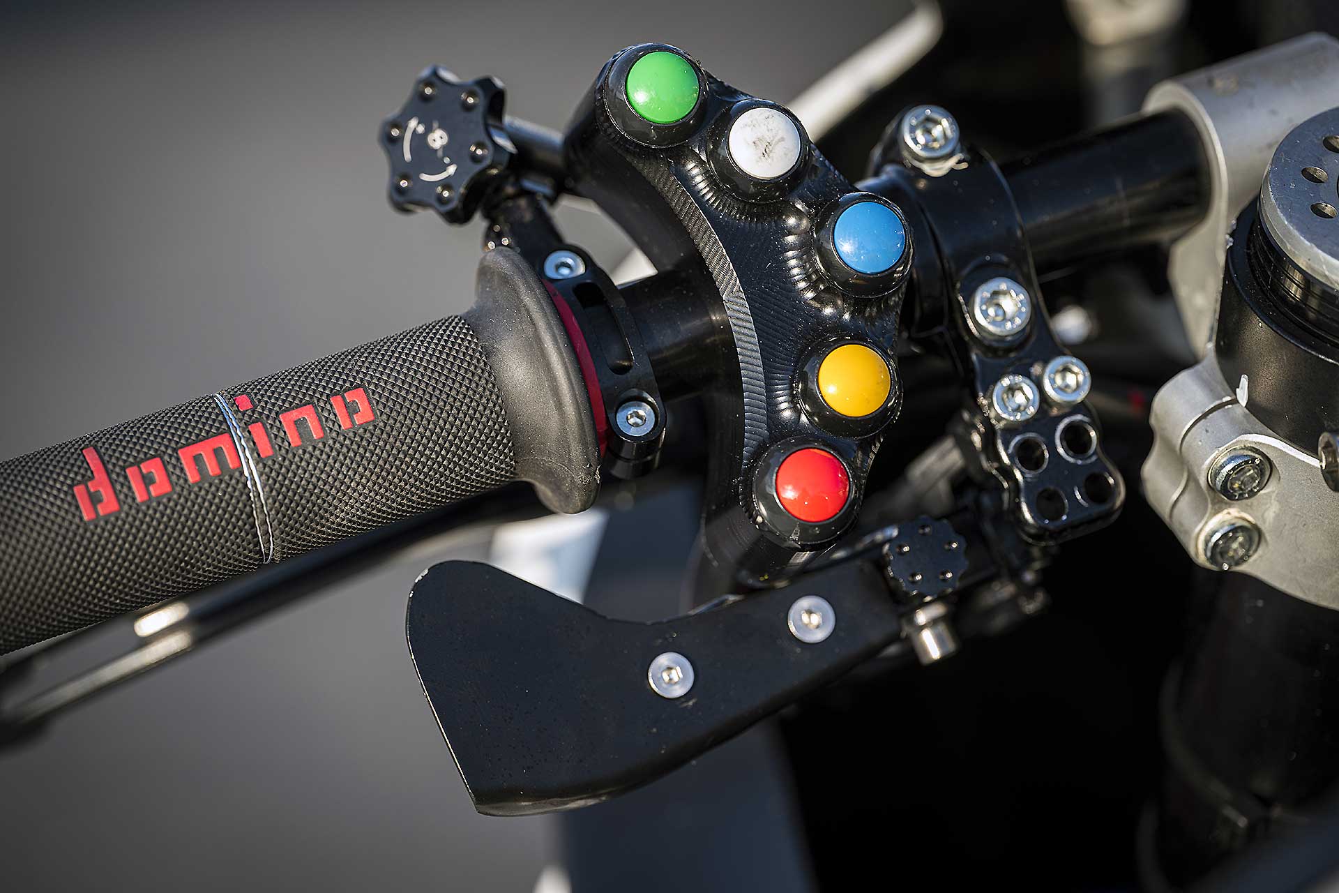 Poi arriva il momento della moto da gara che non è un altro mondo, ma anche sì. Nel senso che è facile riconoscere ogni cromosoma della moto da cui deriva, ma è altrettanto facile comprendere quanto il lavoro su assetto ed elettronica riesca a cambiare di molto il temperamento della moto. Ovviamente è più rigida, altrettanto ovviamente è più alta, tutta più alta, il che si traduce in una velocità di esecuzione di parecchio aumentata. I manubri sono aperti come giustamente devono essere su una moto da corsa le pedane per me ottime (strano perché Giannini è più alto di me) e l’impatto sotto agli occhi e quello super professionale del display racing e di una pulsantiera che sembra di essere su una MotoGP.