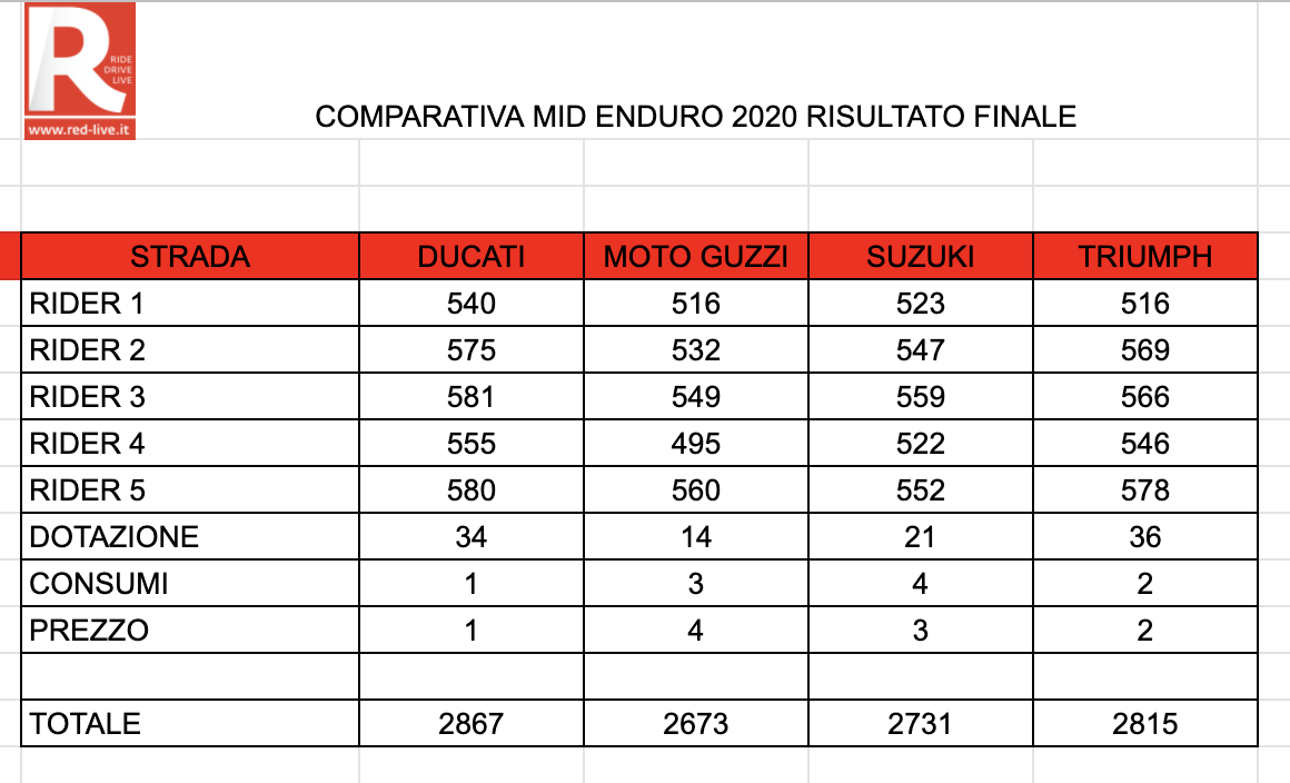 Sapete che nelle nostre comparative cerchiamo di mischiare le carte quanto più possibile. Misceliamo bene i percorsi: dall’autostrada al passo di montagna, per un totale in questo caso di oltre 700 km. E mescoliamo i tester, scegliendoli di capacità, altezza, peso e gusti motociclistici differenti. Questo per avere un responso quanto più possibile aderente alla realtà. Come ormai prassi per le comparative di RED, ogni tester ha votato a scrutinio segreto, assegnando un punteggio in trentesimi a tutte le voci in tabella. Ai voti dei tester sono sommati i punti della dotazione, che è stata valorizzata due punti per un elemento di serie, un punto se disponibile a pagamento, zero punti se assente. Il consumo? Importante per moto che vogliono viaggiare a lungo: ecco perché abbiamo assegnato più punti a quella che ha consumato meno. Comunque va sottolineato che tutte le moto del confronto non sono molto assetate. Stesso discorso per il prezzo. Tutto questo ha composto il punteggio finale.