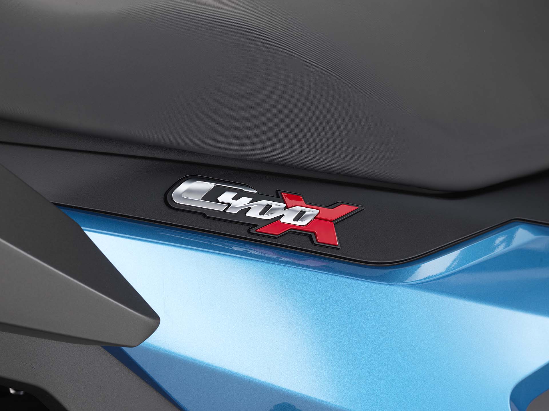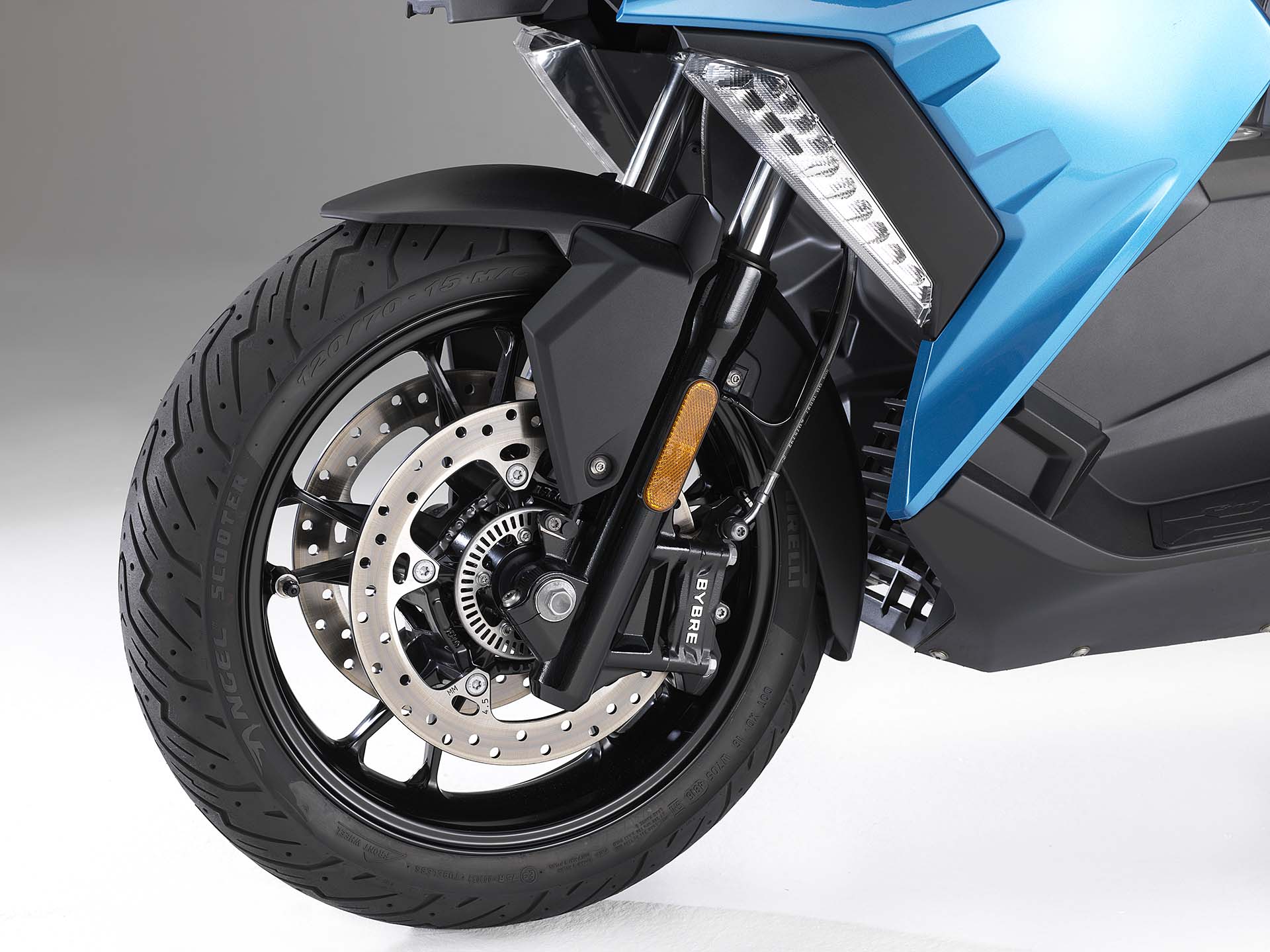 Il telaio, anch’esso disegnato ex-novo, è in tubi di acciaio con piastre di ghisa nella zona di infulcro del forcellone, vincolato con un inedito leveraggio. L’interasse misura 1.565 mm, l’angolo sterzo 26,4° e l’avancorsa 81 mm, valore degno di una motocicletta sportiva. E proprio al mondo moto fa riferimento la triangolazione sella/pedane/manubrio, cui si deve una posizione di guida “attiva”, e la distribuzione dei pesi 50-50, il punto di arrivo per ogni scooter che si voglia definire sportivo.Capitolo sospensioni. Il comportamento dell’avantreno è affidato a una forcella con steli da 35 mm ed escursione di 110 mm, mentre dietro lavora una coppia di ammortizzatori da 112 mm, tarati sia per assicurare comfort e stabilità sia per consentire di ospitare passeggero e borse.Notevole la dotazione in tema di freni, con all’anteriore due dischi da 265 mm con pinze radiali ByBre a quattro pistoncini e al posteriore un disco singolo da 265 abbinato a pinza con un pistoncino. L’ABS, che pesa solo 700 g, è Continental con controllo indipendente dei due circuiti. Da ultimo, le ruote: i cerchi, in lega, sono da 15″ davanti e 14″ dietro (misura che ha permesso di dotare il vano sottosella del sistema Flexcase, così da ospitare due caschi di cui uno integrale), per gli pneumatici la scelta è caduta rispettivamente su 120/70 e 150/70.La connessione che non c’era
