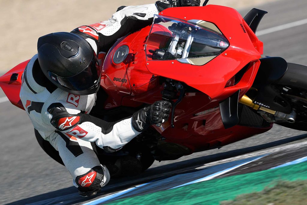 Lato ciclistico ho trovato una Panigale molto rassicurante come era la 2020, però ho percepito una maggiore velocità nella discesa in piega. Forse ha fatto un piccolo passo indietro quanto a sensazione di moto “piantata a terra” ma la 2020-2021 era così stabile che perdere una piccola percentuale di questa stabilità in favore di una maggiore rapidità nell’andare alla corda è per me un passo avanti. Così come lo è il comportamento della forcella, che grazie alle molle più morbide offre una miglior capacità di copiare l’asfalto, gradita soprattutto in percorrenza, quando senti sempre molto bene quello che accade sotto la ruota anteriore. I 5 mm di extra corsa aiutano a mantenere il feeling anche nelle frenate più profonde come quella alla curva 6 di Jerez (il tornante dopo il lungo rettilineo), dove peraltro la Panigale V4 mette in mostra una formidabile capacità di rallentare, permettendo di scalare 5 marce di fila a una velocità che nessun’altra moto sportiva riesce nemmeno ad avvicinare per poi buttarsi alla corda alla velocità della luce, mantenendo intatta la stabilità in frenata con al massimo un gasante slide controllato in ingresso.